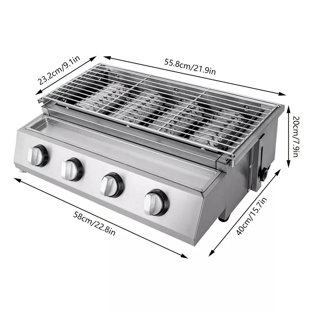 Description Name: 4 Burners Gas BBQ Grill Dimension: 575*425*200mm Shield material: Steel shield Intensity of Pressure: 2800Pa Color: Stainless Steel Grill Size: 560*250mm Weight: 8.5kg Feature 1. Environmental and smokeless 2. No fire, more safer 3. Keep the original taste 4. Adjustable height Package: 1*4 Burners Gas BBQ Grill Gas BBQ Grill Stainless Steel Outdoor Camp Picnic Barbecue Shish Kabob 4 Burner Notes: 1.Please Use LPG Gas (Liquefied Petroleum Gas). Gas hose not included! 2.This Machine Is Prohibited To Use Medium And High Pressure, Only Low Pressure Valve Can Be Used. 3.Please Prepare 2800Pa Low Pressure Valve And Gas Hose(Not Included). Because The Requirements And Standards Of Each Country Are Different, Customers Need To Purchase Them Locally. (Gas Hose Diameter: About 1cm/0.39in). Description Name: 4 Burners Gas BBQ Grill Dimension: 575*425*200mm Shield material: Steel shield Intensity of Pressure: 2800Pa Color: Stainless Steel Grill Size: 560*250mm Weight: 8.5kg Feature 1. Environmental and smokeless 2. No fire, more safer 3. Keep the original taste 4. Adjustable height Package: 1*4 Burners Gas BBQ Grill Notice: 1.Machine Only, low pressure valve and hose are not equipped. 2.Usually need to use LPG, natural gas can also be used but the nozzle needs to be changed (please look for a professional hardware store). Gas inlet:8mm (inner) / 10mm (outer). 3.This machine is forbidden to use medium and high pressure, only low pressure valve can be used. Payment Delivery details Terms of sales About us Contact us Payment We accept ebay payment 。 Fees such as import duties, taxes are not included in the item price or shipping costs. These charges are the buyer's responsibility. Delivery details Shipping: 2-9 working days to: USA Terms of sales We maintain high standards of excellence and strive for hundred percent customer satisfaction. Feedback is very important to us. We hope that you contact us immediately before you give neutral or negative feedback, so that we can address your concerns. It is impossible to address issues if we do not know about them! About us Your satis faction is our ultimate goal. We work hard to earn your trust and future business. Our certified technicians have tested each item before shipping. The unit comes with 1 year limited warranty on all manufacturing defects. a) If you receive a defective item, you may return it or ask for a discount. Please contact us within 14 days after you receive the package. b) What you returned must be intact and in its original packaging as re? u. Customer is responsible for shipping costs of the returned item. c) We will cover the cost of shipping back t with the shipping rate indicated in the registration page. We will send you a new unit or refund the full payment you paid. Thank you. Contact us Business Hour Business Hour: Monday To Friday: 8:30 AM to 5:00 PM (Beijing China time) Due to time zones, our reply to your questions may not be immediately. But within above working time, we will reply your email within 24 hours. If it's non-workdays, please kindly be patient and wait till Monday. Please contact us with ebay message. Please feel free to contact us if you have any questions. Monday To Friday: 8:30 AM to 5:00 PM (Beijing China time) Due to time zones, our reply to your questions may not be immediately. But within above working time, we will reply your email within 24 hours. If it's non-workdays, please kindly be patient and wait till Monday. Please contact us with ebay message. Please feel free to contact us if you have any questions. Notice Can not ship to Puerto Rico,Alaska/Hawaii Brand Unbranded Type Grill/Smoker Combination Unit Number of Burners 4 Name 4 Burners Gas BBQ Grill Dimension 575*425*200mm Shield material Steel shield Intensity of Pressure 2800Pa Color Stainless Steel Grill Size 560*250mm Features Environmental and smokeless, No fire, more safer, Adjustable height Material Stainless Steel Item Weight 8.5kg Fuel Type LPG Gas Item Height Does not apply Item Width Does not apply Item Depth Does not apply Assembly Required No Finish Does not apply MPN Does not apply EAN Does not apply UPC Does not apply ISBN Does not apply