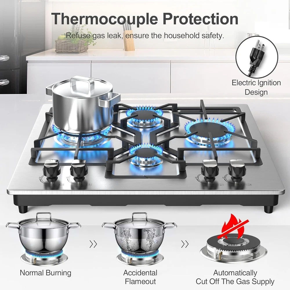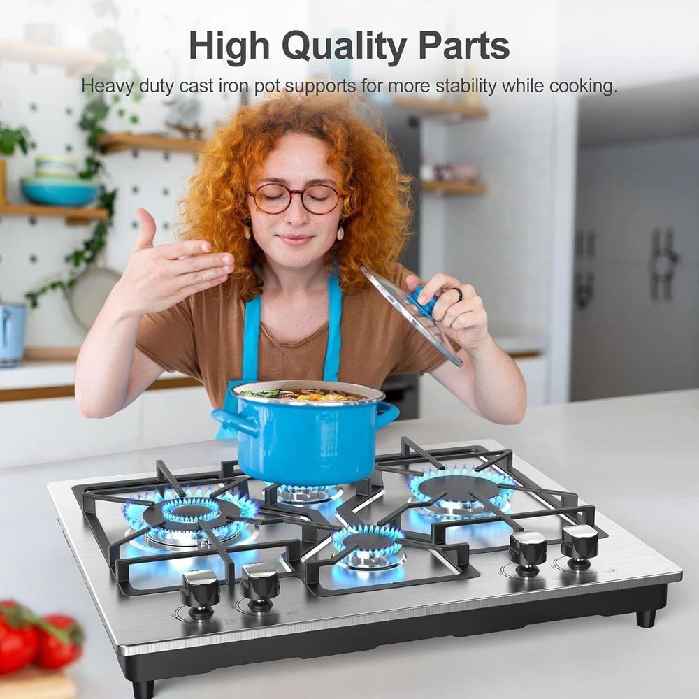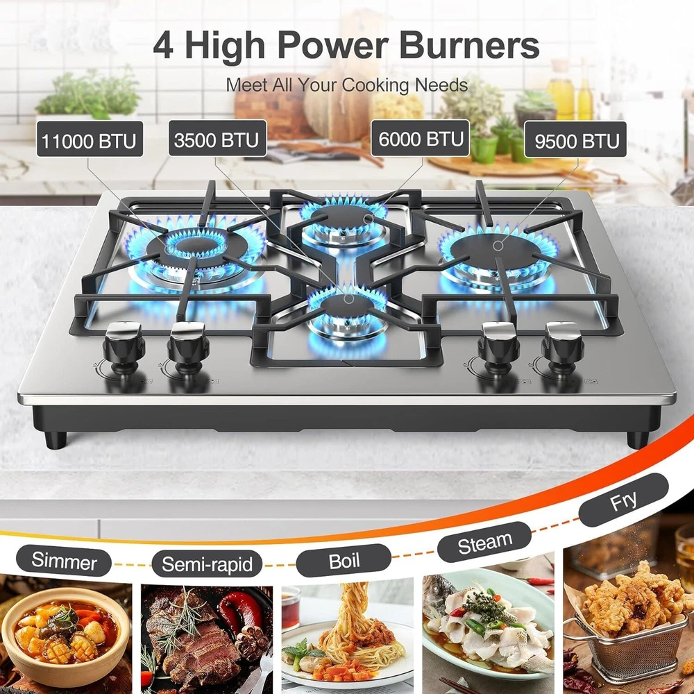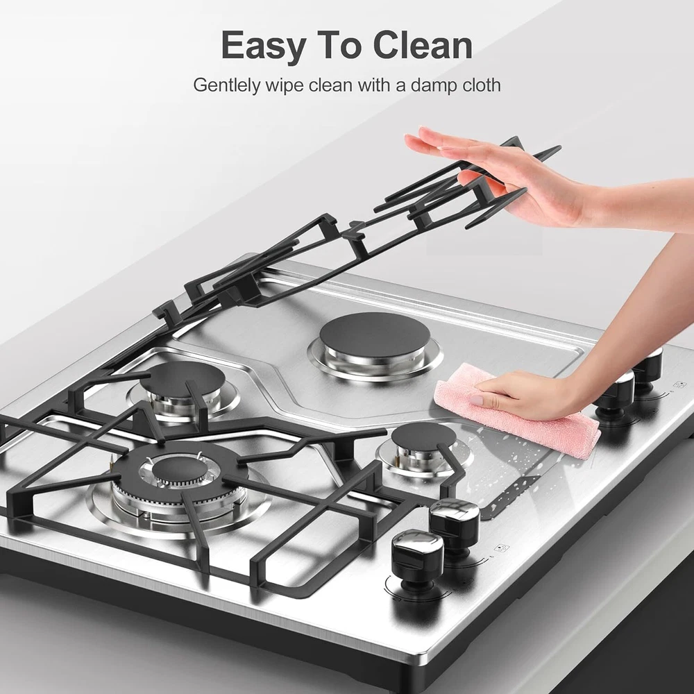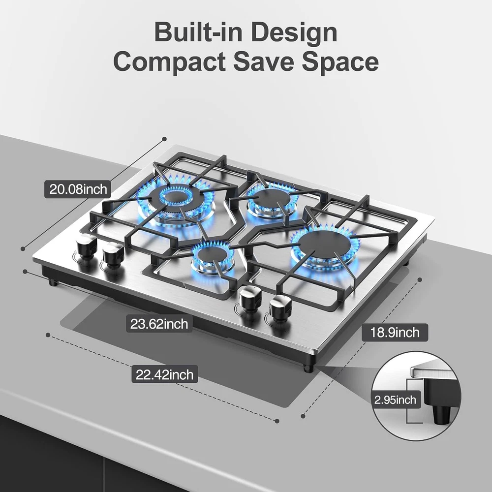 Discover Culinary Mastery with the 4-Burner Gas Cooktop: Unleash the power of precision cooking with our 4-burner gas cooktop, boasting a total power of 30000 BTU (11000BTU+9500BTU+6000BTU+3000BTU). Crafted for culinary enthusiasts, this appliance features 4 metal control knobs for meticulous adjustments, including a large burner with inner and outer flame rings for even heat distribution. Premium Build for Exceptional Performance: Designed with durability in mind, the surface of this propane gas burner is made of heat-resistant, corrosion-resistant stainless steel. The heavy-duty cast iron grate ensures stability, withstanding the rigors of daily use without deformation. Safety & Convenience Redefined: Prioritize safety with our dual-fuel gas stove, equipped with a thermocouple flame failure system (FFD) that automatically shuts off the gas when no flame is detected. Specifically designed for both NG and LNG, the default setting suits natural gas, and an additional LPG nozzle is included for versatility. The 110-120V AC power plug, coupled with automatic electric pulse ignition, guarantees faster and more stable performance. Versatile Placement Options: With dimensions of 23.23" x 20.08" x 2.76", and built-in dimensions of 22.04" x 18.89", this gas cooker seamlessly fits into various spaces, from RVs to kitchens and apartments. Ensure the size aligns with your needs for optimal use. Choose for Reliability: Opt for the trusted brand, , and experience unparalleled service. We stand by our commitment to providing the best service, backed by a one-year warranty and 24/7 after-sales support. Important Notices: After successful installation, conduct a leak test and ensure use in a well-ventilated place. Avoid using on wooden tables or tabletops covered with tablecloths to prevent high heat and spontaneous combustion. Elevate your cooking experience with the 4-Burner Gas Cooktop – where precision meets safety and durability. [ 4 High-Efficiency Gas Burners ]: This gas cooktop 4 burners has a total power of 30000 BTU (11000BTU+9500BTU+6000BTU+3000BTU). It is equipped with 4 metal control knobs for precise adjustment. One of the large burners has inner and outer flame rings for more even heat distribution. You can use it to fry, simmer, steam, boil, and melt all kinds of food simultaneously for the ultimate culinary ! [ High Quality Materials ]: The surface of this propane gas burner is made of stainless steel, which is heat-resistant, corrosion-resistant, and easy to clean. The stovetop is equipped with a heavy-duty cast iron grate, which is ultra-sturdy and will not deform. [ Safety & Convenience ]: This dual-fuel gas stove is equipped with a thermocouple flame failure system (FFD), which will automatically shut off the gas when no flame is detected, avoiding gas leakage and ensuring the safety of you and your family. It is specially designed for NG and LNG, the default setting is suitable for natural gas, and the accessory contains an additional LPG nozzle. Using a 110-120V AC power plug, automatic electric pulse ignition is faster and more stable. [ Use It Anywhere ]: Dimensions of this built-in gas cooker: 23.23" x 20.08" x 2.76". Built-in dimensions: 22.04" x 18.89". Perfect for RV, kitchen, and apartment. Make sure this gas stove is the right size for you. [ Choose Us ]: Choose to trust , we promise to provide you with the best service, a one-year and provide 24/7 after-sales service. [ Notice ]: Please do a leak test after successful installation, it should be used in a ventilated place. Do not use on wooden tables or tabletops covered with tablecloths as this will result in high heat and spontaneous combustion.