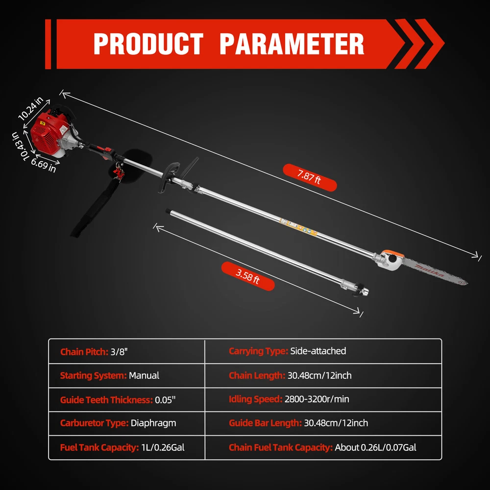 Engine Model: 1E40F-5A Material: Aluminum Alloy, Manganese Steel, PP Plastic Engine Power: 1.25kw/6500-8500rpm Engine Type: Air-cooled, Two-stroke, Single-cylinder Gasoline Engine Engine Displacement: 42.7cc Carburetor Type: Pump-film type Idling Speed: 2800-3200r/min Fuel Tank Capacity: 1L/0.26gal Gasoline / Circulating Oil Mixing Ratio: 20-25:1 Starting System: Manual Starter Length: 240cm-350cm/94.48-137.79in Guide Bar Size: 30.48cm/12 in Chain Pitch: 0.95cm/0.375in Chain Size: 0.05P Packing Size: 110*29*29cm/43.3*11.41*11.41in Carrying Type: Side-attached Net Weight: About 11kg/24.25lbs Gross Weight: About 12kg/26.45lbs 1x Gas Trimmer 1x Extension Pole 1x Carrying Strap 1x Screwdriver 1x Goggles 1x Fuel Proportioning Tank 1x Funnel 1x Tool Bag12" 42.7CC 2-Strok Gas Trimmer Saw Tree Trimmer Chainsaw Gas Powered Pole Saw Pruner Pruning Description Description Do you still have trouble trimming high branches? The pole chainsaw with a two-stroke engine has strong power, and the hard guide chain and guide plate can quickly cut through tree branches. The long enough pole as well as the strap design allows you to easily trim high branches without having to risk standing on high ground, making your pruning job safer. Key Features Good Durability : It is mainly made of high-quality aluminum alloy, manganese steel, and PP. These materials are not easy to deform and rust, therefore, it has a long service life and you can use it with confidence. Powerful and Efficient : The 1.25kw high-power, 6500-8500rpm high-speed two-stroke engine can provide strong cutting power for it. The sharp manganese steel chain and guide plate enable quick cutting of tree branches. It has a wide cutting range and high work efficiency with a maximum cutting diameter of 11.81 inches. Stable Engine: The excellent air-cooled cooling system and dense cooling holes can dissipate heat and cool down the engine in time. Moreover, the air filter helps to filter impurities in the air and reduce the wear and tear of dust and sand on the engine, which can achieve stable machine operation. Long Endurance Time: Its fuel tank is capable of holding 0.26 gal of fuel, which is a huge capacity. This gives the chainsaw a very long endurance time without frequent refueling. High Safety : It can only be activated by pressing both switches simultaneously, which can prevent accidental touch of the throttle switch. The push-button flameout switch also makes it safer for you to use. Convenient To Use: The detachable long pole makes it easy for you to store and carry. It can reach 7.87-11.48ft in height with the long pole attached, and the comfortable strap design allows you to use it with less effort, so you can easily cut high branches from the ground, which is very practical and convenient. Easy to Install : It has a simple structure and comes with detailed installation and operation instructions, allowing you to quickly install and operate it. Protective Package: To prevent the product from being damaged and bumped during transportation, we packed it with foam to protect your products to the maximum extent possible. Customer Service: Communication is the best way to solve problems. If you have any problems, please feel free to contact us. We will reply and solve the problem for you as soon as possible. Details Adjustable Handle : The ergonomic handle can be adjusted in position and angle at will by loosening the screws, so you can adjust it to a suitable position for use according to your height and arm length, making it more convenient to use. Start Handle: The anti-slip handle is easy to pull, making the machine start more convenient and faster. Quick Connector: The easy-to-use connector allows for quick disassembly and assembly of the connecting rod, making it more convenient to handle. Application It is suitable for sawing high branches and small trees in gardens, farms, parks, forests, pastures, orchards, and so on. Specification Material: Aluminum Alloy, Manganese Steel, PP Engine Type: Air-cooled, 2-stroke, Single-cylinder Engine Power: 1.25kw Speed: 6500-8500rpm Engine Displacement: 43cc Carburetor Type: Diaphragm Idling Speed: 2800-3200r/min Fuel Tank Capacity: 1L/0.26Gal Chain Fuel Tank Capacity: About 0.26L/0.07Gal Fuel Ratio: 1 Engine Oil: 20-25 Gasoline Starting System: Manual Carrying Type: Side-attached Extension Rod Length: 1.09m/3.58ft Total Length of Product: 2.4m-3.5m/7.87-11.48ft Guide Bar Length: 30.48cm/12inch Chain Length: 30.48cm/12inch Chain Pitch: 3/8" Guide Teeth Thickness: 0.05'' Max. Cutting Diameter: 30cm/11.81inch Engine Size: 26*17*26.5cm/10.24*6.69*10.43inch Packing Size: 110*30.7*29.5cm/43.31*12.09*11.61inch Net Weight: 8.8kg/19.4lbs Gross Weight: 10.95kg/24.14lbs Package Included 1x Pole Chainsaw 1x Extension Pole 1x Back Strap 1x Screwdriver 1x Goggles 1x Fuel Mixing Bottle 1x Funnel 1x Auxiliary Handle 2x English Manuals Other Accessories for Assembly Notes Before use, it is necessary to add gasoline and two-stroke engine oil to the fuel mixing bottle and mix them thoroughly. After use, please pour out the fuel in the fuel tank, drain it, or burn the fuel in the carburetor to avoid clogging the carburetor. Please pay attention to safety when using this product. Do not put your hands on the guide plate chain when the machine is running to avoid being hurt. Please read the user manual carefully before use and pay special attention to the safety precautions included. Please allow the slight color difference caused by the shooting light and 1-3cm error due to manual measurement, and make sure you do not mind before ordering. Payment Delivery details Terms of sales About us Contact us Payment We accept ebay payment 。 Fees such as import duties, taxes are not included in the item price or shipping costs. These charges are the buyer's responsibility. Delivery details Shipping: 2-9 working days to: USA Terms of sales We maintain high standards of excellence and strive for hundred percent customer satisfaction. 