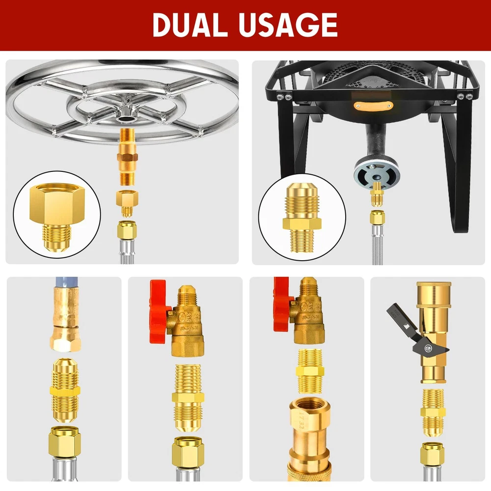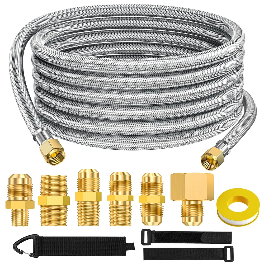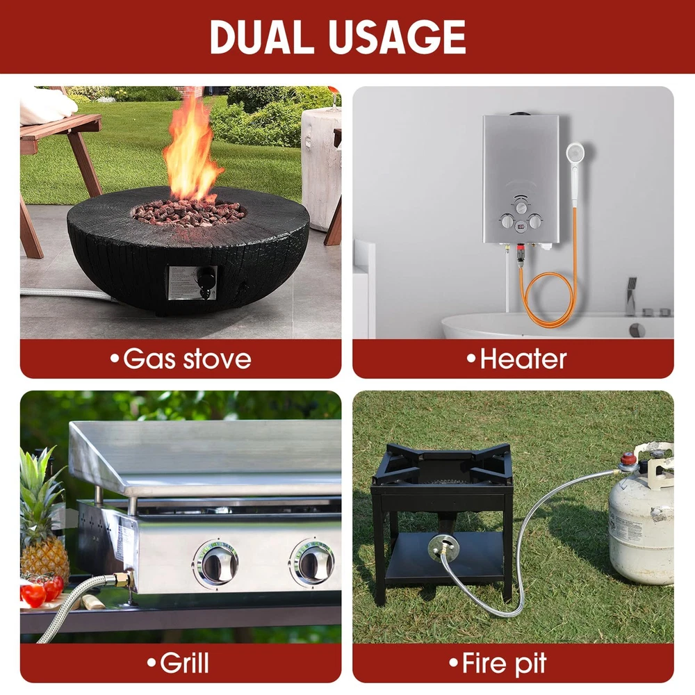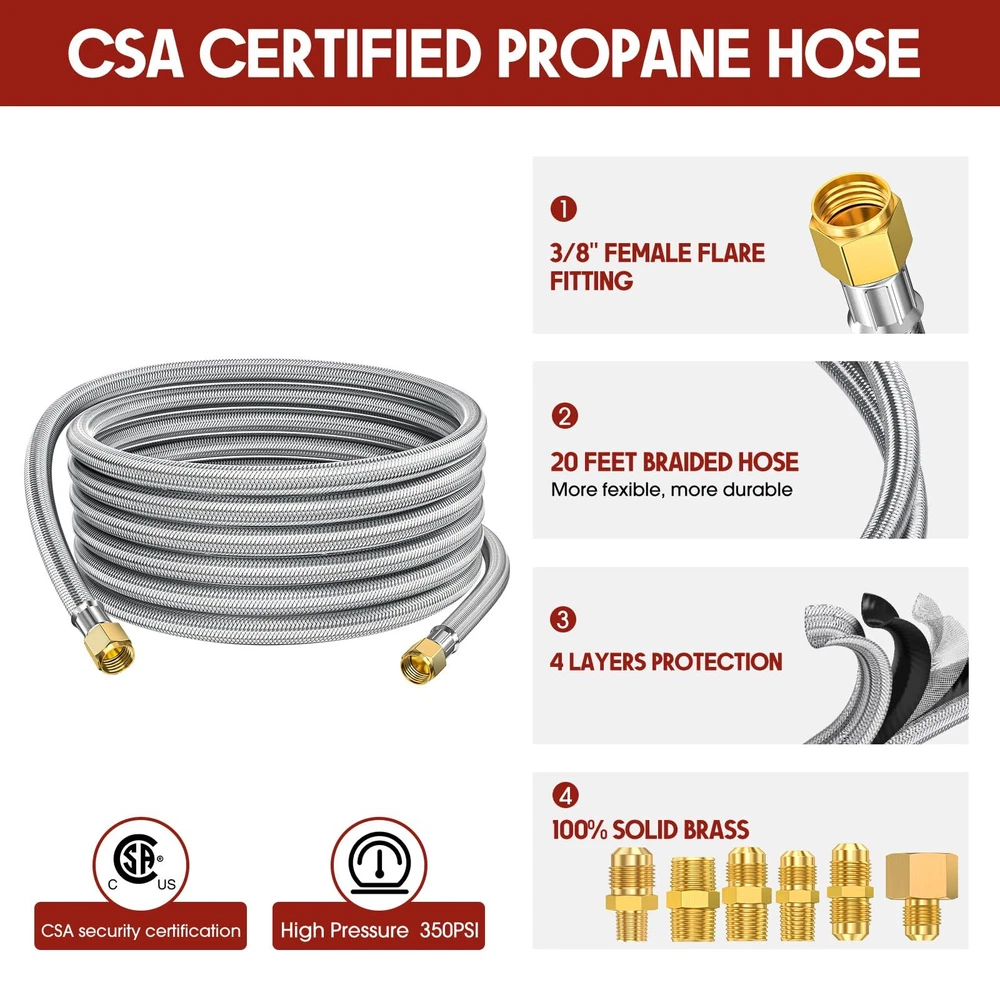 propane hose propane gas line propane hose extension propane line gas line hose lp gas hose propane extension hose 3/8 propane hose 120 gallon propane tank propane conversion kit propane heater extend a stay rv propane kit propane to natural gas conversion kit 3/4 gas flex line propane hose quick connect hose extension natural gas hose 30 lb propane tank propane quick connect hose quick connect propane hose propane hose adapter 1lb to 20lb rv quick connect propane hose long hose propane gas line propane conversion kit gas hose gas pipe lp gas hose natural gas hose propane hose gas line propane to natural gas conversion kit propane fire hose propane extension hose propane line 3/8 propane hose gas line hose rv propane hose gas grill parts propane tank hose replacement parts for gas grills rv grill grill parts high pressure hose propane fire pit kit outdoor heater replacement parts propane heater outdoor 3/4 gas flex line dryer gas line gas heater outdoor torch hose bbq torch 3/8 marine fuel line propane hose propane hose extension propane extension hose 3/8 propane hose propane hose quick connect propane gas line propane hose with regulator propane torch hose quick connect propane hose mr heater propane hose extend a stay rv propane kit propane fittings quick connect propane hose for rv to grill propane line rv propane hose lp gas hose hose extension gas line hose propane hose adapter propane fittings & adapters propane quick connect hose propane tree heated hose for rv grill torch rv quick connect propane hose gas line bbq torch 120 gallon propane tank Upgraded 20FT 350 PSI high-pressure Propane extension Hose: This Propane Extension Hose upgrade to come with powerful 6 different couplings adapter fitting: 3/8" NPT Male x 3/8" NPT Male; 3/8" Flare Male x 3/8" Flare Male; 3/8" NPT Male x 3/8" Flare Male; 1/2" Female NPT x 3/8" Flare Male; 1/4" NPT Male x 3/8" Flare Male; 1/2" NPT Male x 3/8" Flare Male. These conversion connection extand the outdoor appliance to propane or LP gas line by 20 FT 3/8" Female Flare propane hose Premium Material: 3/8" female flare fittings on both ends and 6 different types of adapters fittings kit of this 3/8" propane hose are made of 100% Solid Brass to ensure secure and durable for long-lasting to use. The 3/8” Female Flare propane hose is made of durable stainless steel braided with anti corrosion, anti-aging, air tightness, heat-resistance, flexibility features. This propane extension hose with CSA Certification, ensures air tightness and stability. High Pressure: 350 PSI. Compatible and Wide Application: This 3/8" propane hose adapter kit hose has female 3/8" ends on both sides, connect an appliance equipped with a 3/8" male flare fitting. For extending the propane tank line on your LP appliance and fire pit table. Compatible with RV, portable fire pit, gas grill, stove, propane heater, griddle, propane smoker, propane generator, portable generator, burner and more. Add 1* Buckle Velcro to hang and 2* Small Velcro to fix anywhere. Standard Connector: This 3/8" female flare fitting x 3/8" female flare fitting propane hose with 5 different types conversion coupling adapters. Excellent 3/8" propane hose conversion adapter kit easy to store and carry, also flexible to use, saves space. This 20 Feet braided stainless steel high pressure propane extension flexible hose with standard connectors kit takes all your worries away. Best ideal for RVs, travel trailers. Packaging and 100% - Satisfaction Guarantee: The kit includes: 1* 20FT 350 PSI High Pressure Propane extension Hose + 5* Couplings Adapter Fitting (3/8" NPT Male x 3/8" NPT Male, 3/8" Flare Male x 3/8" Flare Male, 3/8" NPT Male x 3/8" Flare Male, 1/2" Female NPT x 3/8" Flare Male, 1/4" NPT Male x 3/8" Flare Male) +1* Roll Sealing Tape + 1* Buckle Velcro + 2* Small Velcro. If you're not satisfied with this item at any time within 1 years after purchased, we'll provide a refund or replacement.