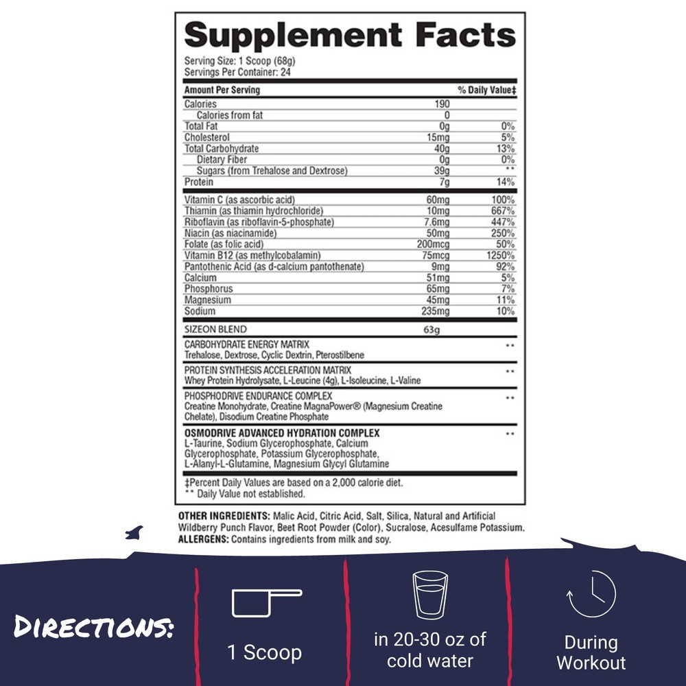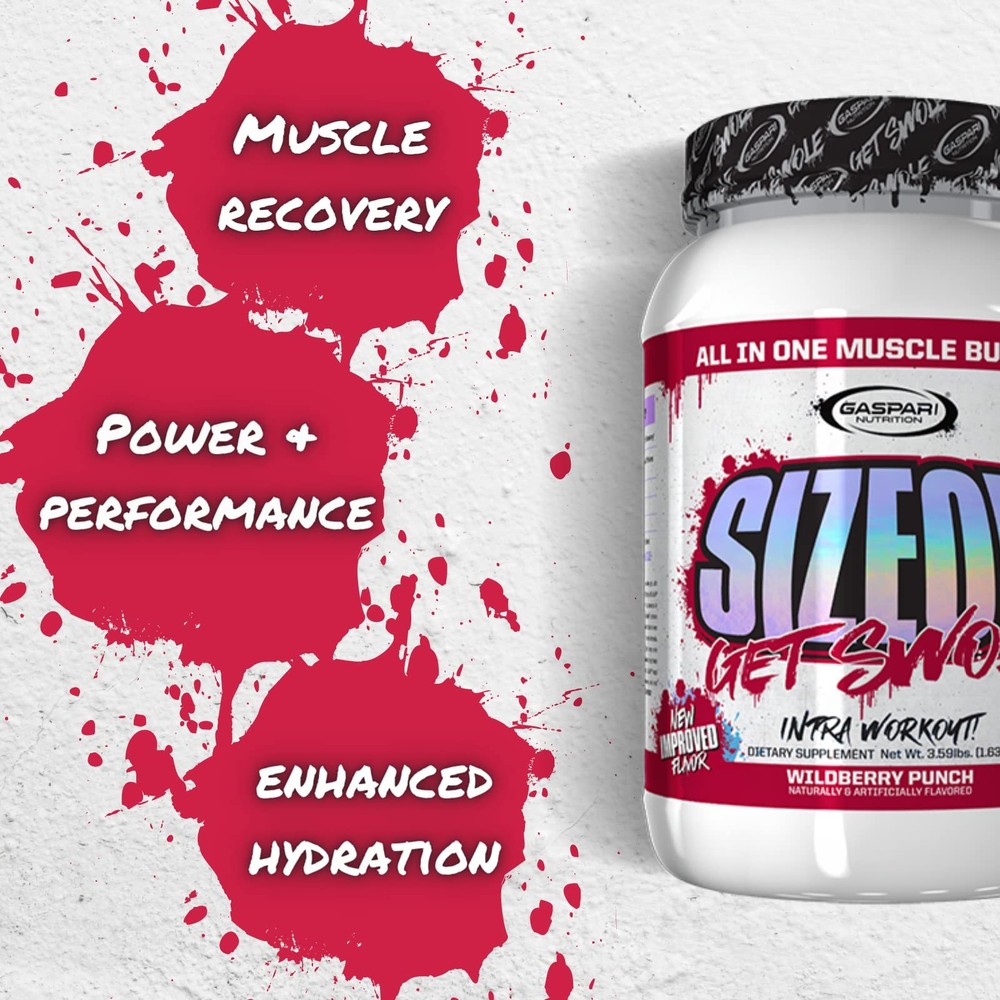 Gaspari Nutrition SizeOn, The Ultimate Hybrid Intra-Workout Amino Acid & MUSCLE VOLUME Increases muscle volume, muscle fiber size, cell volume & plasma amino acid levels. POWER & PERFORMANCE Includes cyclic dextrin infused carbohydrate blend for increased power & performance. MUSCLE RECOVERY Accelerates protein synthesis & muscle force recovery. ENHANCED HYDRATION Inhibits muscle protein breakdown & enhances hydration. Read more With 20+ years of proven results, Gaspari Nutrition's mission continues to be; to produce the highest-quality, science-based sports nutrition supplements in the world. No matter the category: bodybuilder, MMA athlete or weekend warrior, Gaspari innovates for you. Gaspari Nutrition SizeOn Max Performance Benefits: SizeOn brings these carefully selected ingredients together for unparalleled increases in athletic performance, skeletal muscle recovery, explosiveness and most notably, immediate increases in muscle size WHILE YOU ARE STILL TRAINING. Speeds up Protein Synthesis & Muscle Force Recovery Heightened Muscle Volume, Muscle Fiber Size, Cell Volume & Plasma Amino Acid Levels Intensifies S6K1 and 4E-BP1 Signaling and Hypertrophic mTOR Pathway Conduction Initiates & Maintains Myogenesis and Muscle Recovery While You Are Still Training Transports Vital Nutrients, Essential Minerals, and Growth Cofactors To Skeletal Muscle Tissue. Product Details Brand Gaspari Nutrition Mpn SIZEONE - Wild Berry Punch Speeds up Protein Synthesis & Muscle Force Recovery. Heightened Muscle Volume, Muscle Fiber Size, Cell Volume & Plasma Amino Acid Levels. SizeOn brings these carefully selected ingredients together for unparalleled increases in athletic performance, skeletal muscle recovery, explosiveness and most notably, immediate increases in muscle size. Contains the never before seen LOLA, our cutting-edge, amino acid salt L-Ornithine-L-Aspartate that cuts down on ammonia in the body! SizeOn can be utilized by anyone wishing to speed their recovery, build muscle mass, and increase performance whether in the gym or for athletic competition. Founded in 1998 by Rich Gaspari. Rich has been involved in the bodybuilding and fitness field for more than 30 years. He excelled as a top professional bodybuilder from the mid 80s through the 90s. - Powered by