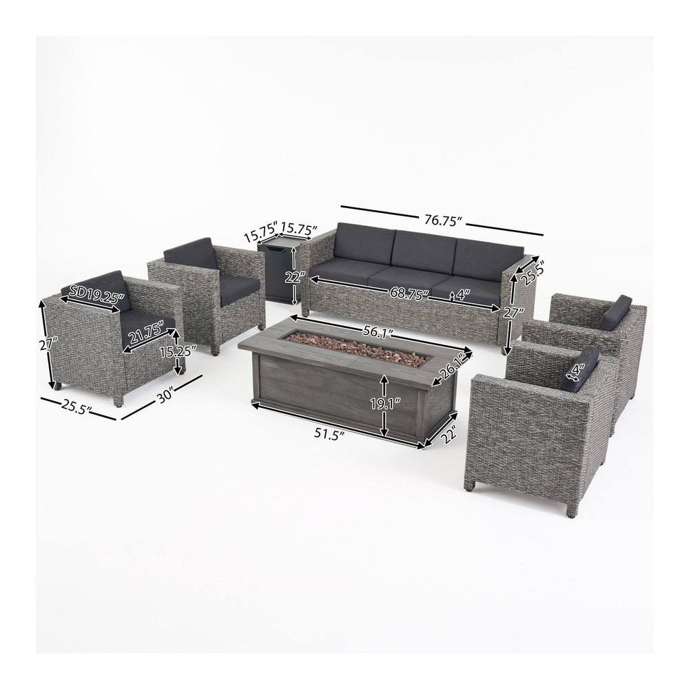 Create a special space in your own backyard with a chat set that will practically invite your friends over for you. With simple, clean lines, fine woven wicker finish, and comfortable water-resistant cushions, our seven-seater sectional set is made for both assuring durability and impressive comfort that also offers generous seating space around a cozy firepit centerpiece. Including four club chairs and one sofa, this chat set will have you conversing for hours on end in the comforts of your own backyard.POLYETHYLENE WICKER: This set features a wicker finish, giving this a natural style that is perfect for an outdoor look. The handcrafted details of the wicker bring a homemade, classic feel to your patio or backyard.WATER-RESISTANT CUSHIONS: Our cushions are covered with a non-porous Free Shipping Over $49.99* Details Gastman Outdoor 7 Seater Wicker Chat Set with Fire Pit by Christopher Knight Product Description: Create a special space in your own backyard with a chat set that will practically invite your friends over for you. With simple, clean lines, fine woven wicker finish, and comfortable water-resistant cushions, our seven-seater sectional set is made for both assuring durability and impressive comfort that also offers generous seating space around a cozy firepit centerpiece. Including four club chairs and one sofa, this chat set will have you conversing for hours on end in the comforts of your own backyard. POLYETHYLENE WICKERThis set features a wicker finish, giving this a natural style that is perfect for an outdoor look. The handcrafted details of the wicker bring a homemade, classic feel to your patio or backyard. WATER-RESISTANT CUSHIONSOur cushions are covered with a non-porous material that makes cleaning any spills a breeze so you can spend all summer lounging outdoors in comfort. LIGHTWEIGHT CONCRETE FIREPITThis fire pit is constructed with lightweight concrete with hand-crafted details that bring out a beautiful rustic wood feel. The shape allows easy seating arrangement for you and your guests, providing light and warmth all around during those chilly evenings. TANK HOLDERThis fire pit comes with a matching tank holder to keep your propane tank inconspicuous. This is made of sleek black iron so you can arrange this piece however you please and your set will always look classy. ASSEMBLY REQUIREDSome assembly is required for this chat set. All of the instructions and tools needed for assembly are included. IncludesOne (1) Sofa, Four (4) Club Chairs, One (1) Fire Table, and One (1) Tank Holder MaterialFaux Rattan Frame MaterialIron Cushion MaterialWater Resistant Fabric Cushion Composition100% Polyester Fire Table MaterialLight Weight Concrete Tank Holder MaterialIron Wicker FinishDark Brown/Mix black Cushion ColorBeige/Dark Gray Fire Table FinishBrown/Gray Tank Holder FinishBlack Hand-Crafted Details Assembly Required Chair Dimensions25.5 inches deep x 30 inches wide x 27 inches high Seat Dimensions19.5 inches deep x 21.75 inches wide x 15.25 inches high Sofa Dimensions25.5 inches deep x 76.75 inches wide x 27.25 inches tall Seat Dimensions19.25 inches deep x 68.75 inches wide x 15.25 inches tall Fire Table Dimensions26.2 inches deep x 56.1 inches wide x 19.1 inches high Tank Holder Dimensions15.75 inches deep x 15.75 inches wide x 22 inches high