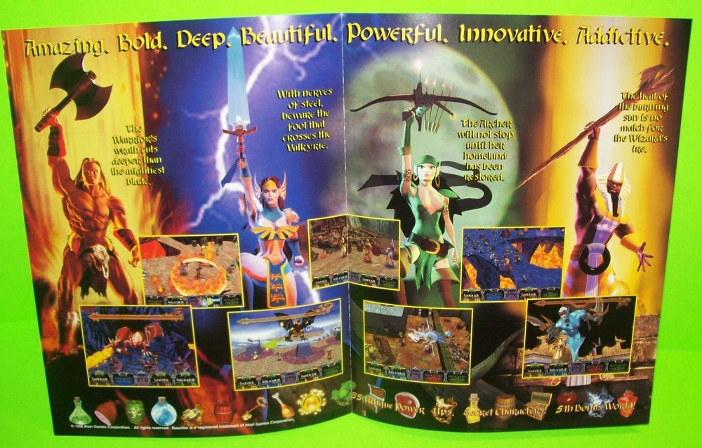 Atari Gauntlet Legends Dark Legacy Arcade FLYERS Original NOS Lot Of 2 Artwork Original non circulated new old stock paper promo sales flyers. Dark Legacy is a single page double sided artwork sheet. Gauntlet Legends is a four sided foldout artwork sheet. Flyers are paper promotional advertising sheets made for coin operated amusement arcade games. Also called a circular, brochure, pamphlet, or flier. All are single sheets unless noted otherwise. If there is artwork on the back side it will be shown. Size is 8.5" X 11". Perfect for framing. Makes great wall art for the man cave or a unique gift idea. Sheet protector included with each flyer sold. Orders are shipped with care. More pinball, jukebox, slot machine, and arcade game items for sale in our store. SHIPPING Bundle and save by using cart and making single payment. International buyers are responsible for any import fees/taxes. ABOUT US Seller of vintage collectibles, gifts, advertising, artwork, original pinball flyers, vinyl records, video arcade flyers, pinball machine translites, game manuals, score cards, magazines, antique Halloween and holiday postcards, Christmas items, super hero memorabilia, horror themed art. MORE RELATED ITEMS IN OUR STORE.