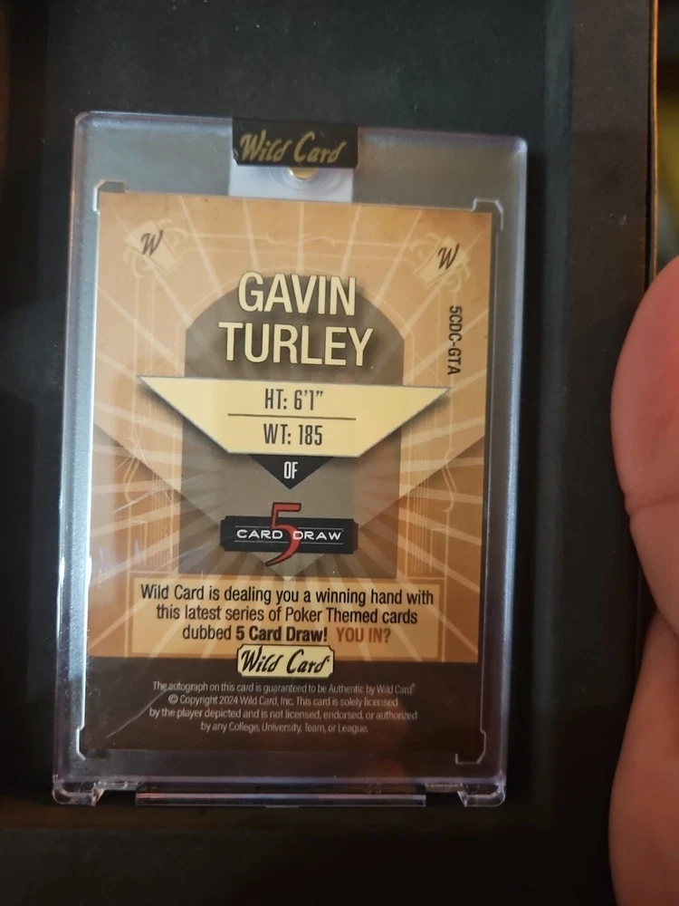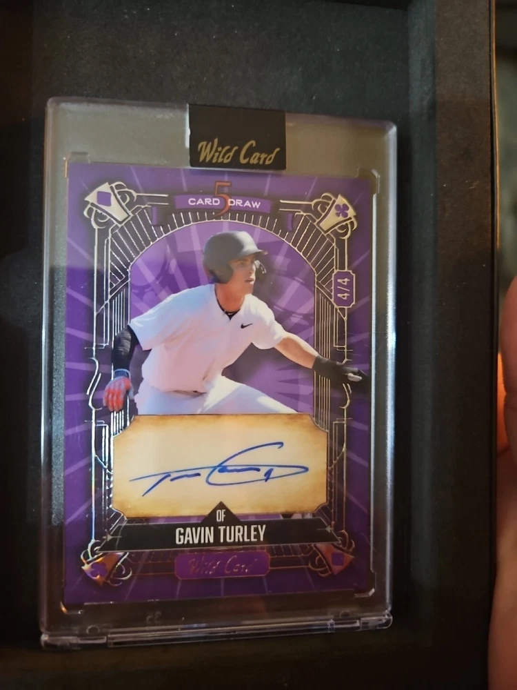 The product is a Gavin Turley 2024 Wild Card sports trading card from the Major League Baseball (MLB). This card is autographed by Gavin Turley and is in near mint or better condition. It is a Purple parallel/variety card manufactured by Wild Card and is part of the 5 deck Draw series, specifically card number 5CDC-GTA. This unique and collectible trading card would be a prized possession for any baseball card enthusiast or fan of Gavin Turley.