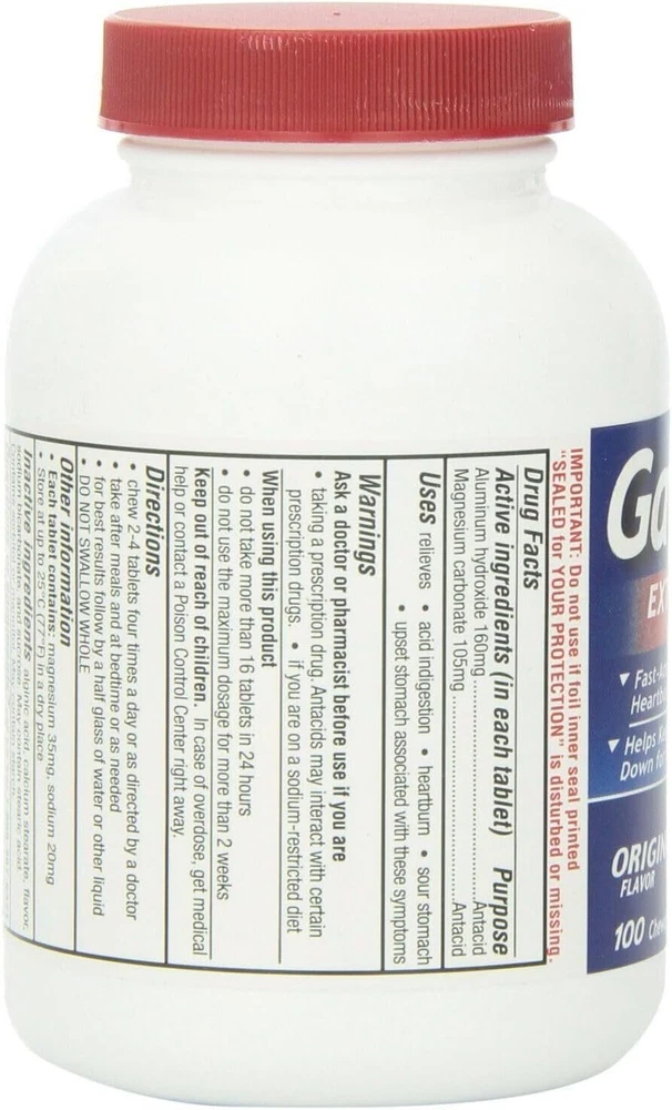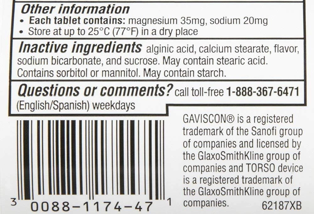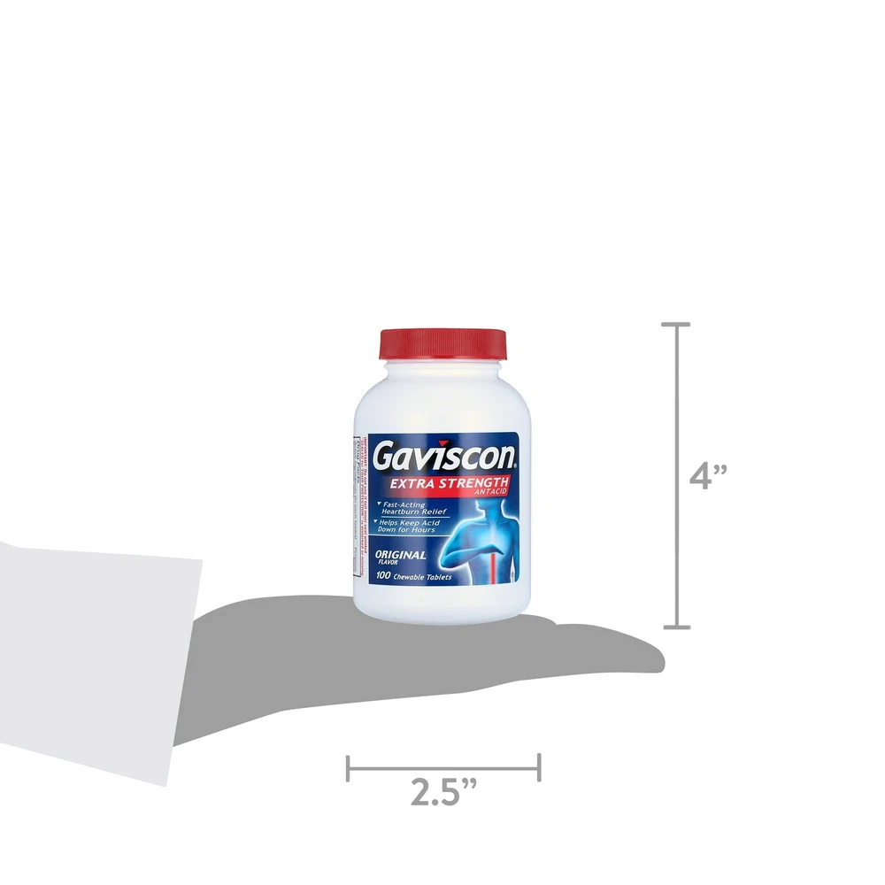 Product Description Gaviscon Extra Strength, Antacid Heartburn, Chewable Antacid Tablets, Original Flavor, 100 Count (Pack Of 2) Look no further than doctor-recommended Gaviscon antacids. In addition to its fast-acting, acid-neutralizing properties, Gaviscon is the only† antacid product that provides long-lasting relief.* It's available in Extra Strength Tablet Antacid Original flavor, as well as Extra Strength Liquid Antacid Cool Mint flavor, Extra Strength Liquid Antacid Original flavor and Extra Strength Tablet Antacid Original flavor. With Gaviscon, you'll always have an effective daily treatment for managing heartburn!†Amongst national brands; *when used as directed. Defeat heartburn like a boss with Gaviscon Extra Strength Chewables (100-count, original flavor): These mighty little tablets are fast-acting and long-lasting relief. Ditch the chug-a-thon of syrup – just chew and conquer. Plus, they're portable, so heartburn doesn't dictate your day (or your date night). NDC Code(s): 0135-0098-26 Fast-Acting and Long-Lasting Relief: Gaviscon provides fast relief from symptoms of heartburn, acid indigestion, sour stomach, and upset stomach. It's also known for providing long-lasting relief when used as directed. Unique Acid-Neutralizing Properties: It is the only antacid product amongst national brands that offers both fast-acting and long-lasting relief. Neutralizes Stomach Acid: Gaviscon works by quickly neutralizing stomach acid and helps to keep acid down for an extended period, providing lasting comfort and relief. Available in Various Forms: Available in Extra Strength Tablet Antacid Original, Extra Strength Liquid Antacid in Cool Mint and Original flavors, and Extra Strength Tablet Antacid in Original flavor, providing options for individual preferences. Recommended by Gastroenterologists: Gaviscon is recommended by gastroenterologists as an effective treatment for managing heartburn and acid reflux symptoms. Gaviscon provides fast acting, long lasting heartburn relief and is an acid reflux remedy (when used as directed) Relieves heartburn, sour stomach, acid indigestion, and upset stomach associated with these symptoms Quickly neutralizes stomach acid and helps keep acid down for hours (when used as directed) Gaviscon is gastroenterologist recommended for heartburn and is available in both liquids and chewable tablets Gaviscon Extra Strength Tablet Antacid Original flavor contains the active ingredients aluminum hydroxide and magnesium carbonate HSA and FSA eligible product Provides relief of heartburn, sour stomach, acid indigestion and upset stomach associated with these conditions Contains unique antacid barrier Relieves heartburn caused by acid reflux Please read all label information on delivery For fast-acting, long-lasting heartburn relief Relieves heartburn, acid indigestion, sour stomach, upset stomach associated with these symptoms Extra strength chewable antacid tablets Original flavor 100 Chewable tablets Country Of Origin: United States Ingredients Active Ingredient (in each tablet): Aluminum hydroxide 160mg. Magnesium carbonate 105mg Inactive ingredients: Alginic acid, calcium stearate, flavor, sodium bicarbonate, and sucrose. May contain stearic acid. Contains sorbitol or mannitol. May contain starch. Active Ingredients: Per Tablet: Aluminum Hydroxide 160 mg; Magnesium Carbonate 105 mg. Inactive Ingredients: Alginic Acid; Calcium Stearate; Flavor; Sodium Bicarbonate; Sucrose; May Contain Stearic Acid; Contains Sorbitol or Mannitol; May Contain Starch.