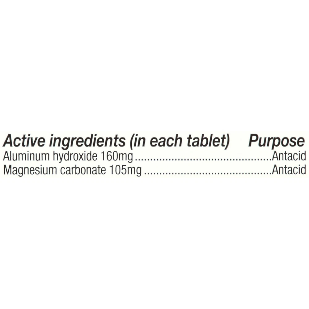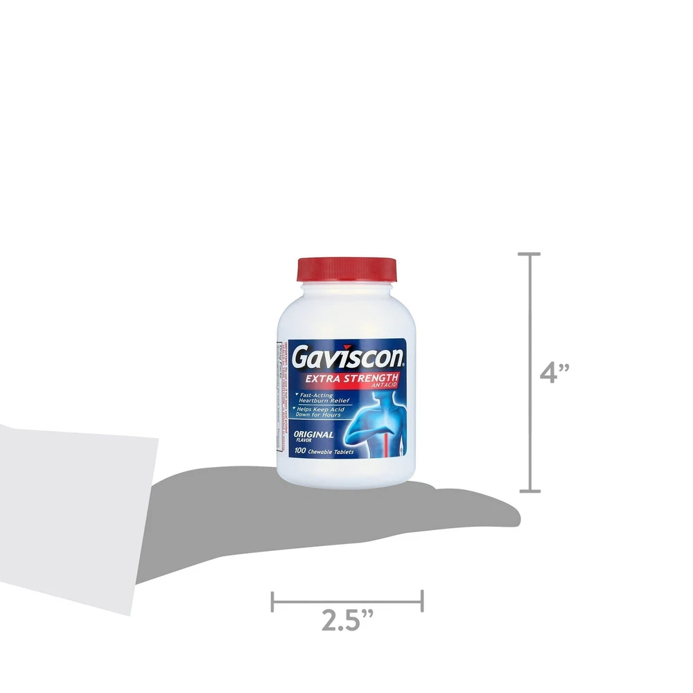 Gaviscon Extra Strength, Antacid Heartburn, Chewable Antacid Tablets, Original Flavor, 100 Count (Pack Of 5) Look no further than doctor-recommended Gaviscon antacids. In addition to its fast-acting, acid-neutralizing properties, Gaviscon is the only† antacid product that provides long-lasting relief. It's available in Extra Strength Tablet Antacid Original flavor, as well as Extra Strength Liquid Antacid Cool Mint flavor, Extra Strength Liquid Antacid Original flavor and Extra Strength Tablet Antacid Original flavor. About this item Fast-Acting and Long-Lasting Relief: Gaviscon provides fast relief from symptoms of heartburn, acid indigestion, sour stomach, and upset stomach. It's also known for providing long-lasting relief when used as directed. Unique Acid-Neutralizing Properties: It is the only antacid product amongst national brands that offers both fast-acting and long-lasting relief. Neutralizes Stomach Acid: Gaviscon works by quickly neutralizing stomach acid and helps to keep acid down for an extended period, providing lasting comfort and relief. Available in Various Forms: Available in Extra Strength Tablet Antacid Original, Extra Strength Liquid Antacid in Cool Mint and Original flavors, and Extra Strength Tablet Antacid in Original flavor, providing options for individual preferences. Recommended by Gastroenterologists: Gaviscon is recommended by gastroenterologists as an effective treatment for managing heartburn and acid reflux symptoms. Gaviscon provides fast acting, long lasting heartburn relief and is an acid reflux remedy (when used as directed) Relieves heartburn, sour stomach, acid indigestion, and upset stomach associated with these symptoms Quickly neutralizes stomach acid and helps keep acid down for hours (when used as directed) Gaviscon is gastroenterologist recommended for heartburn and is available in both liquids and chewable tablets Gaviscon Extra Strength Tablet Antacid Original flavor contains the active ingredients aluminum hydroxide and magnesium carbonate Plus, they're portable, so heartburn doesn't dictate your day (or your date night). NDC Code(s): 0135-0098-26 HSA and FSA eligible product Provides relief of heartburn, sour stomach, acid indigestion and upset stomach associated with these conditions Contains unique antacid barrier Please read all label information on delivery For fast-acting, long-lasting heartburn relief Extra strength chewable antacid tablets Original flavor 100 Chewable tablets Country Of Origin: United States Ingredients Active Ingredient (in each tablet): Aluminum hydroxide 160mg. Magnesium carbonate 105mg Inactive ingredients: Alginic acid, calcium stearate, flavor, sodium bicarbonate, and sucrose. May contain stearic acid. Contains sorbitol or mannitol. May contain starch. Active Ingredients: Per Tablet: Aluminum Hydroxide 160 mg; Magnesium Carbonate 105 mg. Inactive Ingredients: Alginic Acid; Calcium Stearate; Flavor; Sodium Bicarbonate; Sucrose; May Contain Stearic Acid; Contains Sorbitol or Mannitol; May Contain Starch.