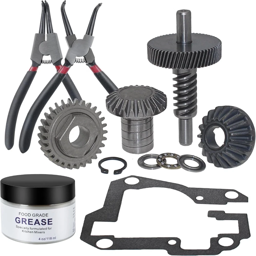 Worm Gear Kit Compatible With KitchenAid Whirlpool 5QT & 6QT Mixer Gear Parts Replacement, Worm Follower Gear Kit 9706529 W11086780 9709511 9703337 9709231 【worm gear kit includes】1 x 9709511 Gasket; 1 x 9703445 Thrust Bearing; 1 x 9709231 WP9709231 Worm Gear; 1 x 9703337 9703338 Mixer Bevel Gear Kit; 1 x 9706529 W11086780 Worm Gear& Snap Ring; 1 x Retaining Ring Pliers. 【9706529 Worm Gear Replaces part numbers】9709511, 9706529, 9703543, 1094120, 1426121, AP3594375, AP6013715, AP4326018, AP6013805, AH774065, AH1488426, EA774065, EA1488426, WP9706529, PS774065, PS11746942, PS1488426, PS11747032, PS11746905 【9703337 Beveled Gears Set Replaces Part Numbers】4161404, 4169868, 4582676, 9703337, W11044501, W11175144, AP6286924, W11192795, WP9703337, WP9703338, PS12348886, WPW11192795 【9709231 Worm Gear Replaces Part Numbers】9709231, 9703446, 9703699, 9706590, 9706769, 9706770, WP9709231, AP6013785, PS11747012 【9709511 Gasket Replaces part numbers】9707425, 9703381, WP9709511, AP6013805, PS11747032; 9709511 Gasket Fits for all 5.5 and 6 quart KitchenAid stand mixers