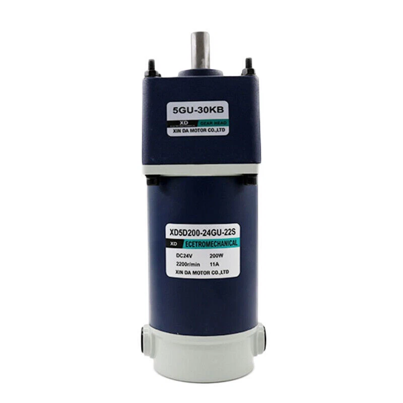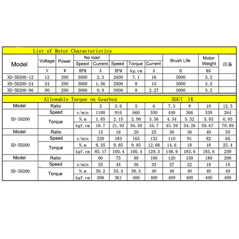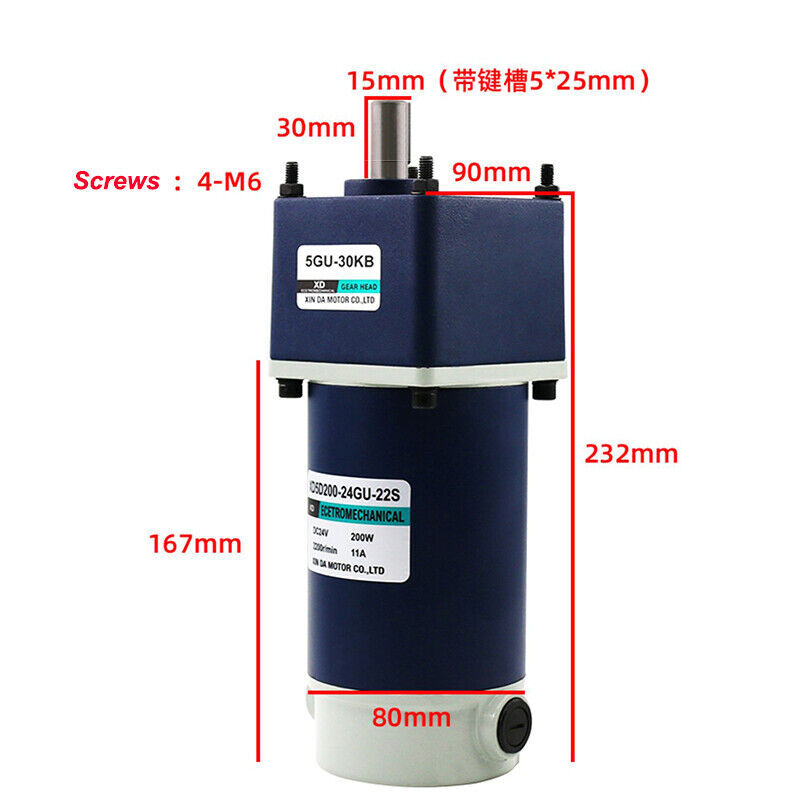 200W Geared Motor DC 12V 24V Reduction High Torque 400kg Reversible Metal Gear ●Product Properties : Motor Model : 5D200GN-C Power Supply : DC 12V 24V Speed : 10RPM - 600RPM Shaft Diameter : 15mm Shaft Length : 30mm Motor size : 90 x 167mm Motor Power : 200W Current : 15A ●Product Features : Pure copper coil, 3 layers of high-density molecular coating of drip paint coating, effective isolation from dust and high temperature resistance, 10 times the life of ordinary coating. Metal gear, wear-resistant and durable, good deceleration effect, strong torque and long service life. High strength magnet, magnetic stability, high magnetic energy, high performance, high temperature resistance and other characteristics.