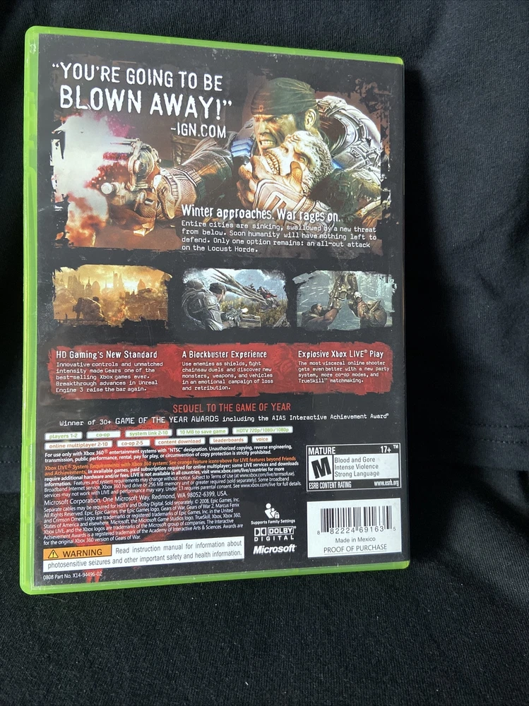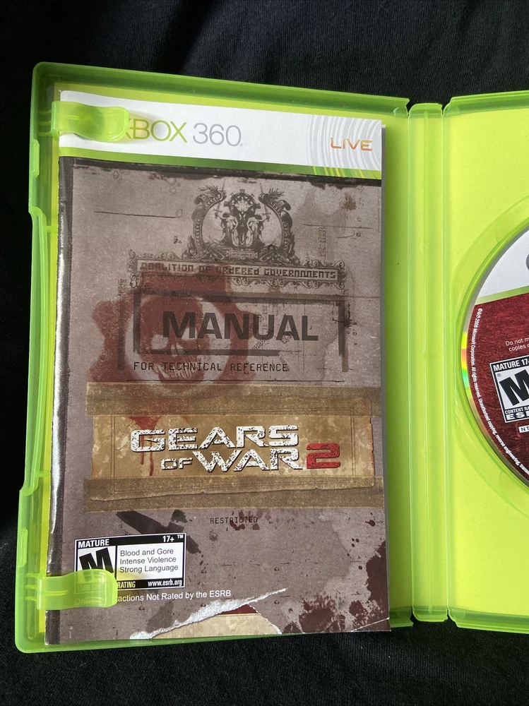 gtin13:0882224691635Manufacturer Warranty:NoneRating:M - MatureUPC:0882224691635Game Name:Gears of War 2Features:Manual Included, Multiplayer, Online PlayabilityPlatform:Microsoft Xbox 360Custom Bundle:NoSub-Genre:Boxing, Martial Arts, ShootingVideo Game Series:Gears Of WarPublisher:MicrosoftMPN:C3U-00001Country/Region of Manufacture:United StatesGenre:Shooter