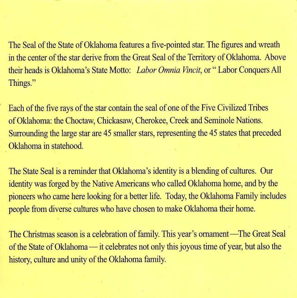 For consideration from the Historical Society of Oklahoma is the 2010 Oklahoma Ornament with box and paperwork. It is in like new condition. The seal of the State of Oklahoma features a five-pointed star. The figures and wreath in the center of the star derive from the Great seal of the Territory of Oklahoma. Above their heads is Oklahoma's State Motto: Labor conquers All Things. Please look closely at photos. V isit our eBay Store for a variety of classic, rare and hard-to-find books. OleTooks Ships Fast and Secure!