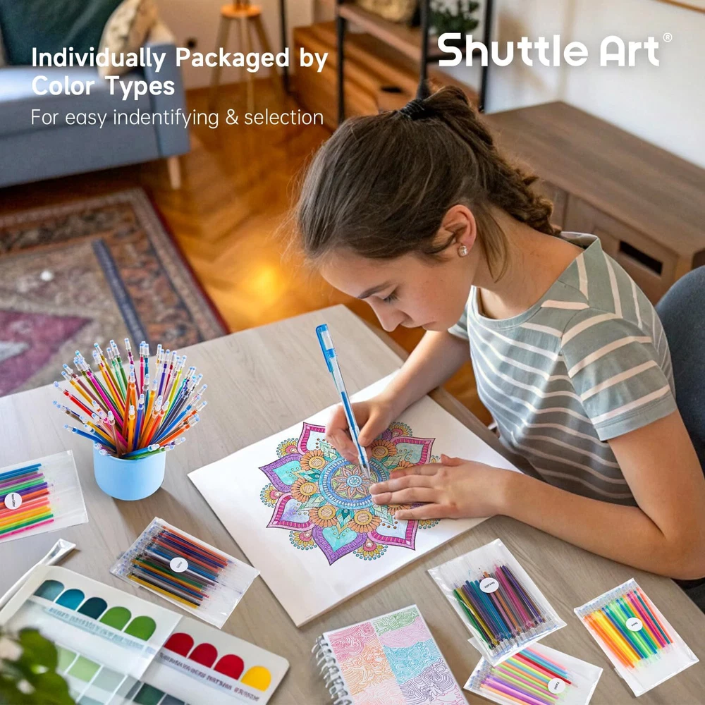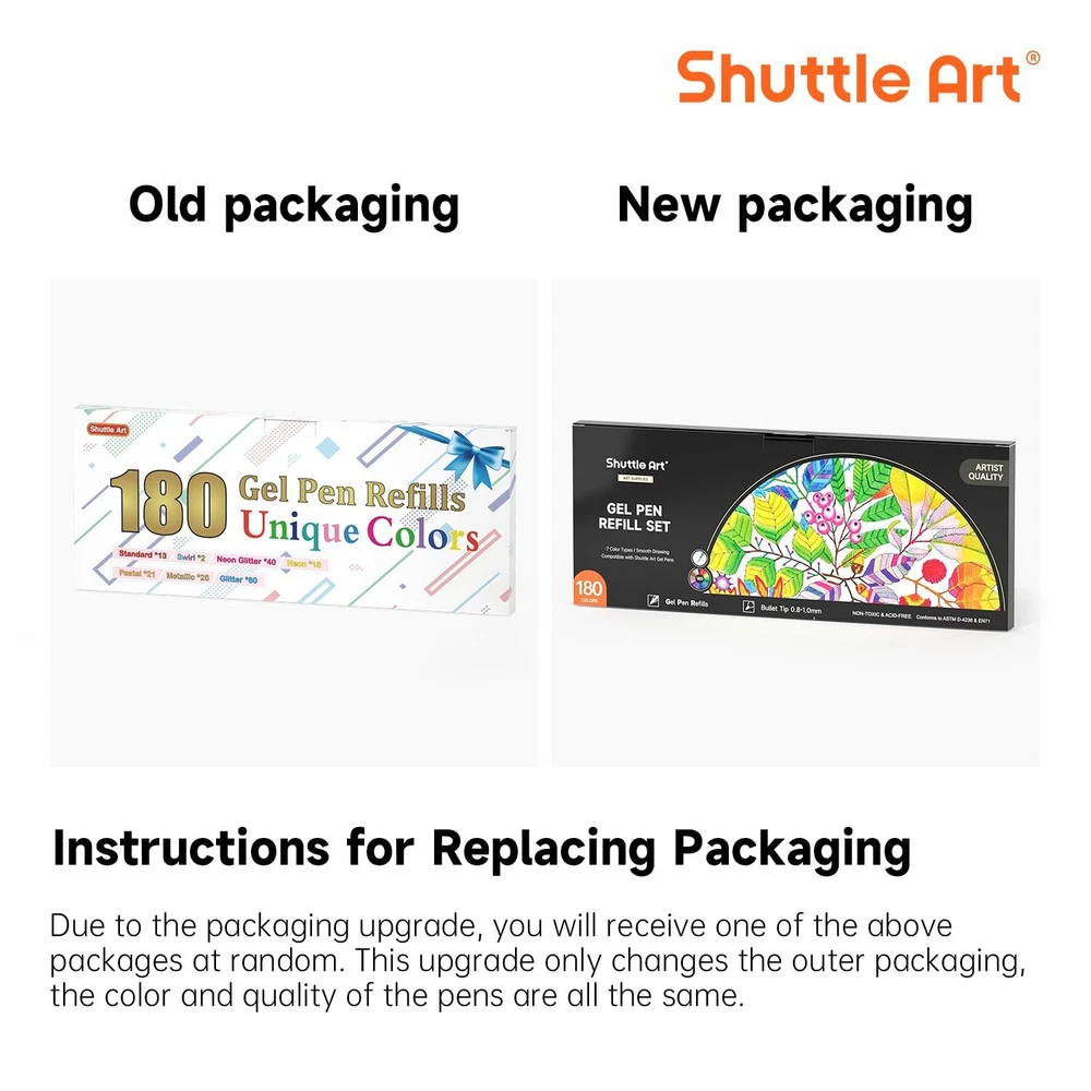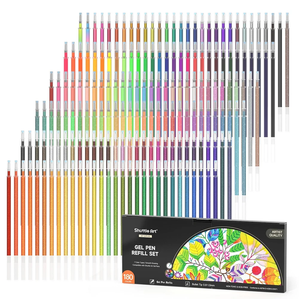 180 UNIQUE COLORS: Shuttle Art Gel Pen Refills Set has 180 unique colors, including 7 color types: glitter, neon glitter, metallic, neon, pastel, swirl, standard. Abundant colors with varied color types, fully meet your demands of coloring, writing and drawing. SMOOTH WRITING: Without skipping or bleeding, 0.8mm-1.0mm ballpoint tip can produce smooth and no skipping fine lines for coloring. And different color types are individually packaged, which makes it easier to find what you need. VARIETY OF USES: Great for bullet journaling, sketching, drawing, writing, coloring books and any other designs on Scrapbooks, School Projects, Party Invites, Greeting Cards, DIY Decor & Letters to Friends & Family. QUALITY GEL PEN REFILLS: The coloring gel pen refill set is non-toxic and acid-free. Conforms to ASTM-D4236. Definitely an ideal art supply for adults and kids. With those refills, there is no need to buy single pen. Less cost, more happiness. SERVICE GUARANTEE: Your satisfaction is our top priority, please rest assured to purchase our products. If you are not satisfied with our products or have any questions, please feel free to contact us at any time.