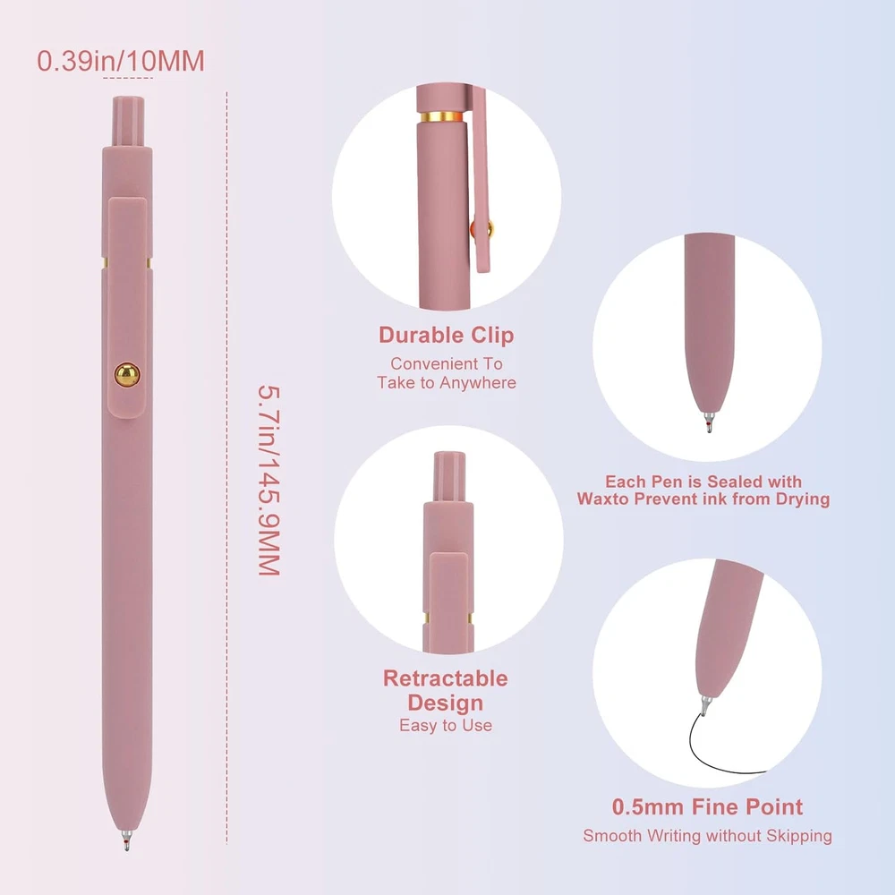 Gel Pens: You will receive 6pc quick-drying ink pens with a modern minimalist design to suit your needs Daily use and replacement needs Quick-Drying Ink: These retractable roller ball gel pens feature reliable ink that won't fade or smudge easily; the rollerball ink dries quickly that help you keep work neat and organized Practical and Simple Design: The convenient clip design can firmly clip the neutral ink ballpoint pen to a book, notebook or bag, easy to carry, without worrying about losing; retractable design, gently press the cap, the pen end automatically retracts Scope of use: 6pc gel pen is suitable for children and adults for writing, diary, sketching, painting, scrapbooking, making gift cards, etc., to meet your various needs in daily study and work Practical Gifts: You can give these colored gel pens as practical gifts to your family, friends, students, classmates and colleagues to express your feelings on various occasions such as birthdays, thanksgiving, Christmas stockings stuffers, graduations, classroom activities, parties, etc. love and blessings Product Description Ddaowanx Gel Pens Add to Cart Add to Cart Add to Cart Add to Cart Add to Cart Add to Cart Customer Reviews 4.6 out of 5 stars 2,780 4.4 out of 5 stars 495 4.4 out of 5 stars 495 4.4 out of 5 stars 495 4.6 out of 5 stars 2,780 4.6 out of 5 stars 2,780 Price $8.99 $ 8 . 99 $9.99 $ 9 . 99 $9.99 $ 9 . 99 $9.99 $ 9 . 99 $8.99 $ 8 . 99 $8.99 $ 8 . 99 Ink Color Black Colored Blue Colored Black Black Tip 0.5mm 0.5mm 0.5mm 0.5mm 0.7mm 0.5mm Quick drying Ink ✔ ✔ ✔ ✔ ✔ ✔ Retractable ✔ ✔ ✔ ✔ ✔ ✔ Soft Comfortable Grip ✔ ✔ ✔ ✔ ✔ ✔ The video showcases the product in use. The video guides you through product setup. The video compares multiple products. The video shows the product being unpacked.