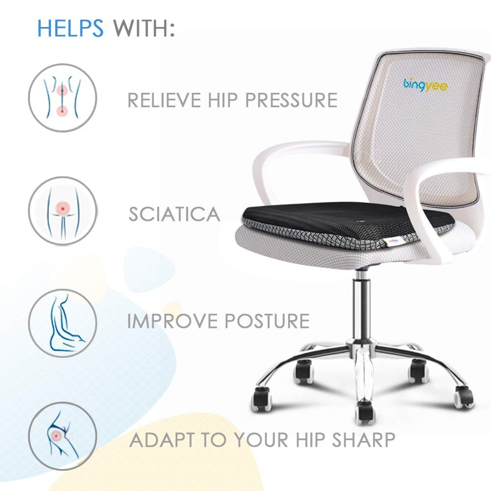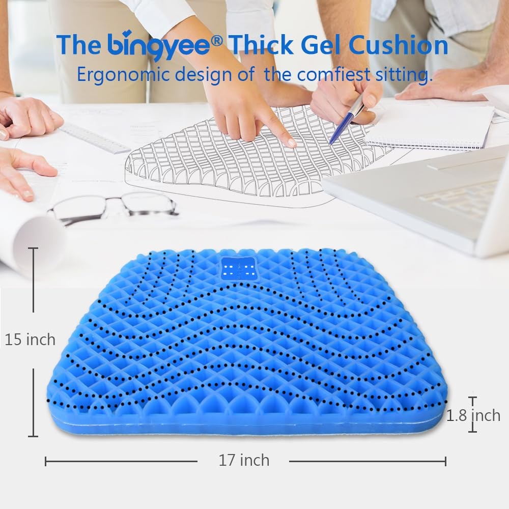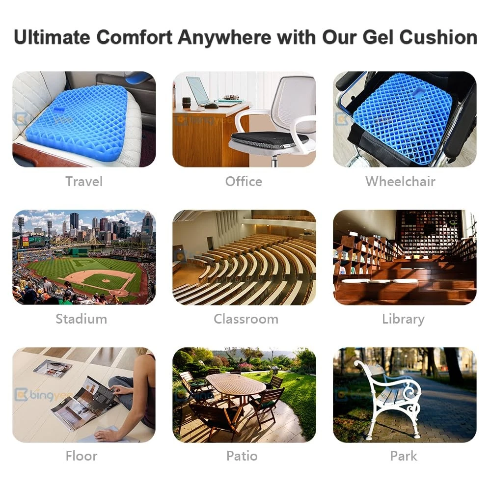 To give you the comfort feeling you need. The cushion is slipless gel rubber bottom can stay well when you sit on. Its soft exterior, and its excellent tailbone & hip support allows it to fit even the roughest of surfaces such as office chairs, plastic chairs, stadium & airline seats - works excellent on any outdoor, patio, or garden chairs. Instant pressure relief for women during pregnancy, too. Super soft gel cushion with Anti-slip bottom for Kayak Seat Cushion, Stadium Pads, Bleacher Seat cushions. NOTE: THE CUSHION HAS A CARRING HANDLE , NO SAFE BELT/STRAPE SWEATLESS : Its Honycomb Design provide Passive Airflow, when you sit for a long time it also give you cooling feel without sweat. SOFT and FLEXIBLE : Hyper Elastic Gel Material gives soft and comfortable sitting feeling,excellent flexibility, can be squeezed back to the original shape immediately after stretching. When you put raw egg on pad and sit down, raw egg won't be broken RELIEF PAIN & Numb : This gel seat cushion is much soft, it can help to relief hip pain, tailbone pain while you sit for a long time. Also relief numb of legs and buttocks after a long time sitting. PROPER SIZE : Cushion size is 16.5"*15.7"*1.8" is suitable to most of normal chairs. The Gel material is soft and long lasting can be sit for a long time. EASY to CLEAN CLOTH COVER: Gel Seat cushion cover is easy to take off to wash in machine. it was sewn brand & wash label, also has a carrying handle to easy take away from office, home, or travelling, etc.