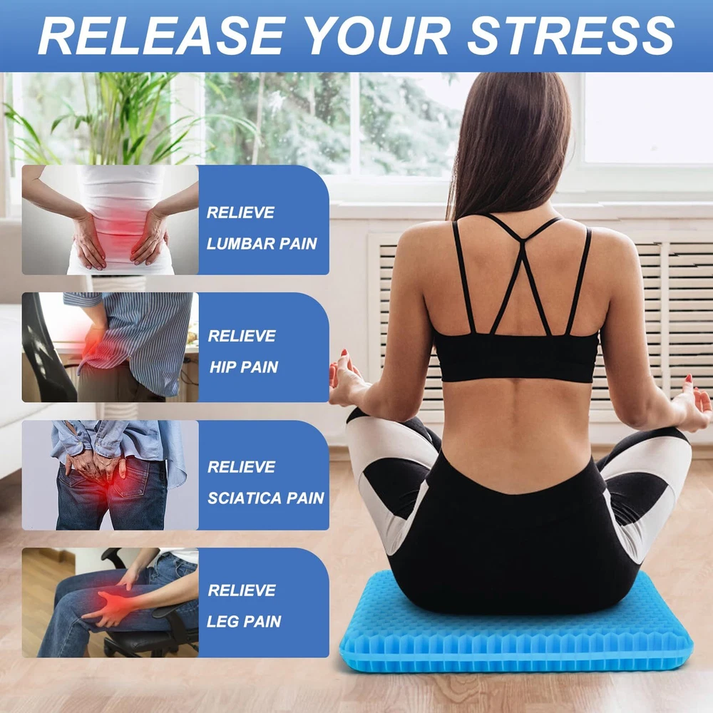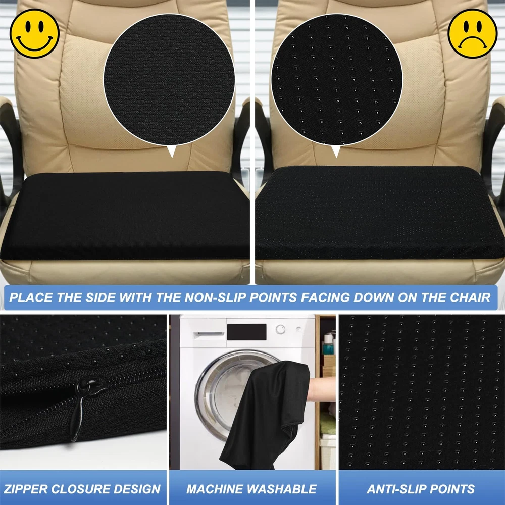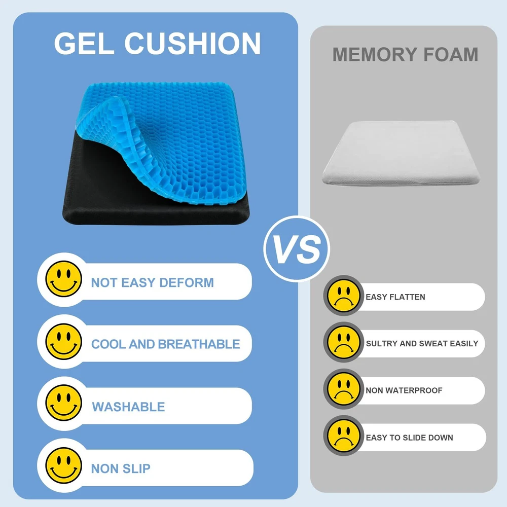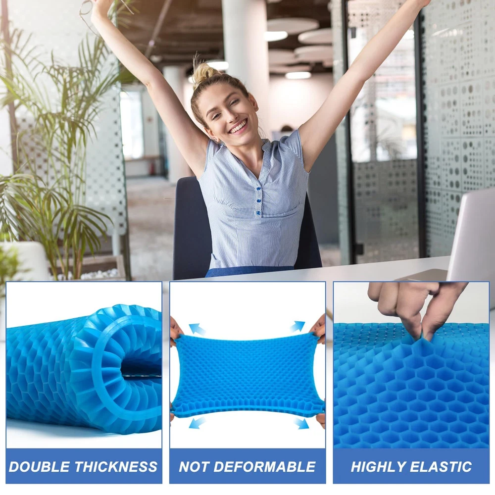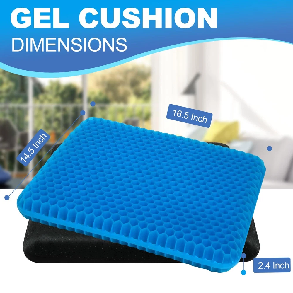 ✔️【2.4 INCH THICKNESS】thick gel seat cushion thickness upgraded from 1.6 inches to 2.4 inches, which is 50% thicker than most other gel cushions. 16.5 x 14.5-inch size fits most chairs, providing a soft and breathable layer on your chair. ✔️【PRESSURE RELIEF】gel cushions for pressure relief crafted with an elastic structure molds to your body curves well, can evenly distributing body pressure, form none pressure point, reduce sciatica or hip pain from prolonged sitting. ✔️【SOFT&BREATHABLE】Unlike traditional seat cushion trap heat and lead to embarrassing sweat stains, gel seat cushion for long sitting has ventilated holes to keep cool and comfortable, without being stuffy and sweaty. ✔️【NON SLIP&WASHABLE COVER】Detachable black cover features non-slip dots on the underside to keep your cushion securely on chair. It’s also machine-washable, so you can easily wash it and always have a clean gel cushion. ✔️【COMFORT ANYWHERE】gel cushion also widely use as car seat cushion, wheelchair cushion, office chair cushion. Enjoy consistent, supportive comfort gel cushion for sitting.