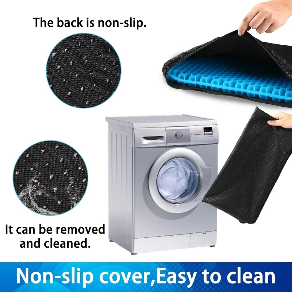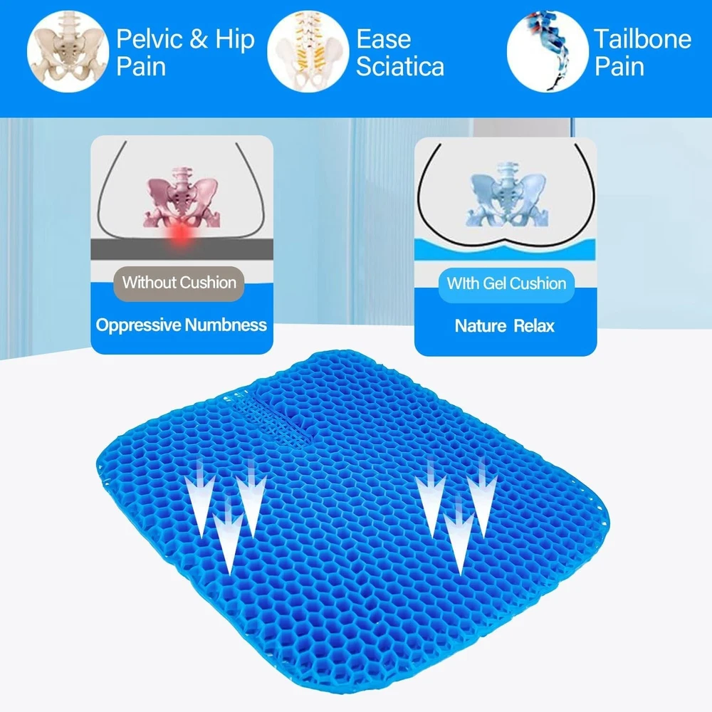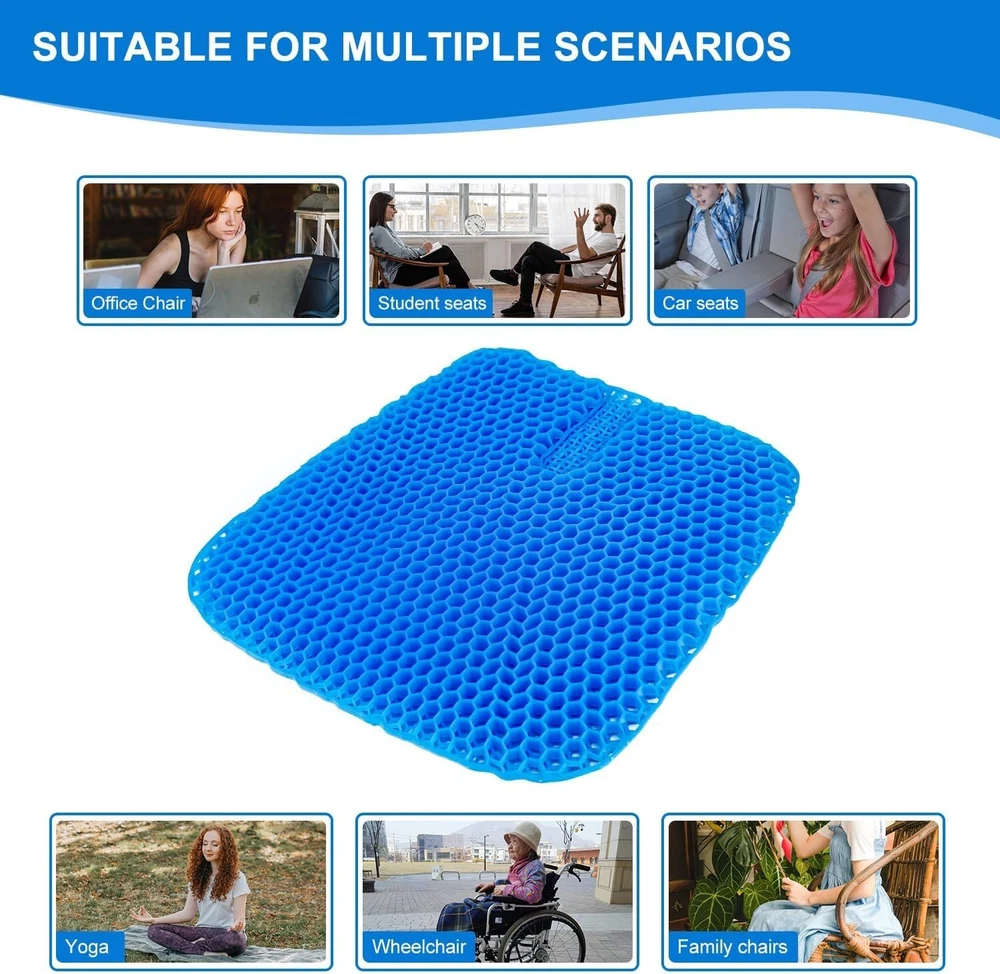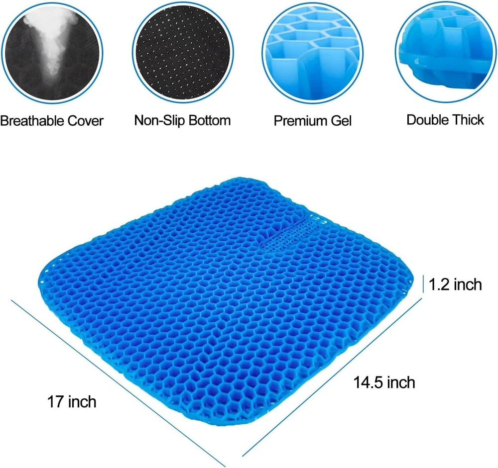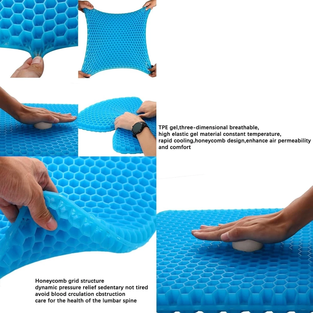 Gel Seat Cushion for Long Sitting (Thick & Extra Large),Cool Seat Cushion,Chair Seats,Wheelchair Seat Cushions,for Office Chair Car Seat,Breathable & Sciatica Pain Relief & Back Pain 👍【 Helps Relieve Pain 】 The Gel cushion measures 17 x 14.5 x 1.2 inches.Double gel pad design. Not only thicker, but also more comfortable, effective prevention and relief of a variety of pain symptoms 👍【Breathable & heat dissipation】Our seat cushion adopts honeycomb design with built-in free flow air duct to prevent seat sweating and maintain comfortable heat dissipation. High resilience, sedentary not tired 👍【Super soft & not easy to deform】 Gel cushion with cushioning properties, even put eggs sit down will not break. In addition, it features a highly elastic gel material that, when stretched and squeezed, returns to its original shape in a moment, providing superior durability over traditional cushions. 👍【Wide range of use】 Suitable for office, family, travel, car seats, wheelchairs, etc., suitable for family, elders, friends, colleagues gifts. 👍【cloth zipper design, easy to clean】 Zipper design, detachable seat cover, can better clean the gel seat cushion. This way you can use the seat cushion without worrying about staining the seat.