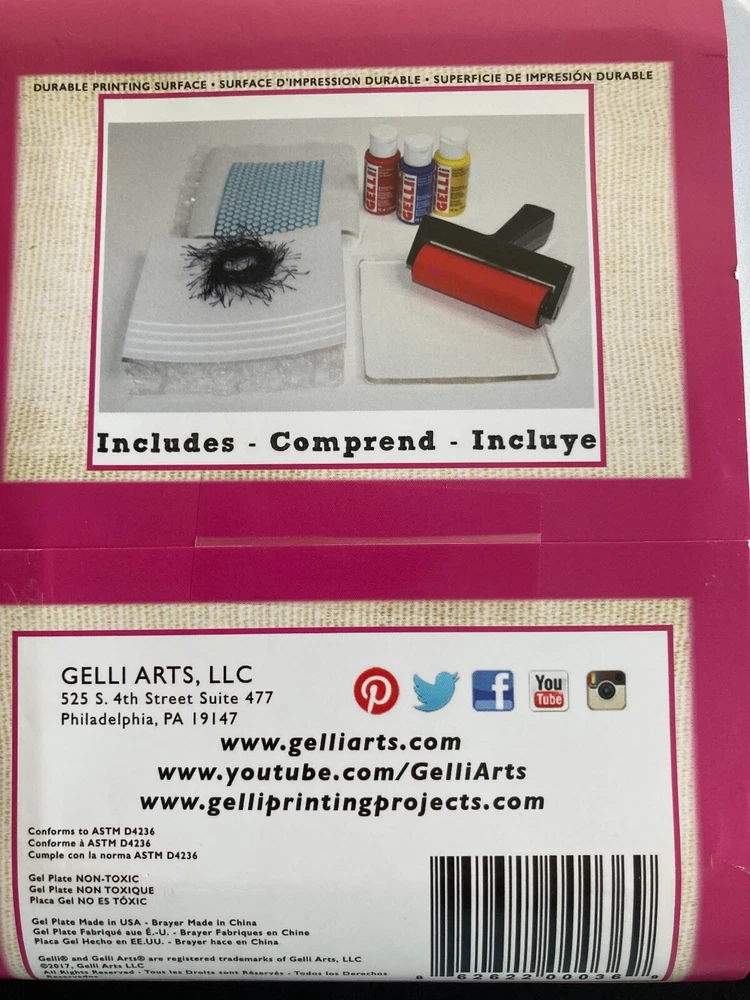 Gelli Arts Gel Printing Stamping & Printing Kit New and unopened. A great gift for ages 8+ Gelli Arts allows you to create beautiful printed creations with ease, this kit features a Gel Printing Plate which looks and feels like gelatine, but it is durable, re-usable and stores at room temperature. You'll also get Gelli Arts Premium Acrylic Paint (3 colours in 1 oz bottles), a 4" roller, a 3-sided Gelli Arts mini comb, parchment paper, Bubble Wrap, Yarn and Punchinella. Money-back satisfaction guaranteed. Buy with confidence from an established eBay seller - 2800+ transactions. We always combine shipping. Ships within two business days upon receipt of payment.