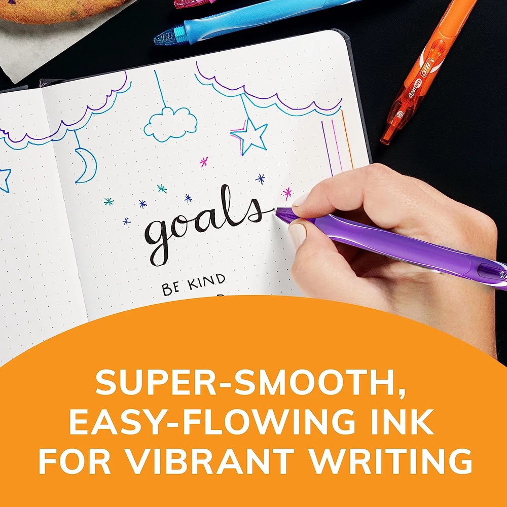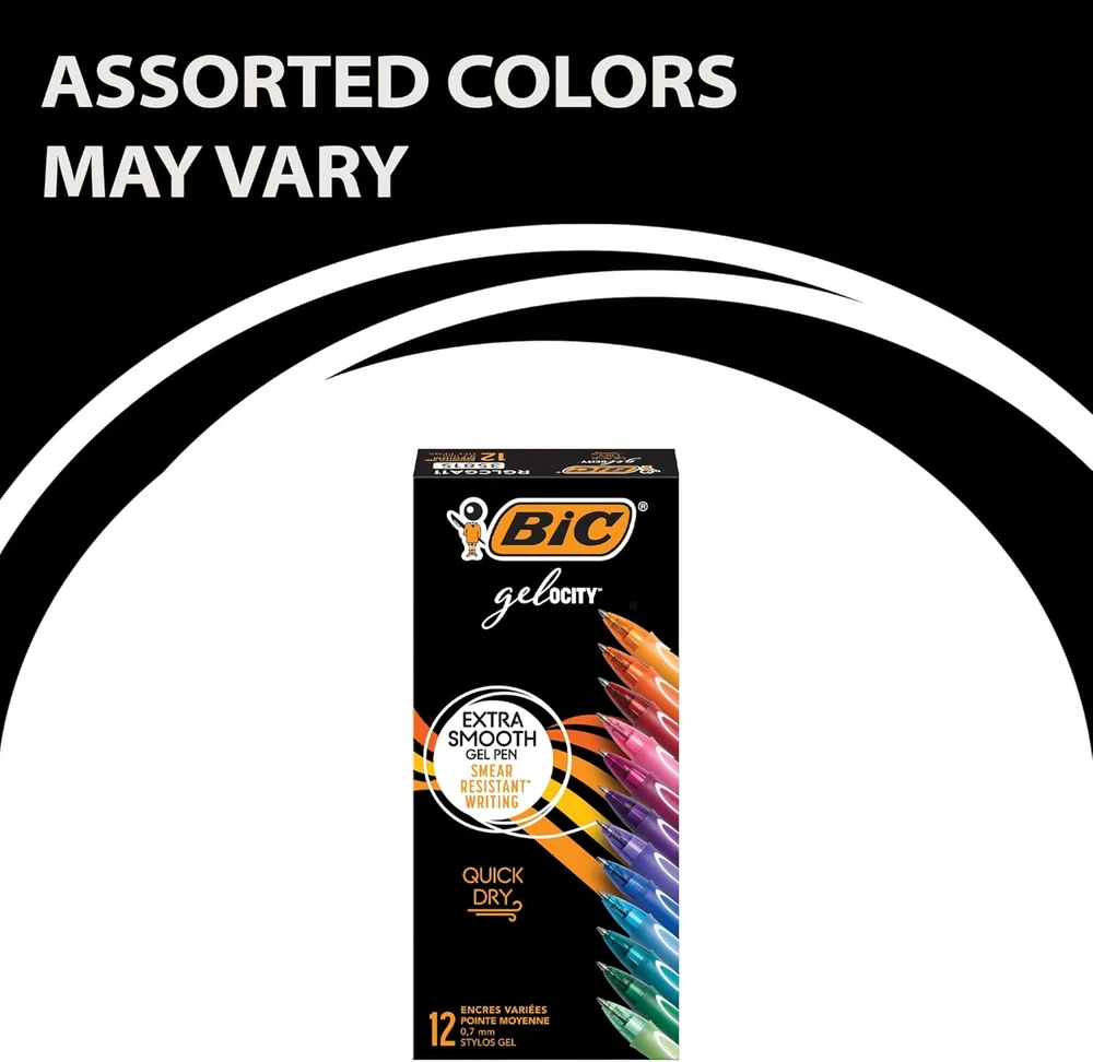 One 12-count pack of BIC Gelocity Quick Dry Assorted Colors Gel Pens Versatile 0.7mm medium point gel ink pens that are great for everyday writing at work, school or home Bold, vibrant ink that is smear resistant and dries quickly Vibrant gel pens ink dries in as little as five seconds to prevent smearing; a smart choice for left-handed writers Convenient retractable gel pens with a full-length comfortable grip and plastic clip — ideal gel pens set for office or school supplies Enjoy a super-smooth writing experience with BIC gel-opacity quick dry retractable gel pens in assorted fashion colors. Ideal for note-taking, annotating, and a variety of other writing tasks, these gel pens feature a super-smooth ink that dries quickly to help minimize smears. The round, full-grip barrel rests snugly between your fingers, helping promote comfort during long writing sessions, while the 0.7mm point on these gel pens create vivid marks. The retractable design allows you to deploy and retract the tip with a simple click. Available in an array of vibrant colors, these gel pens leaves a clean, striking impression.