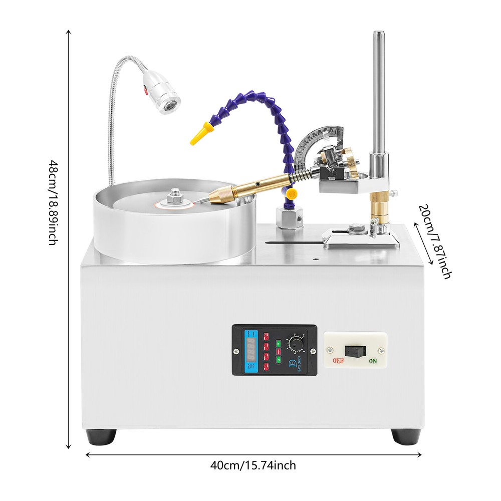Specification Material: Stainless Steel, Diamond Color: Silver Process: Polishing, Electroplating Style: Modern Assembly Required: Yes Mounting Type: Free Standing Plug Type: US Standard Motor Type: Copper Wire Motor Torque: 80N.m LED Light: 3W Lumens: 500lm (Independent Switch) Water Pump: 4.5W Sink Height: 60mm/2.36in Grinding Wheel Inner Hole Diameter: 12.7mm/0.5in Voltage: 110V Power: 180W Speed: 0-2800rpm Grinding Disc Diameter: 150mm/5.91in Product Size: 40*20*48cm/15.75*7.87*18.9in Package Size: 48*38*33cm/18.9*14.96*12.99in Gross Weight: 17kg/37.48lbs Net Weight: 16.15kg/35.6lbs Package Included 1* Gem Faceting Machine 1* English Manual Other Accessories for Assembly Gem Faceting Machine, Jade Grinding Polishing Machine, Jewel Angle Polisher Description Gem Faceting Machine Jade Grinding Polishing Machine Jewel Angle Polisher 180w Application This Product Is Suitable for Processing and Grinding Tools, Seals, Natural Gemstones, Semi-precious Stones, Glass, Jade, Crystal, Agate, Garnet, and Olivine, Such As Interfaces, and Cutting Surfaces. Specification Material: Stainless Steel, Diamond Color: Silver Process: Polishing, Electroplating Style: Modern Assembly Required: Yes Mounting Type: Free Standing Plug Type: Us Standard Motor Type: Copper Wire Motor Torque: 80n.m Led Light: 3w Lumens: 500lm (Independent Switch) Water Pump: 4.5w Sink Height: 60mm/2.36in Grinding Wheel Inner Hole Diameter: 12.7mm/0.5in Voltage: 110v Power: 180w Speed: 0-2800rpm Grinding Disc Diameter: 150mm/5.91in Product Size: 40*20*48cm/15.75*7.87*18.9in Package Size: 48*38*33cm/18.9*14.96*12.99in Gross Weight: 17kg/37.48lbs Net Weight: 16.15kg/35.6lbs Package Included 1* Gem Faceting Machine 1* English Manual Other Accessories for Assembly Description This Gem Faceting Machine Is Designed for Fine Polishing and Polishing, Equipped with a High-precision Angle Adjustment Function to Ensure That Each Gemstone Can Achieve Great Cutting Surface. Its Stable Operating Platform and Fine Polishing Head Make the Process More Precise and Efficient. It Is an Ideal Tool for Jewelry Craftsmen to Help You Create Dazzling Works. Key Features Made to Last: High-class Stainless Steel and Diamond Material with Exquisite Polishing and Electroplating Processes Make This Product Sturdy, Scratch-resistant , Impact-resistant , and Not Easy to Corrode and Deform, Ensuring a Long Service Life. Good Performance: the Copper Wire Motor and Silent Bearings Give It a Strong Power of 180w and a Speed of up to 2800rpm, Ensuring Smooth Operation and Sufficient Power. Adjustable Design: the Product Is Equipped with Angle Positioning and Fine Adjustment Controllers, As Well As Height Positioning and Fine Adjustment Controllers, Which Can Accurately Adapt to the Fine Process Requirements of Gemstone Cutting, Engraving, Etc., and Meet the Needs of Different Gemstone Polishing and Cutting. Environmental Protection: the Product Adopts a Water Pump Design, Which Is Easy to Clean During the Polishing Process and Reduces Dust Pollution. User-friendly Design: the Water Blocking Cover Can to some Extent Prevent Water from Splashing During the Polishing Process, Helping You Easily Achieve Smooth Grinding or Polishing. Simple Operation: the Convenient Speed Control Knob and Clear Control Panel Can Help You Quickly Learn How to Operate in a Short Period of Time, Fully Meeting Your Usage Needs. Easy Assembly: Simple Structure, Complete Accessories, and Detailed Assembly Illustrations Help You Finish the Installation Quickly and Use It in a Short Time. Ideal Gift: with Good Performance and a Modern Appearance, You Can Give It As an Ideal Gift to Your Friends Who Enjoy Handicrafts or Diy, Allowing Them to Enjoy the Fun of Diy. Buy with Confidence: We Stand Behind All Our Guests and Look Forward to Assisting You with Your Purchase. It Is Our Pleasure to Answer Your Confusion and Questions. the End of the Story Between Us Is Not "We Sell and You Buy". Details Light: It Can Illuminate Every Corner, Making Your Work More Precise and Smooth. Drainage Pipe: It Facilitates Drainage During Polishing, Preventing Water Accumulation and Affecting the Operation Process. Anti-slip Mats: They Can Effectively Prevent the Product from Sliding and Keep the Product Stable. Notes Please Read the Operating Manual Completely Before Use. and Pay Particular Attention to the Safety Instructions Included. The Angle of the Angle Card Is Not Very Accurate, It Is for Reference Only, Please Refer to the Actual Angle. Please Allow the Slight Color Difference Caused by the Shooting Light and 1-3cm Error Due to Manual Measurement, and Make Sure You Do Not Mind Before Ordering. Payment Delivery details Terms of sales About us Contact us Payment We accept ebay payment 。 Fees such as import duties, taxes are not included in the item price or shipping costs. These charges are the buyer's responsibility. Delivery details Shipping: 2-9 working days to: USA Terms of sales We maintain high standards of excellence and strive for hundred percent customer satisfaction. Feedback is very important to us. We hope that you contact us immediately before you give neutral or negative feedback, so that we can address your concerns. It is impossible to address issues if we do not know about them! About us Your satis faction is our ultimate goal. We work hard to earn your trust and future business. Our certified technicians have tested each item before shipping. The unit comes with 1 year limited warranty on all manufacturing defects. a) If you receive a defective item, you may return it or ask for a discount. Please contact us within 14 days after you receive the package. b) What you returned must be intact and in its original packaging as re? u. Customer is responsible for shipping costs of the returned item. c) We will cover the cost of shipping back t with the shipping rate indicated in the registration page. We will send you a new unit or refund the full payment you paid. Thank you. Contact us Business Ho