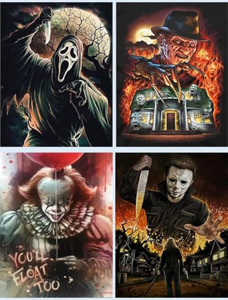 GemZono 4 Pack Diamond Painting Kits for Adults DIY 5D Diamond Art Paint with Round Diamonds Full Drill Horror Movie Gem Art Painting Kit for Home Wall Decor Gifts(12x16inch/30×40cm) 【Round diamond art kits】 5D Round Diamond Bits in Label Packaging, 1 Diamond Smudge Pen, 1 Wax for Picking Up Diamonds with Smear Pen, and 1 Tray for Placing Diamonds with 18 Pieces per Diamond Point Sparkling faceted, high quality acrylic diamonds are colorful and bright! 【Easy operation】The diamond art numbers and symbols on the HD canvas are clear and easy to read, you can easily complete the painting according to the steps, you can get about 30% extra beads in each color to prevent the diamond shortage. The drill sticks to the canvas effortlessly and the diamond holds up well and doesn't fall off. 【Round Full Drill Diamond Painting Design】: Full drill means that all patterns are covered by diamonds. Stitch diamond painting kits for adults are round. Which makes the finished stitch diamond art look more sparkly and dimensional. 【Add Fun To Life】: DIY 5D diamond stitch kit is very easy to make and a great toy to enhance their hands-on ability and develop patience. Diamond art stitch It is also the best choice for adults, it can make you feel calm, and it is also the best choice to kill time. Stitch diamond paintings can also be used as holiday gifts for family and friends. 【Best Gift & Artistic Home Decor】This is a set of out-of-the-box DIY tools.You could use it perfectly for housewarming gift,birthday gift,Thanksgiving Day gift,Christmas presents.The finished gem painting can be framed and perfectly decorated in any indoor location,such as bedroom,living room,office, bedside,kitchen,etc.which can add more fun to your life. 【After Sales Services】: We have been specializing in producing diamond paintings for many years, and we have always used the best materials in the industry. We provide you with a 30-day after-sales service (including free replacement of missing accessories or returns and exchanges). If you have any questions, you can always contact our customer service, we promise to reply you within 24 hours. Please buy with confidence. Shipping We offer FREE shipping on all orders! We ship within Three business days of payment, usually sooner. We use a selection of shipping services such as UPS, FedEx, USPS etc. We only ship to the lower 48 states, no APO/FPO addresses or PO Boxes allowed. Local pickups and combined shipping options are not provided at this time. Return You can return a product for up to 30 days from the date you purchased it. Any product you return must be in the same condition you received it and in the original packaging. Please keep the receipt. Feedback Customer satisfaction is very important to us. If you have any problem with your order, please contact us and we will do our best to make you satisfied. Contact Us If you have any queries, please contact us via ebay. We usually respond within 24 hours on weekdays. Please visit our eBay store to check out other items for sale! Thank you for shopping at our store.