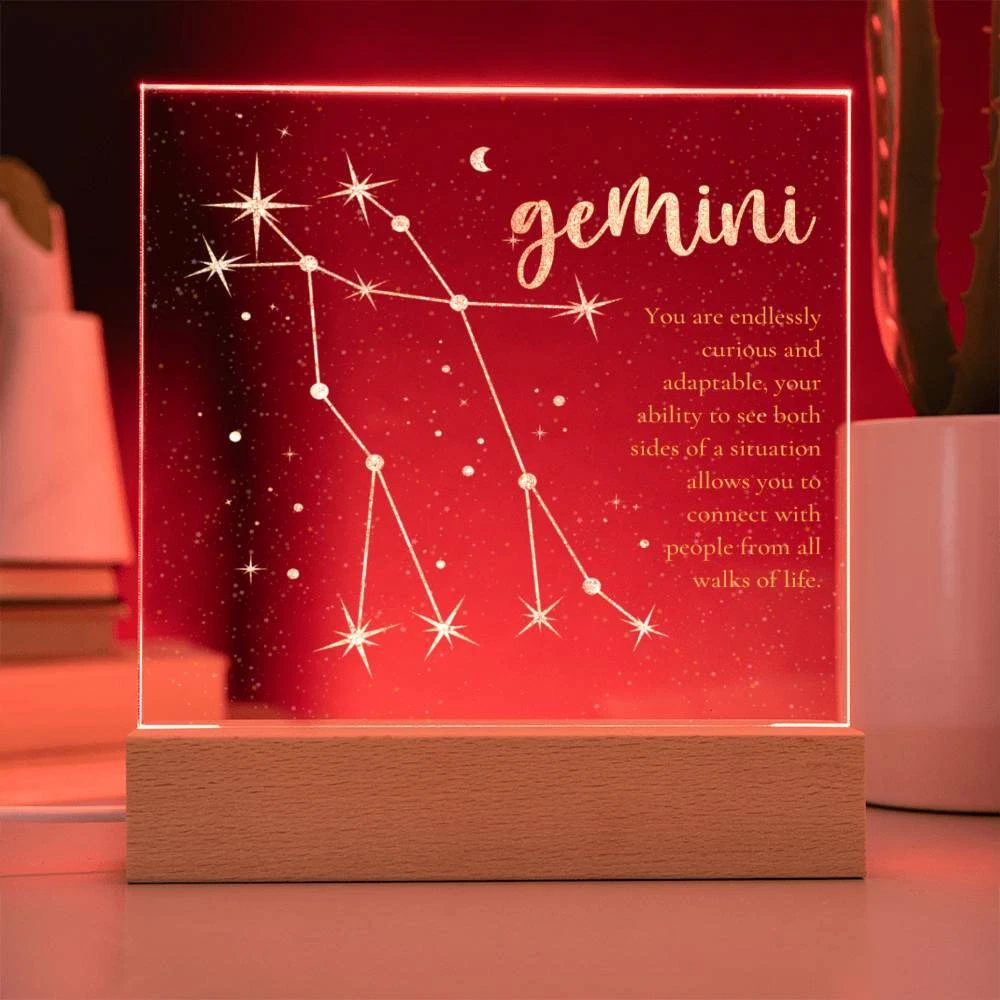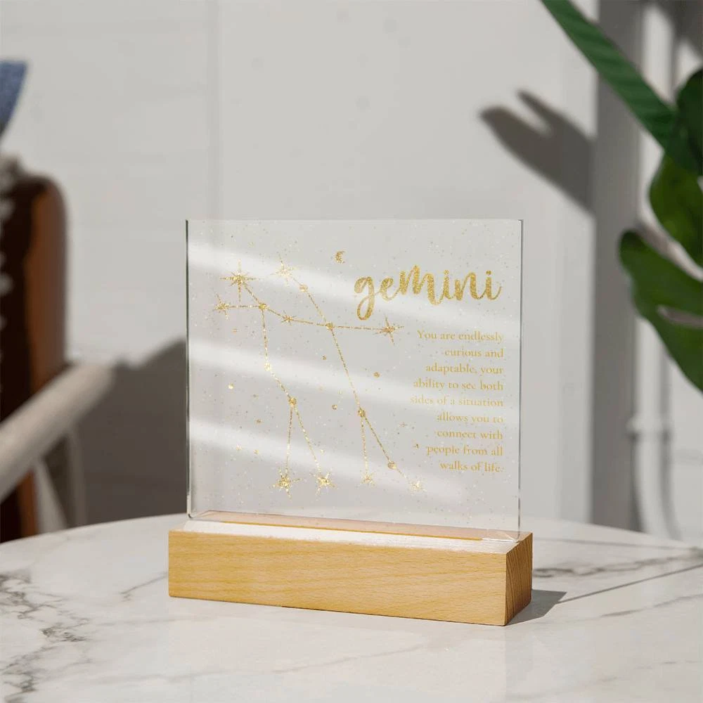 Gemini zodiac lighted acrylic plaque Gemini You are endlessly curious and adaptable. your ability to see both sides of the situation allows you to connect with people from all walks of life. Optionally add a name and/or date below text Combine modern technology and a heartfelt message with our Square Acrylic Plaque ! This design is printed on crystal-clear premium acrylic and easily becomes the centerpiece of any room. And the contemporary design wouldn't be complete without its sleek wooden base, elevating the display that will instantly become a conversation starter. Create a memorable presentation when you upgrade to the LED wooden base! This is the ideal present for your beloved partner, family members, or dear friends on special occasions like anniversaries, birthdays, or any occasion where you want to express your love and appreciation in an unforgettable way. Let your loved ones know how much they mean to you by purchasing today! Your plaque will be made from high quality acrylic and will feature a professionally printed design. This present makes for a truly unique and sentimental gift that will be treasured for years to come! Product specifications: Premium acrylic Size with wooden base: 6.5" (165mm) height x 5.9" (150mm) width Acrylic Depth: 0.1" (5mm) Wooden base: 1.2" (30mm) height x 5.9" (150mm) width x 1.8" (45mm) depth (Optional) Wooden base with colorful built-in LED lights Sharp, detailed printed design Each order is lovingly packaged and ready to be cherished for a lifetime!