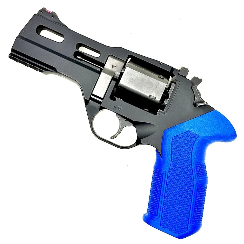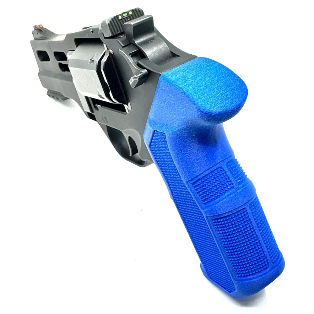 The Gen 3 Tactical Grip for the Chiappa Rhino is the culmination of continuous improvement and new design and manufacturing technologies and techniques. Available in an array of colors, the Gen 3 retains and enhances the simplicity and 1911-style, natural grip angle of the Gen 1, and the ergonomics and lock-in grip of the Gen 2. An all-new "Pyramid" texture pattern is introduced that provides an aggressive yet comfortable grip, even with wet hands. The beavertail is extended beyond the Gen 2 and provides hammer and cylinder release access, and a sharp reduction of the butt of the grip improves concealment. A new ambidextrous shooting-hand thumb-shelf adds solid positioning while two-hand shooting. Manufactured in the USA from high-strength and UV- and water-resistant glass fiber-infused materials, the Gen 3 Tactical Grip for the Chiappa Rhino is the perfect solution to provide maximum comfort and performance, maintaining and enhancing the aesthetic and space-age look of the Rhino. The Gen 3 Tactical Grip comes with a new 45mm grip screw and requires the use of the stock grip screw washer.
