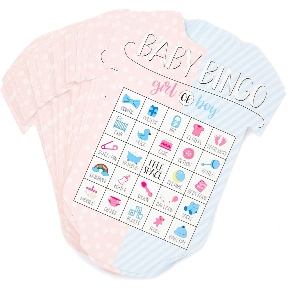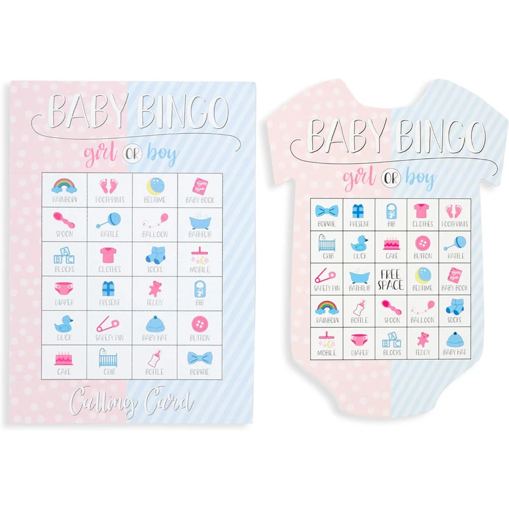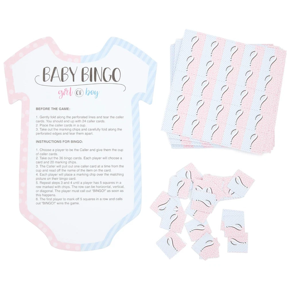 Gender Reveal Bingo Game Set, Party Supplies (38 Pieces) FUN FOR EVERYONE: Gender reveal bingo will be fun for adults of all ages. This game allows 36 players to play at once, so everyone can join in on the fun. PERFECT FOR: This bingo set is great for baby showers and gender reveal parties to get your guests in a festive mood MULTIPLE DESIGNS: Featuring 36 unique and colorful designs with corresponding baby clothes shaped cards caller chips HIGH QUALITY: Made from cardstock with single-side printing WHAT’S INCLUDED: Includes 36 bingo cards; 36 designs, 1 calling card, and game chips Product Description Gender reveal bingo will be fun for adults of all ages. This game allows 36 players to play at once, so everyone can join in on the fun. This bingo set is great for baby showers and gender reveal parties to get your guests in a festive mood.