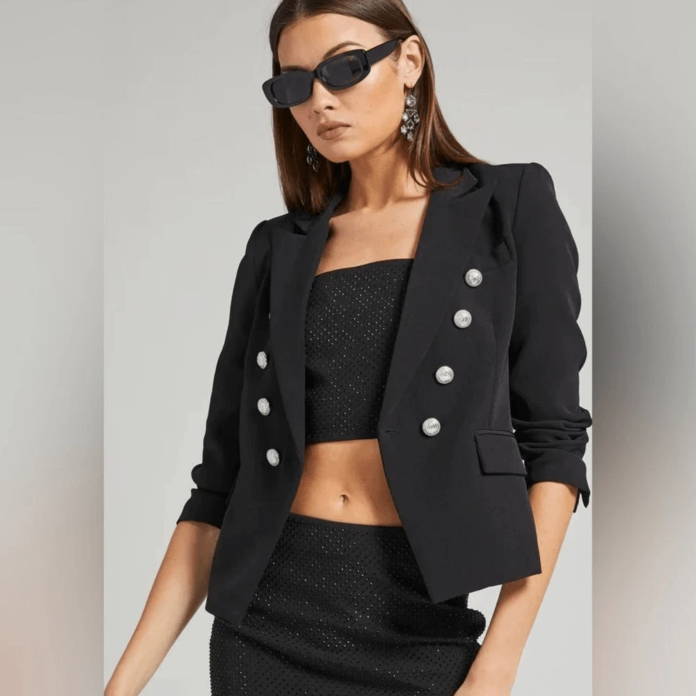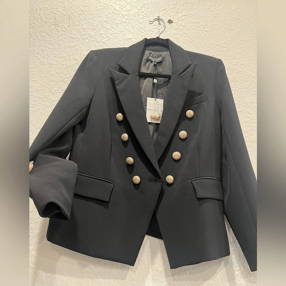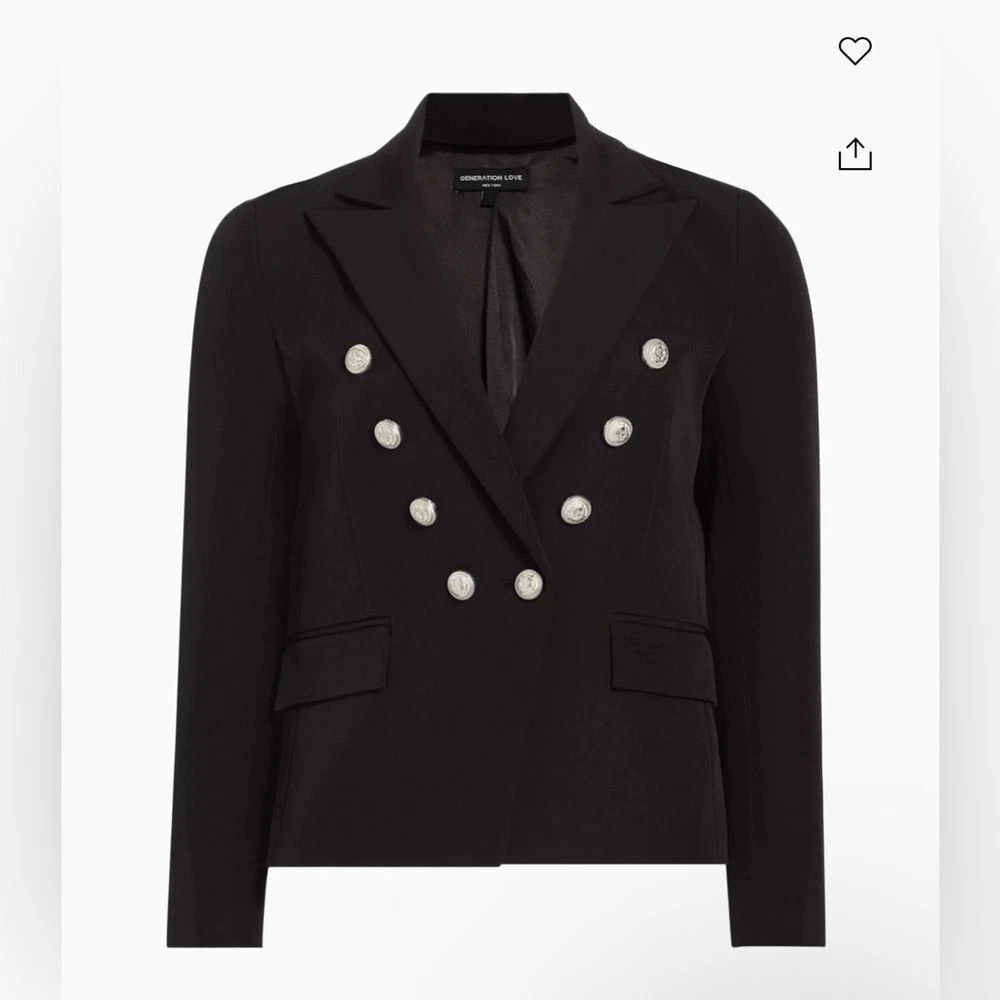 Generation Love's Delilah crepe blazer is tailored with engraved silvertone buttons set in a double-breasted design. Notch lapels Long sleeves, button cuffs Front flap pockets Button-front closure 95% polyester/5% spandex Lining: 95% polyester/5% spandex Approx 22" from shoulder to hem NWT, perfect condition
