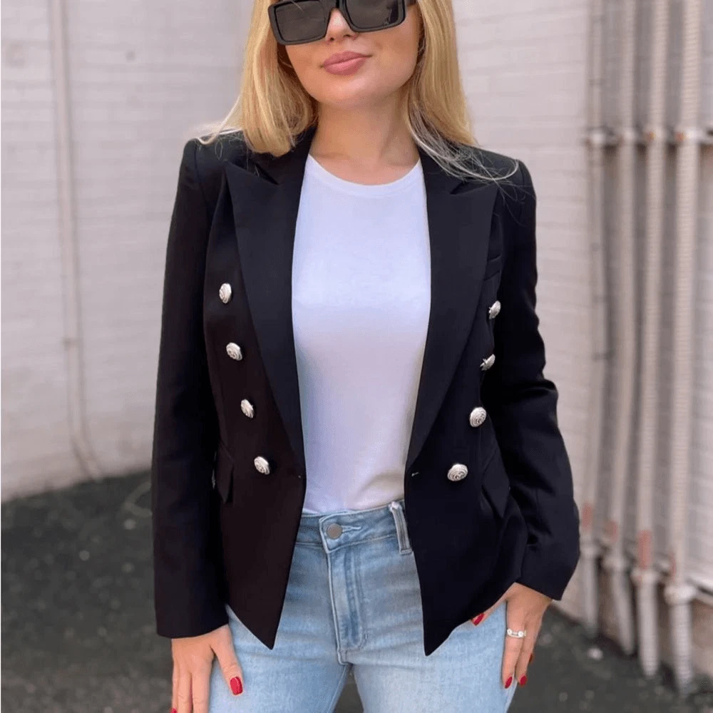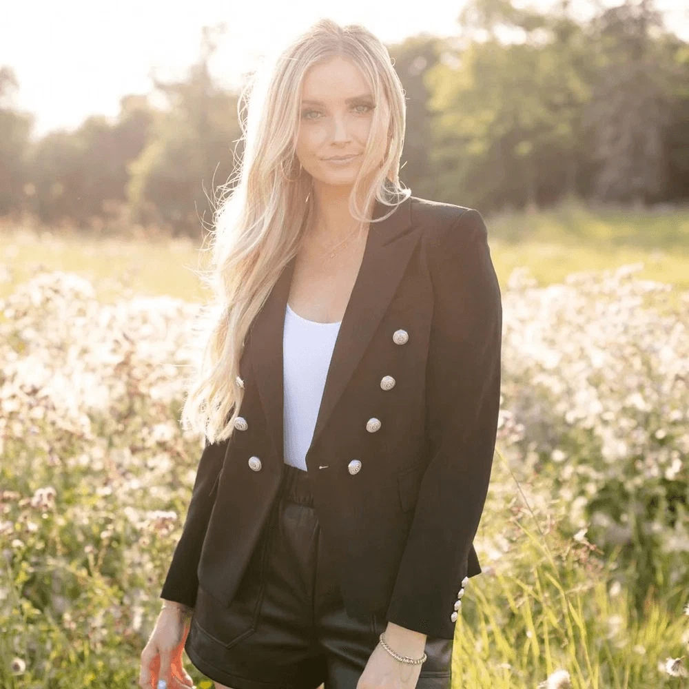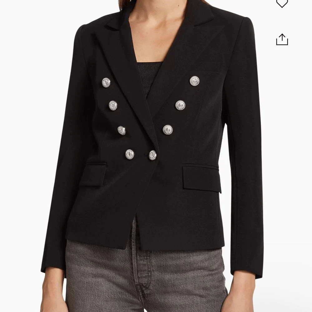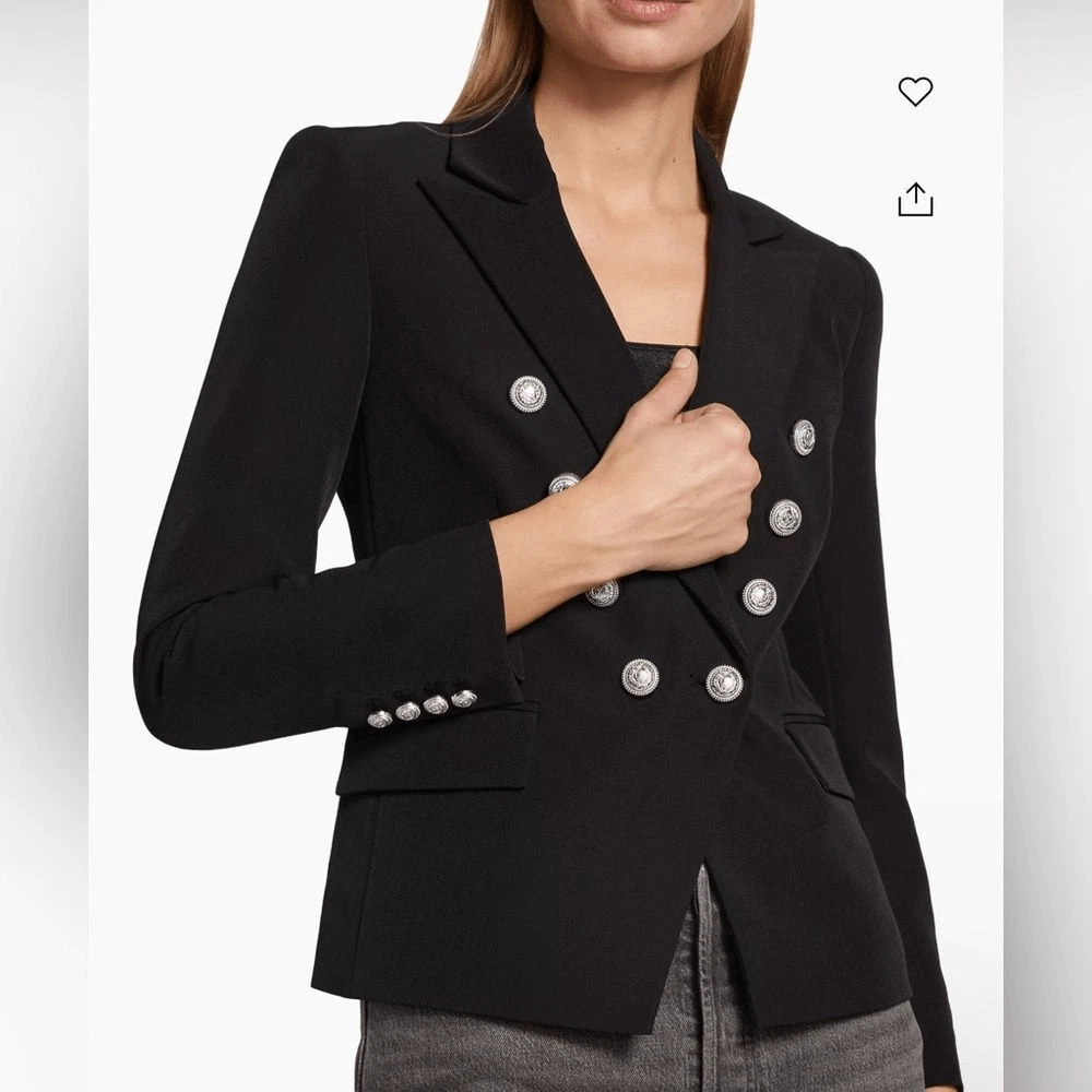 Generation Love's Delilah crepe blazer is tailored with engraved silvertone buttons set in a double-breasted design. Notch lapels Long sleeves, button cuffs Front flap pockets Button-front closure 95% polyester/5% spandex Lining: 95% polyester/5% spandex Approx 22" from shoulder to hem NWT, perfect condition
