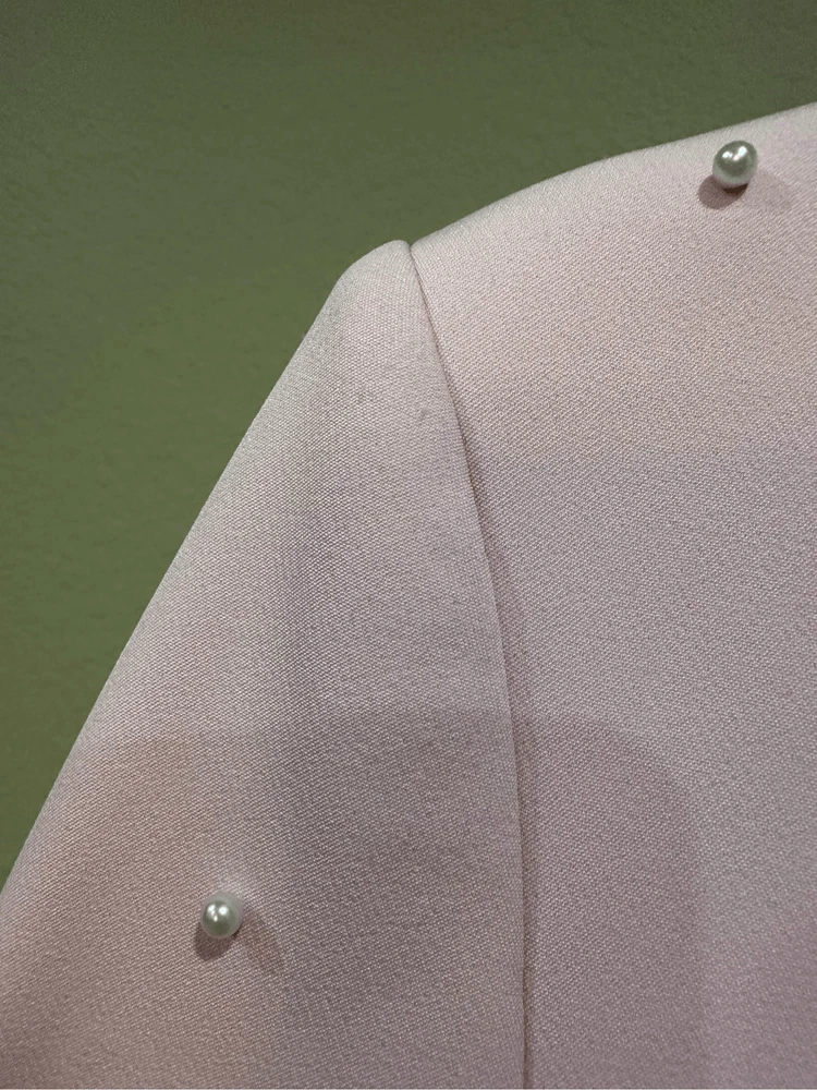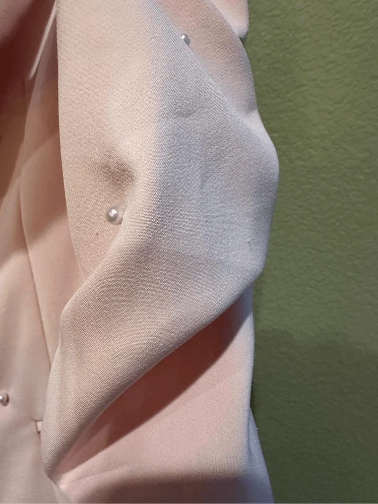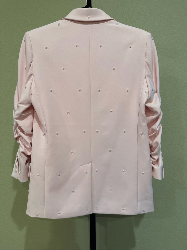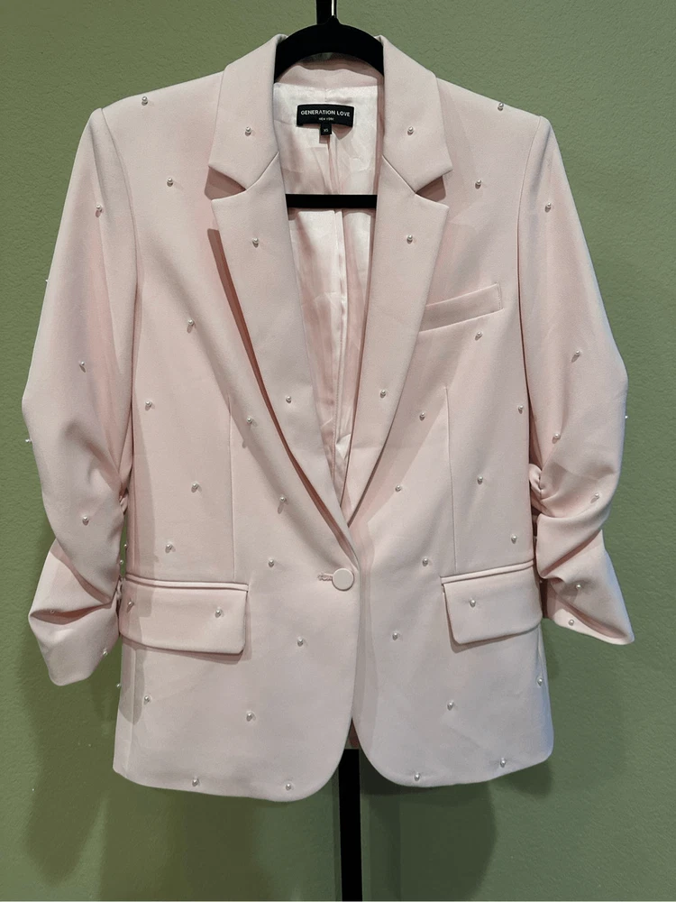 Generation Love Nadia Faux Pearl-Embellished Blazer in Pink Size XS Flaws: Dust spots, thread pulls, pillings and stains are noted. Professional dry cleaning service should be able to remove all dust spots and stains. Please view all images prior to making a purchase This is a sample piece, so it does not have a material or care tag. Cut in a single-breasted silhouette, Generation Love's Nadia blazer is decorated with shirred three-quarter-length sleeves and beaded faux pearl detailing. Notch lapels Three-quarter-length sleeves, button cuffs Chest welt pocket Waist flap pockets Round front hem Back vent Faux pearl trim Single-breasted button-front closure 95% polyester/5% spandex Lining: 95% polyester/5% spandex Dry clean Approximate measurements laying flat: PTP: 17” Length front: 26” Arm: 20” Slight color variation due to lighting