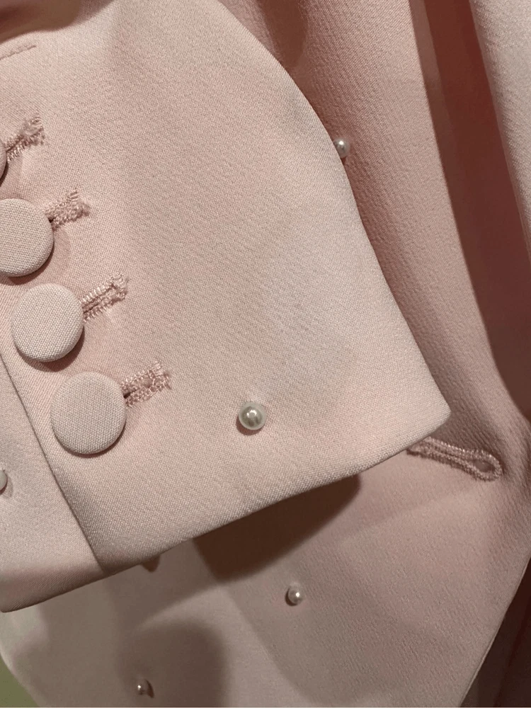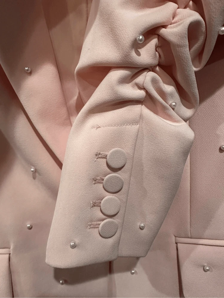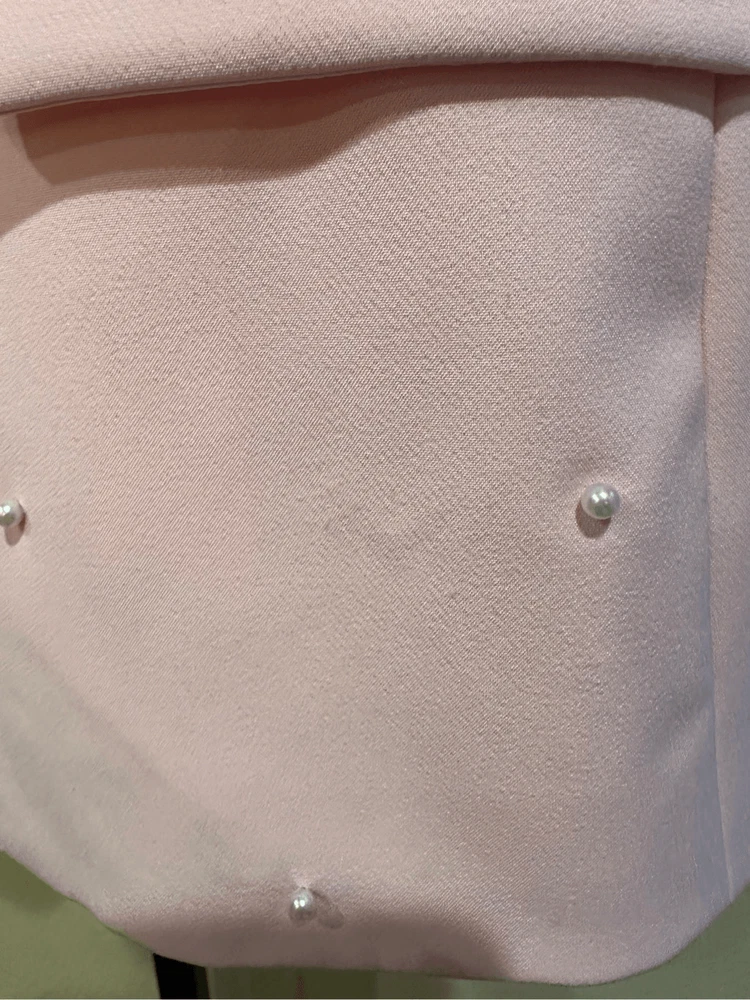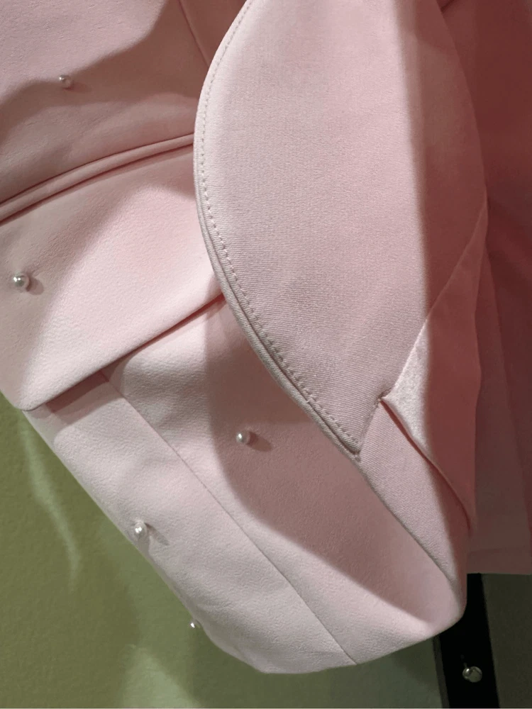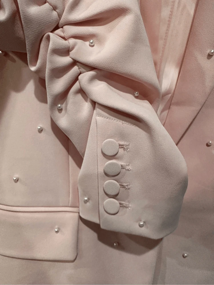Generation Love Nadia Faux Pearl-Embellished Blazer in Pink Size XS Flaws: Dust spots, thread pulls, pillings and stains are noted. Professional dry cleaning service should be able to remove all dust spots and stains. Please view all images prior to making a purchase This is a sample piece, so it does not have a material or care tag. Cut in a single-breasted silhouette, Generation Love's Nadia blazer is decorated with shirred three-quarter-length sleeves and beaded faux pearl detailing. Notch lapels Three-quarter-length sleeves, button cuffs Chest welt pocket Waist flap pockets Round front hem Back vent Faux pearl trim Single-breasted button-front closure 95% polyester/5% spandex Lining: 95% polyester/5% spandex Dry clean Approximate measurements laying flat: PTP: 17” Length front: 26” Arm: 20” Slight color variation due to lighting