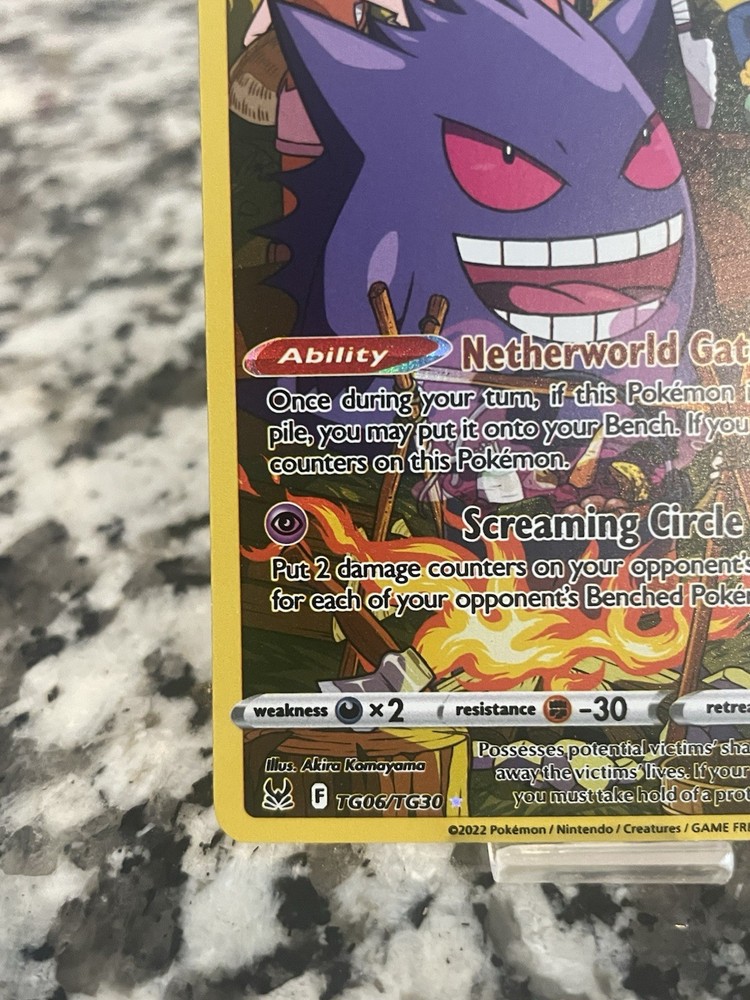 The Gengar TG06/TG30 Swsh11: Lost Origin Trainer Gallery Holo is a highly sought-after ultra rare Pokémon card featuring the popular Gengar character. Illustrated by Akira Komayama and manufactured by The Pokémon Company, this Stage 2 Pokémon card has a shiny holo finish and is in near mint condition. Perfect for collectors and players alike, this English-language card has a high HP of 120 and is a valuable addition to any Pokémon TCG collection. Please see pictures for condition! Feel free to contact for more info or pics, thanks!