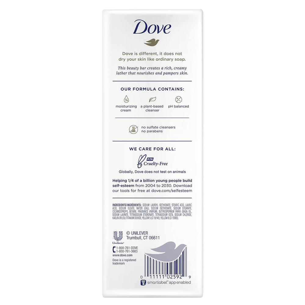 Beauty Bar Gentle Skin Cleanser Moisturizing for Gentle Skin Care Shea Butter Product Details LOCK IN MOISTURE. Dove Shea Butter Beauty Bar is a moisturizing, gentle cleanser that has the warm, comforting scents of shea butter and vanilla EFFECTIVE CLEANSER. Gently wash away dirt and germs, for use every day on body, face, and hands. This Dove Beauty Bar creates luxurious lather and won’t dry your skin like ordinary bar soaps DERMATOLOGIST RECOMMENDED. Formulated with ¼ moisturizing cream, Dove moisturizing Beauty Bar and gentle skin cleanser leaves skin instantly soft and smooth with lasting nourishment VERSATILE CLEANSER. The unique formulation for effective skin care can be enjoyed by the entire family as this all-in-one cleanser nourishes your face, body, and hands for beautiful skin THOUGHTFULLY MADE. This Beauty Bar is Certified Cruelty-Free by PETA and made with sulfate free cleansers, so you can feel good about switching from ordinary bar soap to Dove Beauty Bar We believe that cleansing should be an opportunity for you to take a few moments just for yourself. That’s why we created the pampering Dove Shea Butter Beauty Bar, an indulgent Dove Beauty Bar that has the warm, comforting scents of shea butter and vanilla. Formulated with Dove’s gentle cleansers and 1/4 moisturizing cream, the Shea Butter Beauty Bar leaves skin feeling soft and smooth and looking radiant. A gentle cleanser that cares for your skin as you cleanse, Dove Beauty Bar helps deliver nourishment and leave your face and body feeling soft and smooth and looking more radiant than an ordinary bar soap does. Use your Beauty Bar as a facial cleanser or as a gentle skin cleanser for your body and hands. For best results, rub your Dove Shea Butter Beauty Bar between wet hands and massage the smooth, creamy lather over your skin before rinsing thoroughly. With beautiful blends of skin-loving ingredients, Dove cleansing skin care products create a rich lather with soothing scents that create a relaxing experience that will leave both you and your skin feeling balanced, renewed, and nourished. At Dove, our vision is of a world where beauty is a source of confidence, and not anxiety. Our mission is to help the next generation of women develop a positive relationship with the way they look, helping them raise their self-esteem and realize their full potential. Item model number 10011111020884 Item dimensions L x W x H 13.5 x 8.63 x 3.44 inches Product Dimensions 13.5 x 8.63 x 3.44 inches; 1 Pounds Country of Origin USA Item Weight 16 ounces Age Range (Description) Adult Scent Shea butter Size 3.75 Ounce (Pack of 14) 8.63 inches x 13.5 inches x 3.44 inches. Weight: 16.0 oz Payment Details We accept all payments via Ebay using Credit Cards , PAYPAL , Apple Pay and many others Shipping Details We are always working hard to ensure your package arrives as soon as possible. Please understand that some factors like weather, high postal traffic, and the performance of shipping companies are outside of our control. Delivery & Return Policy Details We offer a 30-Day Return Policy on items in which you are not completely satisfied with. You have the option of a full-refund or an exchange of the item. No returns are available on items shipped outside of the USA.
