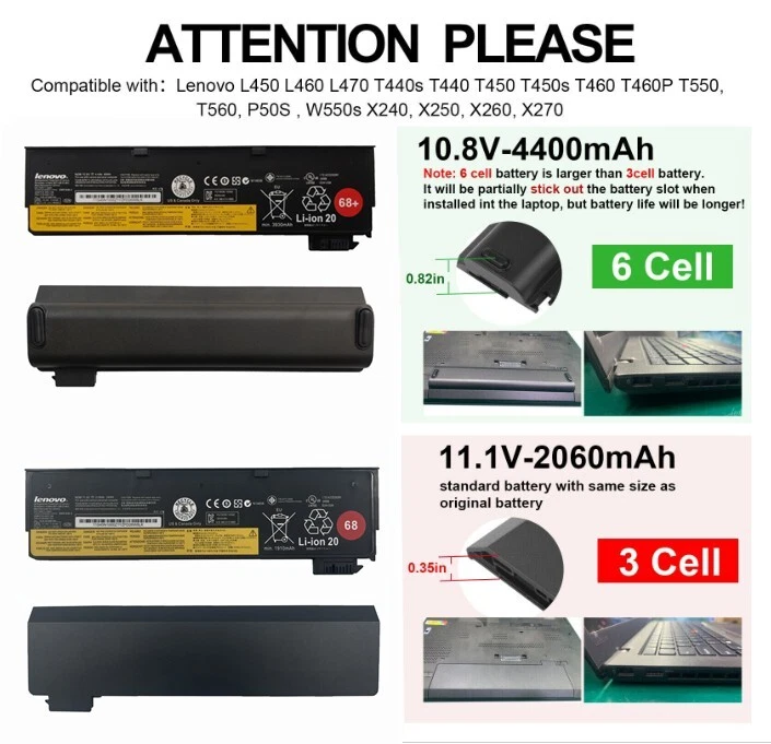 Item Specification: Battery Type: Li-ion Voltage: 11.4V Capacity: 24WH Condition: Brand New Compatible Part Numbers: ASM P/N 45N1124 FRU P/N 45N1125 ASM P/N 45N1126 FRU P/N 45N1127 ASM P/N 45N1132 FRU P/N 45N1133 FRU P/N 45N1775 31CP7/38/65 LC P/N 121500146 LC P/N 121500147 LC P/N 121500152 Compatible Models: Lenovo ThinkPad P50S W550s Lenovo ThinkPad L450 L460 L470 Lenovo ThinkPad X240 X250 X260 X270 Lenovo ThinkPad T440s T440 T450 T450s T460 T460P T550 T560 NOTE:doesn't fit for ThinkPad T460s, T470 , T470s -FAQ: 1.Q:why battery don't hold a charge, how to fix it? A:this is new battery,for first use, we suggest buyer: Remove the battery for a while Install battery and full charge it by ac adapter Leave charger and let the battery drain to shut off Repeat above charging and discharging at least 2 times. you charge the battery when power lower than 20%. If available, connect ac charger when doing computer work. If run the battery shut down often, it will shorten the battery life. 2.Q:battery can't charge fully,how to fix it? A: Remove the battery for a while Install battery and full charge it by ac adapter Leave charger and let the battery drain to shut off Repeat above charging and discharging at least 2 times. 3.Q:Battery can't be recognised by my laptop, do i need exchange a new one, A:we met this issue before, maybe beacuse of your laptop system, we suggest you can: Remove all battery drivers Remove battery Connect laptop using AC charger, double check no battery drivers installed Connect battery Drivers will install automatically Full charge the battery by ac adapter Leave charger and let the battery drain to shut off Repeat full charge and full discharge about 2 times. if still not be solved, please contact us and exchange a new one. 4:Q:Battery dies suddenly at about 20%, do i need to recalibrate? A:Kindly check the battery settngs and BIOS,do reset something, then: Remove the battery for a while Install battery and full charge it by ac adapter Leave charger and let the battery drain to shut off Repeat above charging and discharging at least 2 times points for attention ? 1. Discharge the new battery use to 5%(not to 0%) and then charge to 95%, and cycle 3-4 times. 2. Do not disassemble, crush or puncture. Do not dispose of in fire or water. 3. If you remove battery for a long time, charge more than 80% at least one time within one months. 4. Don't connect adapter for a long time while using the battery. It may damage the battery. 5. When using the battery, care should be taken to prevent exposure and moisture. Returns & Warranty: Returns & Warranty: Payment&shipping: 1. We can accept Paypal payment only 2. We ship out items to buyers paypal confirmed address from New Jersey via USPS. Please verify your shipping address carefully before checkout, since it can not be changed after order placed. 3. Items are shipped directly from our US warehouse normally within 24 hours after payments are received. Orders placed on weekend will be shipped within 2 days 4.We use USPS/UPS/FedEx to ship goods. usps does not require shipping charges, but due to some addresses where usps cannot be delivered, the seller is requested to make their own choices based on their own situation. If usps cannot be delivered due to address reasons, they will be returned Freight refund will be deducted, please note to buyers 5.If the tracking information indicated the item is delivered but you still do not receive it .Please check your mailbox carefully or ask your neighbours or someone you know maybe they have received it for you or check in your local post office first.If the tracking information still shows not delivered after 7 days you pay for it ,please contact us via ebay message ,we can arrange resend or refund you soon . Any problems please contact us .Thanks so much . Returns & Warranty: 1. 30 days money back guarantee .If you are not satisfied with our item or do not need it any more ,you should contact us within 30 days after you receive the item .We will resend or refund you immediately if it is the problem of our items . 2. One-year warranty. If the item has any problems after 30 days you receive it , your purchase will be covered by one year warranty .You can contact us via ebay message to tell us the exact problem with the item ,then we can give you our best suggestion according to our experience or resend you a new one to solve the problem for you as soon as we can . 3. Free return .If your item is defective within three months after you receive it and it is actually the item's problem ,we can provide you a return label or RMA# to help you return it for free . 4.If the item doesn't work properly , please do not worry ,Please click " Contact seller " via ebay message before you open and case or return request or leave any bad feedback .We will respond to you immediately and solve your problem as soon as we can .We believe good communication can work out any problems .Please believe us . 5. All return products should be in original package with all accessories included. 6. We shall pay much attention to your order and will do our best to solve any problem in a good business manner. 7.If you order a wrong one ,Please contact us .We will help you find the right one ,if we also have it for sell ,we can exchange it for you .But you need to pay for the return shipping cost .Hope you can understand . Feedback ? Your better comments will be an encouragement for us to offer the better quality and the better service in future.If you are satisfied with our service or product ,could you please leave us the 5 star positive feedback? Thank you so much . If you are not satisfied with them, please contact us first via Ask a Question or via Contact Seller before leave a feedback . Your messages will be answered within 24 hours. We shall try our best to solve your problem to your satisfaction.