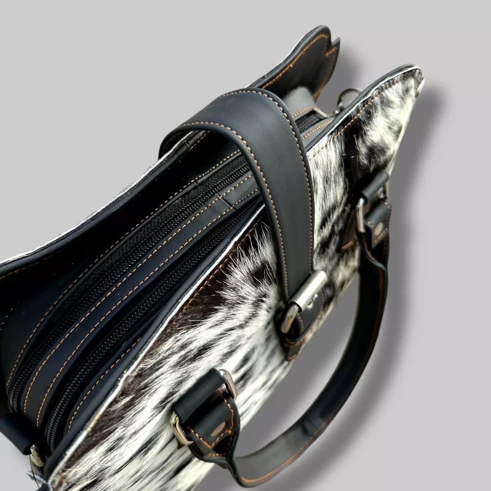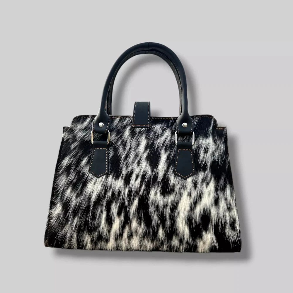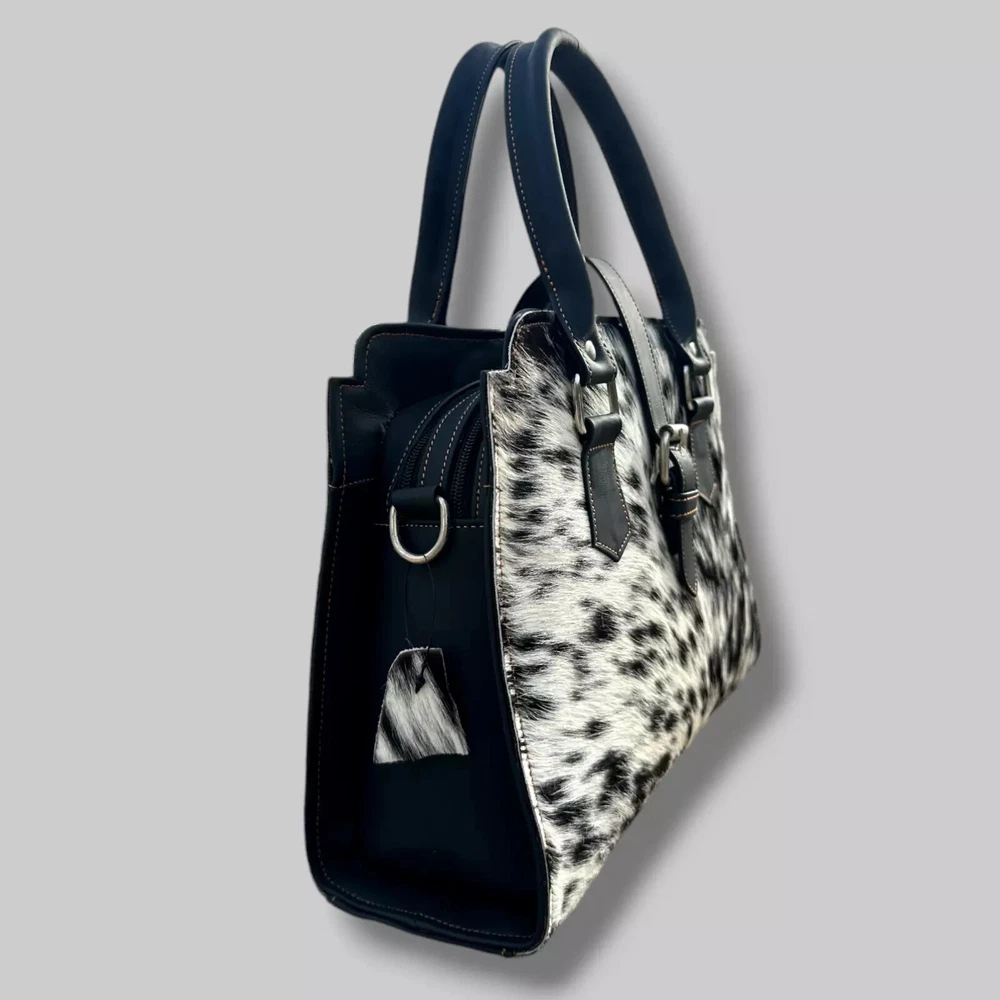 Genuine Black Cowhide Leather Tote Bags Women Shoulder Purse Handbags Lady Bag Colors Pattern may vary slightly as it is 100% original Natural Cow Hide Skin. Description Bag size Width: 14 inches Height: 8 inches Depth: 4 inches Flexible Adjustable Strap Main Compartment 2 zipper Pockets 1st Main Compartment (inside 2 Pockets) 2nd Main Compartment (inside 1 zipper pocket) Colors Pattern may vary slightly as it is 100% original Natural Cow Hide Skin. Introducing our Natural Cow Hair on Leather Tote Bag – a stunning blend of style and substance that will elevate your everyday look. Crafted with genuine, high-quality natural leather, this women's handbag exudes timeless elegance while offering exceptional durability. The contrasting mix of cow hair panelling adds a touch of unique sophistication, making it a must-have accessory for fashion-forward individuals. Whether you need a chic shoulder bag or a spacious shopping companion, our lightweight design ensures comfort without compromising on style. Elevate your fashion game with this versatile and eco-friendly natural leather tote bag. Colors Pattern may vary slightly as it is 100% original Natural Cow Hide Skin. Experience the epitome of luxury with our handcrafted Natural Cow Hair on Leather Tote Bag. Created to charm and inspire, this women's handbag is meticulously crafted from premium natural leather, ensuring longevity and a touch of timeless beauty. The exquisite cow hair detailing further enhances its allure, making it an ideal choice for any occasion. The well-designed shoulder straps offer utmost comfort, allowing you to effortlessly carry your essentials in style. Whether you're heading to the office or embarking on a shopping spree, let this lightweight and versatile tote bag be your fashionable companion. NOTE: Colors may vary slightly from original due to individual monitor color settings and/or light conditions when photographed. Colors Pattern may vary slightly as it is 100% original Natural Cow Hide Skin. Delivery: We'll deliver your order via DHL / FEDEX / USPS at your door step. Returns & Exchanges: Hassle Free Returns and Exchanges. Colors Pattern may vary slightly as it is 100% original Natural Cow Hide Skin.