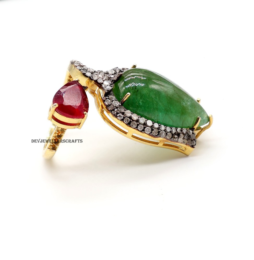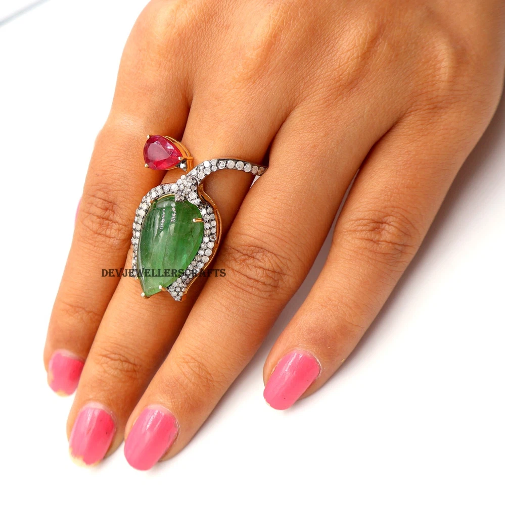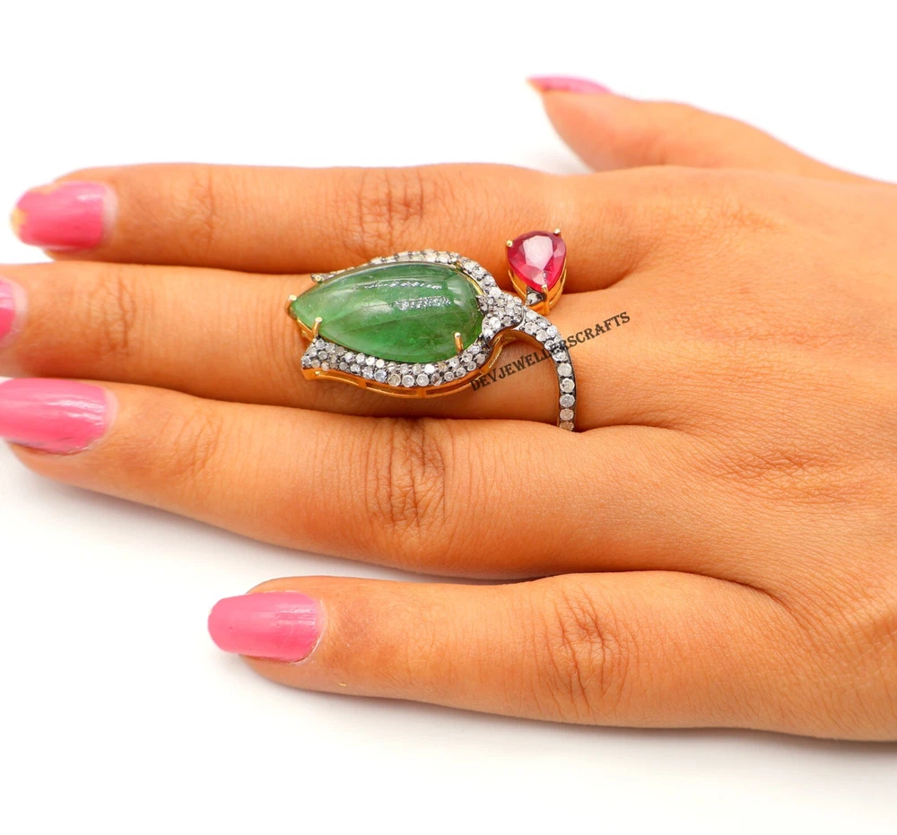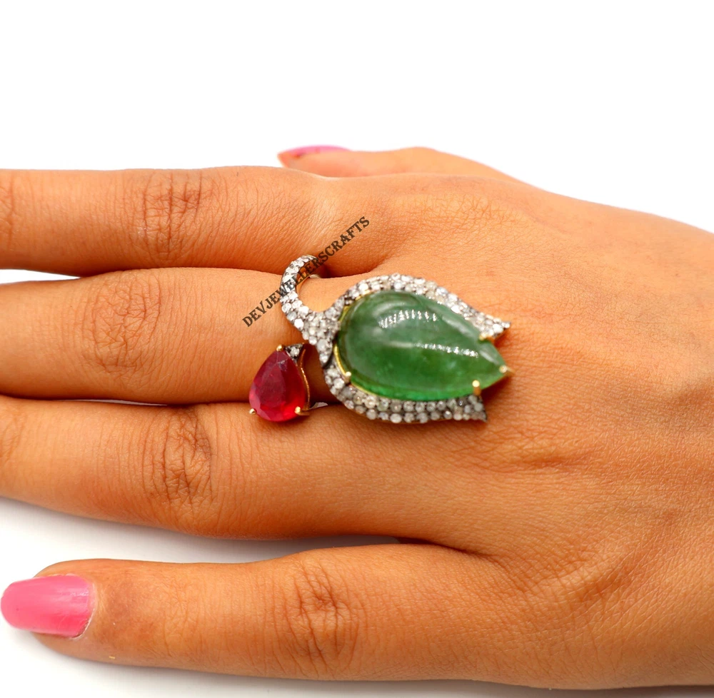 Seller Warranty: Yes Ring Size: All Size Available Base Metal: Silver Theme: Beauty, Fashion & Costumes, Love, Luck Main Stone: Emerald Antique: Yes Type: Ring Country/Region of Manufacture: India Occasion: Anniversary, Birthday, Engagement, Wedding Era: Art Nouveau (1895-1910) Diamond Clarity Grade: Included (I1) Gemstone Clarity Grade: Eye Clean Customized: Yes Main Stone Treatment: Not Enhanced Colored Diamond Intensity: Fancy Handmade: Yes Wholesale: Yes Material: Stone Signed: Yes Main Stone Creation: Natural Secondary Stone: Pave Diamond, Ruby Metal Purity: 925 Sizable: Yes Diamond Color Grade: I Brand: Victorian Style: Cocktail Main Stone Shape: Pear Personalize: Yes Main Stone Color: Green Seller Notes: “Genuine Emerald & Ruby Gemstone 925 Sterling Silver Pave Diamond Ring Jewelry.” Color: Gold Shape: Flower Setting Style: Prong Vintage: Yes Cut Grade: Excellent Country of Origin: India Metal: Sterling Silver