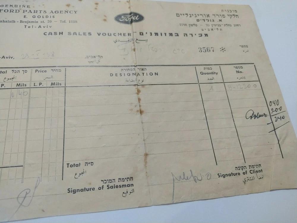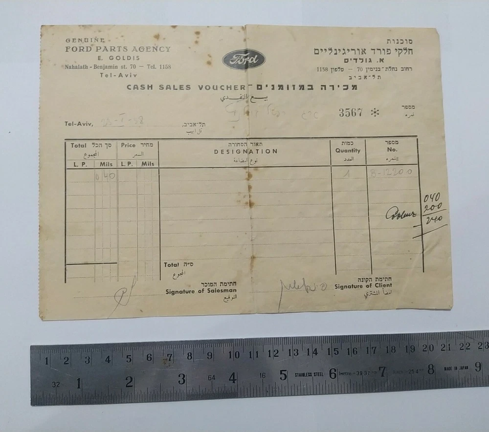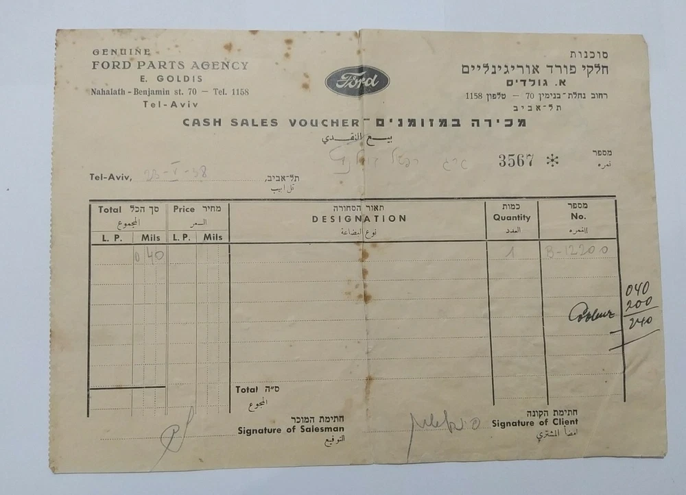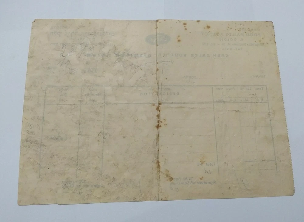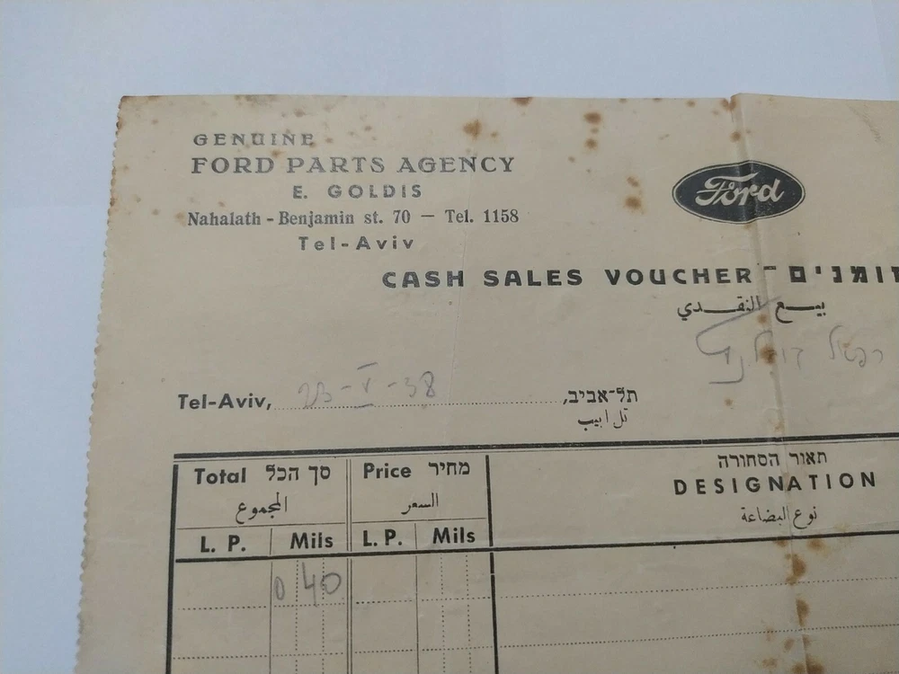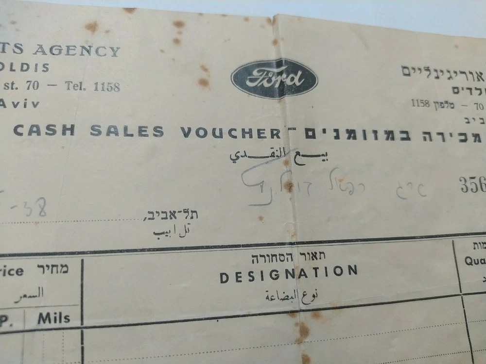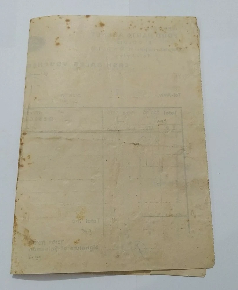 Genuine Ford Parts Agency Palestine cash sales voucher Tel Aviv 1938 Hebrew jew Hebre w Scare and rare! Museum item! See photos to see the situation! There are slight tears and defect,torn As is! there my be scatches and use signs on my items, they are used! see pictuers before buying! as is ! what you see is what you get! no returns! free register shipping! send me messages if you have a offers/questions