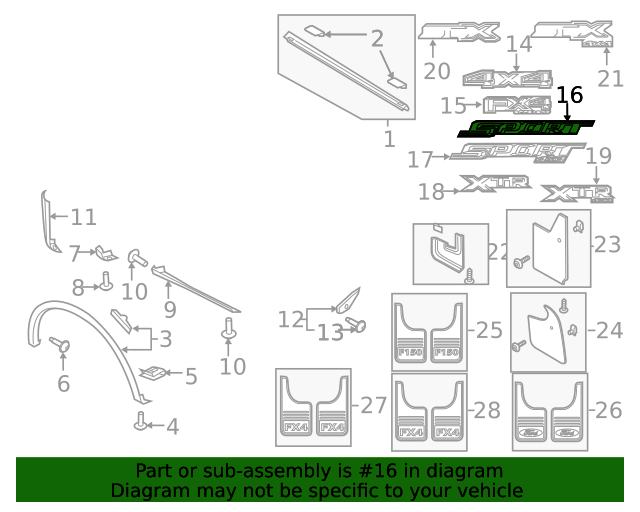 Hiller Parts Department Genuine Ford Truck Bed Decal FL3Z-9925622-CA Part can be found as # 16 in the diagram above Product Description 8 foot box, body side, sport. 5.5 foot box body side. "sport". Specifications Brand Ford Manufacturer Part Number FL3Z-9925622-CA SKU FL3Z-9925622-CA Product Genuine Ford Truck Bed Decal FL3Z-9925622-CA ONLY PART REFERENCE #16 ON THE DIAGRAM IS INCLUDED Terms and Conditions Thank you for shopping with us. Please find our policies below. If you have any other questions, please don't hesitate to contact us. Shipping Terms In stock orders ship within 24 hours. Weekend orders will be processed the next business day. If a part is not in stock and must be ordered from the manufacturer, it usually takes 2-3 days to arrive to us and will be promptly shipped to you. Most of the orders are shipped complete within 2-3 business days. A few of the parts ordered from the manufacturer may take up to 5-6 business days to arrive and will shipped to you immediately. Depending upon location, ground shipments usually take 2-7 days. Your order may be shipped Overnight for an additional cost. Oversized shipments will be additional; you will be contacted prior to shipping for approval. We cannot guarantee transit times for ground and oversize orders. Shipping Carrier substitutions may be made at our determination in an attempt to reduce shipping cost to the customer. In the unlikely event that a part has been placed on backorder or discontinued, we will do our best to try and find one for you as quickly as possible We do not ship COD orders. Return Policy Contact us to arrange for any returns. A copy of the invoice will need to be included with the return. Parts must be resaleable and in the original packaging. 20% restocking fee may be charged, if the return item is used or not sellable. We cannot take back used parts. We cannot take back installed or tried parts. Electrical parts are not returnable. We do reserve the right to refuse and return any parts we find have been installed, are used or do not meet the above criteria. Return request need to be within 30 days of receipt. Cancellation Policy An order or a portion of an order may be cancelled up until the time it is shipped and no longer in our possession. Home • Newsletter Signup • Contact Us Copyright © 2026 Hiller Parts Department , All rights reserved. Solution by RevolutionParts, Inc. :: Design by OCDesignsOnline
