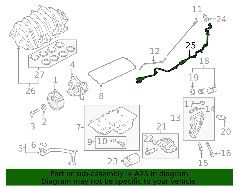 Hiller Parts Department Genuine Ford Wire JL3Z-6B018-P Part can be found as # 25 in the diagram above Product Description 5.0L, 2018-20. 5.0L, 2015-2017. Specifications Brand Ford Manufacturer Part Number JL3Z-6B018-P SKU JL3Z-6B018-P Product Genuine Ford Wire JL3Z-6B018-P Replaces FL3Z-6B018-B, FL3Z-6B018-E, JL3Z-6B018-E, JL3Z-6B018-G ONLY PART REFERENCE #25 ON THE DIAGRAM IS INCLUDED Terms and Conditions Thank you for shopping with us. Please find our policies below. If you have any other questions, please don't hesitate to contact us. Shipping Terms In stock orders ship within 24 hours. Weekend orders will be processed the next business day. If a part is not in stock and must be ordered from the manufacturer, it usually takes 2-3 days to arrive to us and will be promptly shipped to you. Most of the orders are shipped complete within 2-3 business days. A few of the parts ordered from the manufacturer may take up to 5-6 business days to arrive and will shipped to you immediately. Depending upon location, ground shipments usually take 2-7 days. Your order may be shipped Overnight for an additional cost. Oversized shipments will be additional; you will be contacted prior to shipping for approval. We cannot guarantee transit times for ground and oversize orders. Shipping Carrier substitutions may be made at our determination in an attempt to reduce shipping cost to the customer. In the unlikely event that a part has been placed on backorder or discontinued, we will do our best to try and find one for you as quickly as possible We do not ship COD orders. Return Policy Contact us to arrange for any returns. A copy of the invoice will need to be included with the return. Parts must be resaleable and in the original packaging. 20% restocking fee may be charged, if the return item is used or not sellable. We cannot take back used parts. We cannot take back installed or tried parts. Electrical parts are not returnable. We do reserve the right to refuse and return any parts we find have been installed, are used or do not meet the above criteria. Return request need to be within 30 days of receipt. Cancellation Policy An order or a portion of an order may be cancelled up until the time it is shipped and no longer in our possession. Home • Newsletter Signup • Contact Us Copyright © 2026 Hiller Parts Department , All rights reserved. Solution by RevolutionParts, Inc. :: Design by OCDesignsOnline