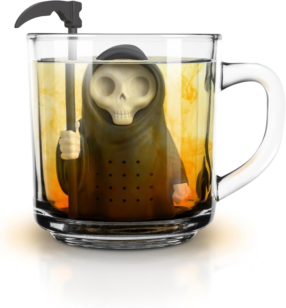 Genuine Fred Grim Steeper Reusable Silicone Tea Infuser, Black Black/White Product Details Material: Silicone Color: Black/White Shape: Variety Brand: Genuine Fred Item Weight: 100 Grams Number of Items: 1 Is Dishwasher Safe: Yes Manufacturer: Lifetime Brands Inc. Product Dimensions: 3.45 x 1.97 x 5.12 inches Item Weight: 3.53 ounces Item model number: 5309052 FUN AND FUNCTIONAL: Free your spirit with Fred’s Grim Steeper – a hauntingly clever tea infuser that is sure to take your breath away EASY TO USE: Steep into the afterlife! Simply fill with your favorite loose leaf tea, suspend his mighty scythe on the rim of your mug, and enjoy some soul soothing sips HASSLE FREE CLEANING: After use, discard the loose tea leaves and rinse with hot water; Genuine Fred silicone tea infusers are also dishwasher and microwave safe ECO FRIENDLY AND REUSEABLE: The dunk brew toss routine of normal tea bags contribute tons of waste to landfills and are not sustainable for our planet; Genuine Fred reusable silicone tea infusers for are the ideal, alternative! Add a touch of humor and personality to your tea time with the Genuine Fred Grim Steeper, a fun and functional tea infuser designed for tea lovers with a playful side. This clever kitchen gadget features a whimsical Grim Reaper design that makes brewing loose leaf tea a delightful experience. Simply fill the silicone figure with your favorite loose leaf tea, rest his iconic scythe on the rim of your mug, and watch as he patiently steeps your perfect cup. Whether you are enjoying a quiet moment alone or entertaining friends, the Grim Steeper adds a charming, conversation-starting twist to your daily routine. Crafted from high-quality, heat-resistant silicone, this tea infuser is both durable and safe for everyday use. It is BPA-free, ensuring that your tea remains pure and free from unwanted chemicals. The Grim Steeper is also microwave and dishwasher safe, making it as convenient to clean as it is fun to use. Designed by Fred Studio, this unique tea accessory comes packaged in a full-color, peggable gift box, making it an ideal present for birthdays, holidays, housewarmings, or any occasion that calls for a thoughtful gift for tea enthusiasts. Perfect for home, office, or as a lighthearted gift, the Genuine Fred Grim Steeper is more than just a tea infuser — it’s a creative way to bring joy to your tea breaks. Whether you’re steeping a soothing herbal blend or a bold black tea, this reusable silicone infuser delivers both style and functionality. Make your next cup a memorable one with the Grim Steeper, where every sip is a little more spirited.