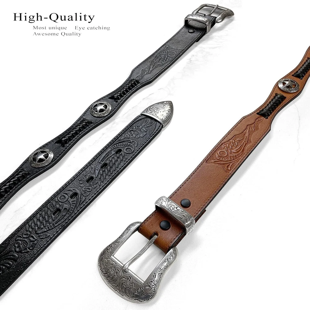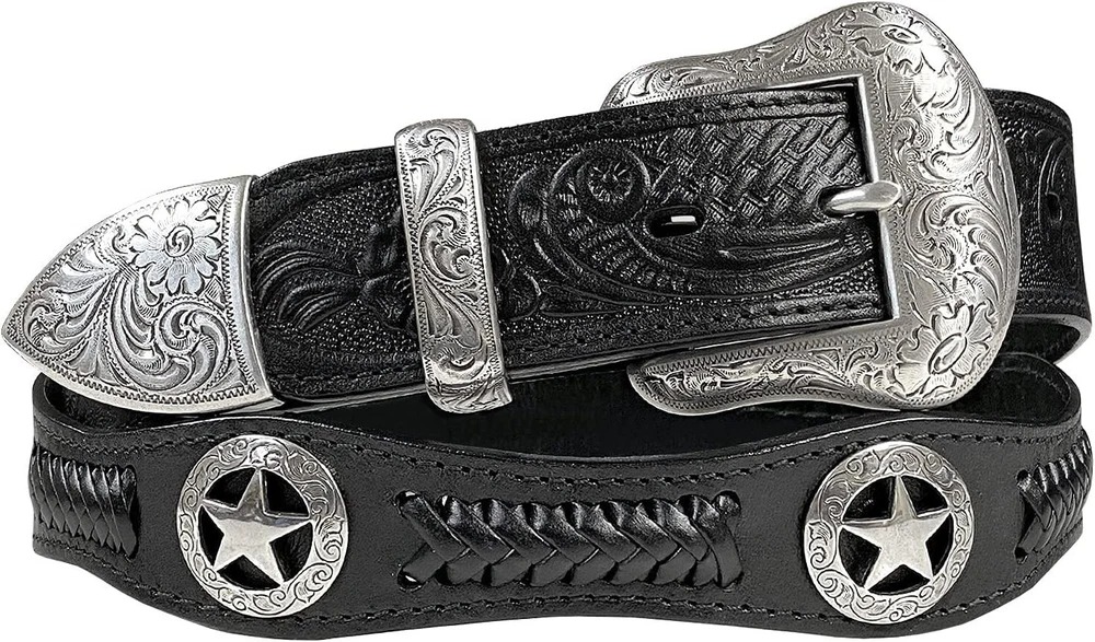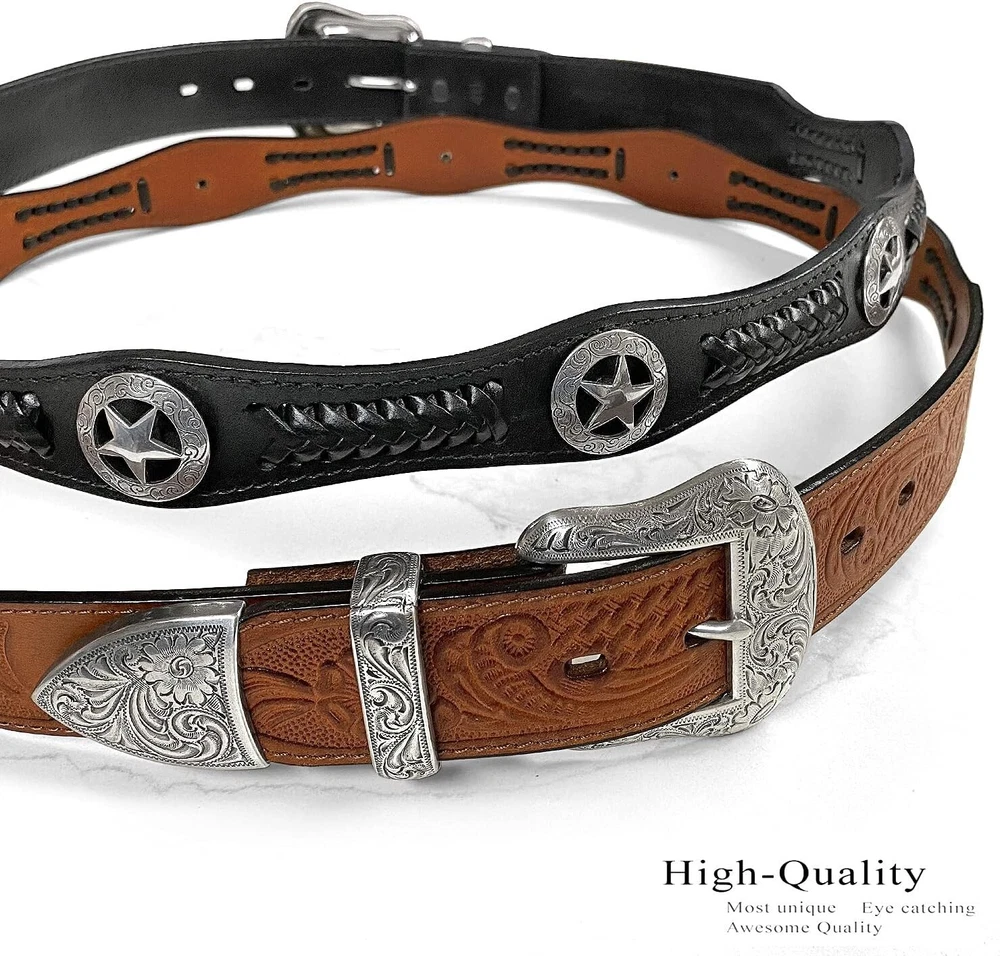 Hardware Material: Metal Belt Width: Western Leather Belt Handmade: Yes Material: Leather, Genuine Leather, Full Grain Leather, Cowhide Leather Style: Western Belt, Western Cowboy Style Belt Personalize: No Department: Men Size: 36 Brand: Unbranded Size Type: Regular Pattern: Floral Features: Adjustable, 5 Belt Holes, Convenient Snaps System, Interchangeable Buckles gtin13: Does not apply UPC: Does not apply Accents: Buckle, Antique Floral Engraved Buckle, Matching Conchos Type: Belt Color: Black