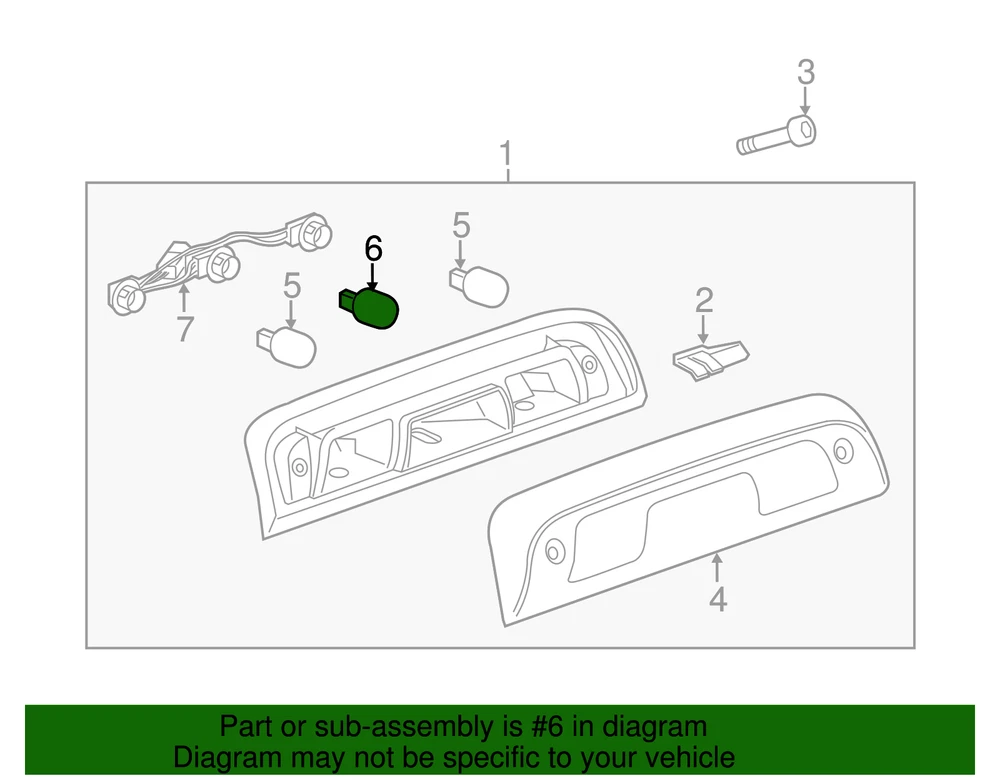 aaronchevrolet Genuine GM Brake and Center High Mount Brake Light Bulb 13503361 Part can be found as # 6 in the diagram above Product Description Canyon. High mount stop lamp. Regular cab, center. Provides illumination for visibility and convenience This GM Genuine Part is designed, engineered, and tested to rigorous standards and is backed by General Motors Specifications Brand GM Manufacturer Part Number 13503361 SKU 13503361 Product Genuine GM Brake and Center High Mount Brake Light Bulb 13503361 ONLY PART REFERENCE #6 ON THE DIAGRAM IS INCLUDED WARNING : May cause cancer and reproductive harm. See www.P65Warnings.ca.gov for more info. Terms and Conditions Thank you for shopping with us. Please find our policies below. If you have any other questions, please don't hesitate to contact us. Shipping Terms If you are located in Alaska, Hawaii or Puerto Rico Please contact us via eBay email to discuss shipping cost In stock orders ship within 24 hours. Weekend orders will be processed the next business day. If a part is not in stock and must be ordered from the manufacturer, it usually takes 2-3 days to arrive to us and will be promptly shipped to you. Most of the orders are shipped complete within 2-3 business days. A few of the parts ordered from the manufacturer may take up to 5-6 business days to arrive and will shipped to you immediately. Depending upon location, ground shipments usually take 2-7 days. Your order may be shipped Overnight for an additional cost. Oversized shipments will be additional; you will be contacted prior to shipping for approval. We cannot guarantee transit times for ground and oversize orders. Shipping Carrier substitutions may be made at our determination in an attempt to reduce shipping cost to the customer. We do not ship internationally. In the unlikely event that a part has been placed on backorder or discontinued, we will do our best to try and find one for you as quickly as possible. We do not ship COD orders. Return Policy Contact us to arrange for any returns. A copy of the invoice will need to be included with the return. Parts must be resaleable and in the original packaging. We cannot take back used parts. We cannot take back installed or tried parts. Electrical parts are not returnable. We do reserve the right to refuse and return any parts we find have been installed, are used or do not meet the above criteria. Return request need to be within 30 days of receipt. Cancellation Policy An order or a portion of an order may be cancelled up until the time it is shipped and no longer in our possession. Home • Newsletter Signup • Contact Us Copyright © 2025 aaronchevrolet , All rights reserved. Solution by RevolutionParts, Inc. :: Design by OCDesignsOnline
