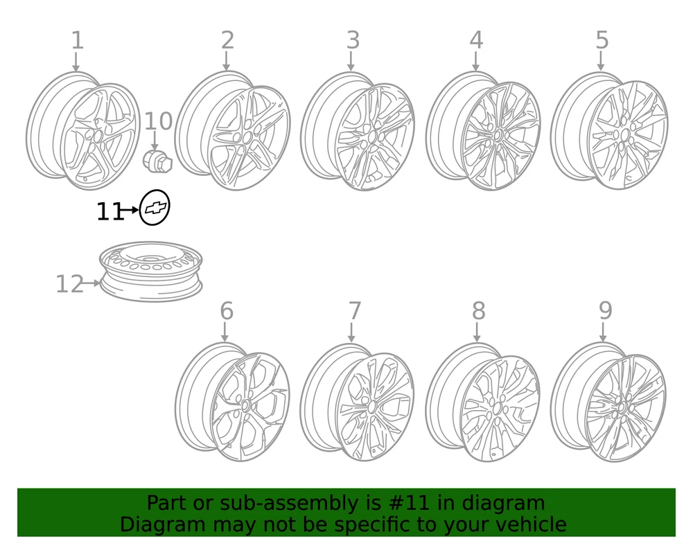 aaronchevrolet Genuine GM Button Style Center Cap with Bowtie Logo 22863943 Part can be found as # 11 in the diagram above Product Description Alloy wheels, chrome. Silver. Code: AAK4. Helps protect your vehicle's wheel hub, cv shaft (if equipped), and wheel fasteners from dust and moisture Helps enhance vehicle appearance This GM Genuine Part is designed, engineered, and tested to rigorous standards and is backed by General Motors Specifications Brand GM Manufacturer Part Number 22863943 SKU 22863943 Product Genuine GM Button Style Center Cap with Bowtie Logo 22863943 ONLY PART REFERENCE #11 ON THE DIAGRAM IS INCLUDED WARNING : May cause cancer and reproductive harm. See www.P65Warnings.ca.gov for more info. Terms and Conditions Thank you for shopping with us. Please find our policies below. If you have any other questions, please don't hesitate to contact us. Shipping Terms If you are located in Alaska, Hawaii or Puerto Rico Please contact us via eBay email to discuss shipping cost In stock orders ship within 24 hours. Weekend orders will be processed the next business day. If a part is not in stock and must be ordered from the manufacturer, it usually takes 2-3 days to arrive to us and will be promptly shipped to you. Most of the orders are shipped complete within 2-3 business days. A few of the parts ordered from the manufacturer may take up to 5-6 business days to arrive and will shipped to you immediately. Depending upon location, ground shipments usually take 2-7 days. Your order may be shipped Overnight for an additional cost. Oversized shipments will be additional; you will be contacted prior to shipping for approval. We cannot guarantee transit times for ground and oversize orders. Shipping Carrier substitutions may be made at our determination in an attempt to reduce shipping cost to the customer. We do not ship internationally. In the unlikely event that a part has been placed on backorder or discontinued, we will do our best to try and find one for you as quickly as possible. We do not ship COD orders. Return Policy Contact us to arrange for any returns. A copy of the invoice will need to be included with the return. Parts must be resaleable and in the original packaging. We cannot take back used parts. We cannot take back installed or tried parts. Electrical parts are not returnable. We do reserve the right to refuse and return any parts we find have been installed, are used or do not meet the above criteria. Return request need to be within 30 days of receipt. Cancellation Policy An order or a portion of an order may be cancelled up until the time it is shipped and no longer in our possession. Home • Newsletter Signup • Contact Us Copyright © 2025 aaronchevrolet , All rights reserved. Solution by RevolutionParts, Inc. :: Design by OCDesignsOnline