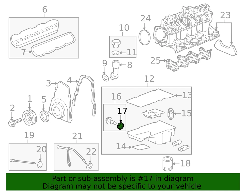 aaronchevrolet Genuine GM Engine Oil Pan Drain Plug Seal 12616850 Part can be found as # 17 in the diagram above Product Description This GM Genuine Part is designed, engineered, and tested to rigorous standards and is backed by General Motors Specifications Brand GM Manufacturer Part Number 12616850 SKU 12616850 Product Genuine GM Engine Oil Pan Drain Plug Seal 12616850 ONLY PART REFERENCE #17 ON THE DIAGRAM IS INCLUDED WARNING : May cause cancer and reproductive harm. See www.P65Warnings.ca.gov for more info. Terms and Conditions Thank you for shopping with us. Please find our policies below. If you have any other questions, please don't hesitate to contact us. Shipping Terms If you are located in Alaska, Hawaii or Puerto Rico Please contact us via eBay email to discuss shipping cost In stock orders ship within 24 hours. Weekend orders will be processed the next business day. If a part is not in stock and must be ordered from the manufacturer, it usually takes 2-3 days to arrive to us and will be promptly shipped to you. Most of the orders are shipped complete within 2-3 business days. A few of the parts ordered from the manufacturer may take up to 5-6 business days to arrive and will shipped to you immediately. Depending upon location, ground shipments usually take 2-7 days. Your order may be shipped Overnight for an additional cost. Oversized shipments will be additional; you will be contacted prior to shipping for approval. We cannot guarantee transit times for ground and oversize orders. Shipping Carrier substitutions may be made at our determination in an attempt to reduce shipping cost to the customer. We do not ship internationally. In the unlikely event that a part has been placed on backorder or discontinued, we will do our best to try and find one for you as quickly as possible. We do not ship COD orders. Return Policy Contact us to arrange for any returns. A copy of the invoice will need to be included with the return. Parts must be resaleable and in the original packaging. We cannot take back used parts. We cannot take back installed or tried parts. Electrical parts are not returnable. We do reserve the right to refuse and return any parts we find have been installed, are used or do not meet the above criteria. Return request need to be within 30 days of receipt. Cancellation Policy An order or a portion of an order may be cancelled up until the time it is shipped and no longer in our possession. Home • Newsletter Signup • Contact Us Copyright © 2024 aaronchevrolet , All rights reserved. Solution by RevolutionParts, Inc. :: Design by OCDesignsOnline