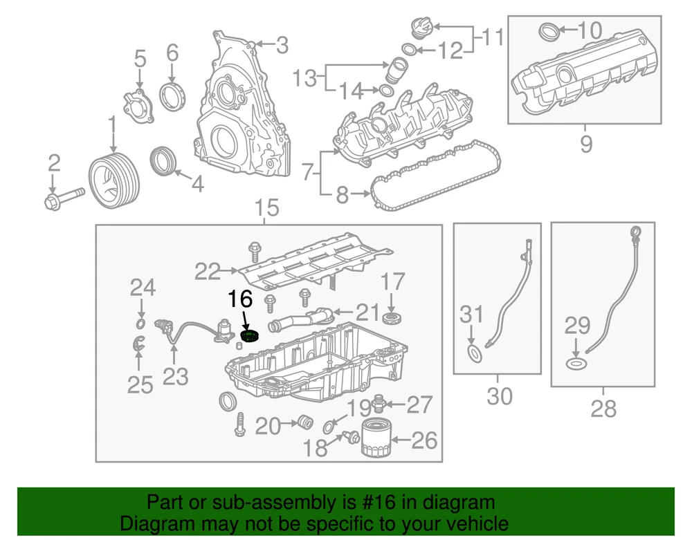 aaronchevrolet Genuine GM Front Oil Pan Seal 12666993 Part can be found as # 16 in the diagram above Product Description Small. Round Seal. Without dry sump system. Silverado, Sierra 2500 HD. Front port. Silverado, Sierra 3500 HD. This GM Genuine Part is designed, engineered, and tested to rigorous standards and is backed by General Motors Specifications Brand GM Manufacturer Part Number 12666993 SKU 12666993 Product Genuine GM Front Oil Pan Seal 12666993 Replaces 12622368 ONLY PART REFERENCE #16 ON THE DIAGRAM IS INCLUDED WARNING : May cause cancer and reproductive harm. See www.P65Warnings.ca.gov for more info. Terms and Conditions Thank you for shopping with us. Please find our policies below. If you have any other questions, please don't hesitate to contact us. Shipping Terms If you are located in Alaska, Hawaii or Puerto Rico Please contact us via eBay email to discuss shipping cost In stock orders ship within 24 hours. Weekend orders will be processed the next business day. If a part is not in stock and must be ordered from the manufacturer, it usually takes 2-3 days to arrive to us and will be promptly shipped to you. Most of the orders are shipped complete within 2-3 business days. A few of the parts ordered from the manufacturer may take up to 5-6 business days to arrive and will shipped to you immediately. Depending upon location, ground shipments usually take 2-7 days. Your order may be shipped Overnight for an additional cost. Oversized shipments will be additional; you will be contacted prior to shipping for approval. We cannot guarantee transit times for ground and oversize orders. Shipping Carrier substitutions may be made at our determination in an attempt to reduce shipping cost to the customer. We do not ship internationally. In the unlikely event that a part has been placed on backorder or discontinued, we will do our best to try and find one for you as quickly as possible. We do not ship COD orders. Return Policy Contact us to arrange for any returns. A copy of the invoice will need to be included with the return. Parts must be resaleable and in the original packaging. We cannot take back used parts. We cannot take back installed or tried parts. Electrical parts are not returnable. We do reserve the right to refuse and return any parts we find have been installed, are used or do not meet the above criteria. Return request need to be within 30 days of receipt. Cancellation Policy An order or a portion of an order may be cancelled up until the time it is shipped and no longer in our possession. Home • Newsletter Signup • Contact Us Copyright © 2025 aaronchevrolet , All rights reserved. Solution by RevolutionParts, Inc. :: Design by OCDesignsOnline