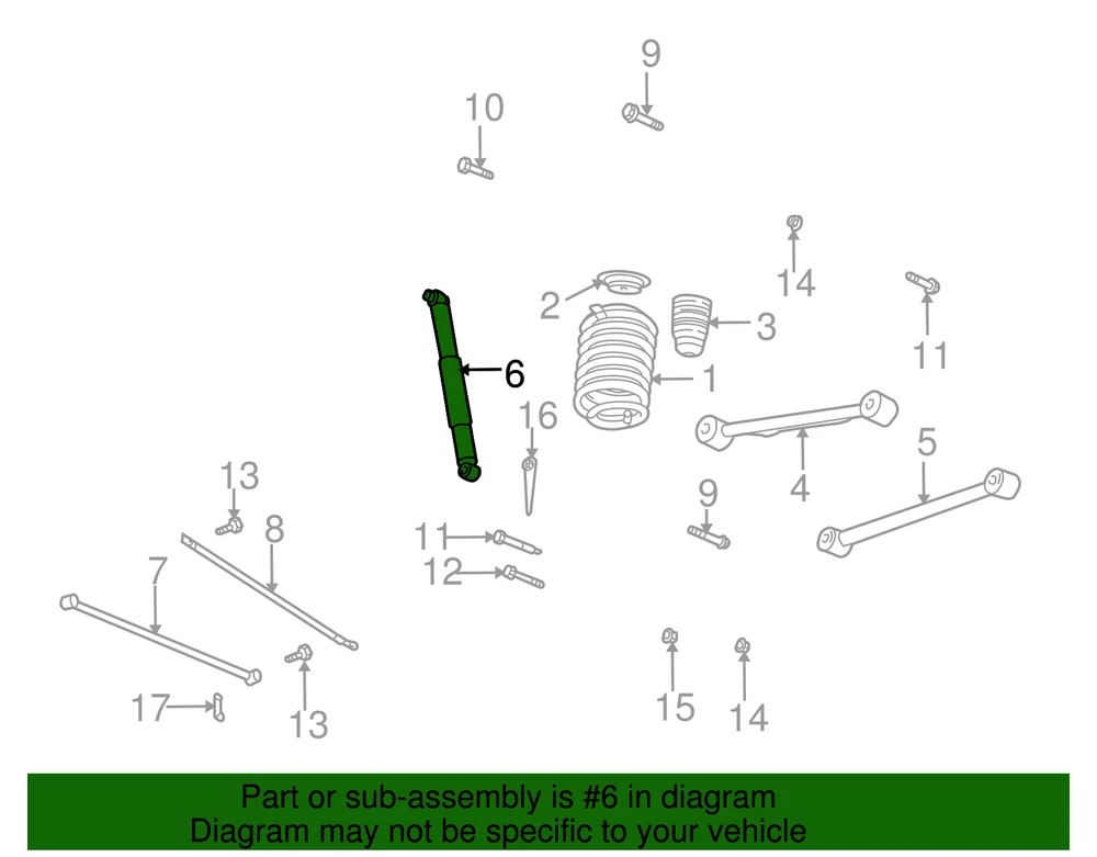 VRAY-GMC Genuine GM Shock Absorber 15058617 Part can be found as # 6 in the diagram above Product Description Bravada/Envoy/Trailblazer. With air suspension. With Envoy XUV. Specifications Brand GM Manufacturer Part Number 15058617 SKU 15058617 Product Genuine GM Shock Absorber 15058617 ONLY PART REFERENCE #6 ON THE DIAGRAM IS INCLUDED WARNING : May cause cancer and reproductive harm. See www.P65Warnings.ca.gov for more info. Terms and Conditions Thank you for shopping with us. Please find our policies below. If you have any other questions, please don't hesitate to contact us. Shipping Terms In stock orders ship within 24 hours. Weekend orders will be processed the next business day. If a part is not in stock and must be ordered from the manufacturer, it usually takes 2-3 days to arrive to us and will be promptly shipped to you. Most of the orders are shipped complete within 2-3 business days. A few of the parts ordered from the manufacturer may take up to 5-6 business days to arrive and will shipped to you immediately. Depending upon location, ground shipments usually take 2-7 days. Your order may be shipped Overnight for an additional cost. Oversized shipments will be additional; you will be contacted prior to shipping for approval. We cannot guarantee transit times for ground and oversize orders. Shipping Carrier substitutions may be made at our determination in an attempt to reduce shipping cost to the customer. We do not ship internationally. In the unlikely event that a part has been placed on backorder or discontinued, we will do our best to try and find one for you as quickly as possible. We do not ship COD orders. Return Policy Contact us to arrange for any returns. A copy of the invoice will need to be included with the return. Parts must be resaleable and in the original packaging. We cannot take back used parts. We cannot take back installed or tried parts. Electrical parts are not returnable. We do reserve the right to refuse and return any parts we find have been installed, are used or do not meet the above criteria. Return request need to be within 30 days of receipt. Cancellation Policy An order or a portion of an order may be cancelled up until the time it is shipped and no longer in our possession. Home • Newsletter Signup • Contact Us Copyright © 2025 VRAY-GMC , All rights reserved. Solution by RevolutionParts, Inc. :: Design by OCDesignsOnline