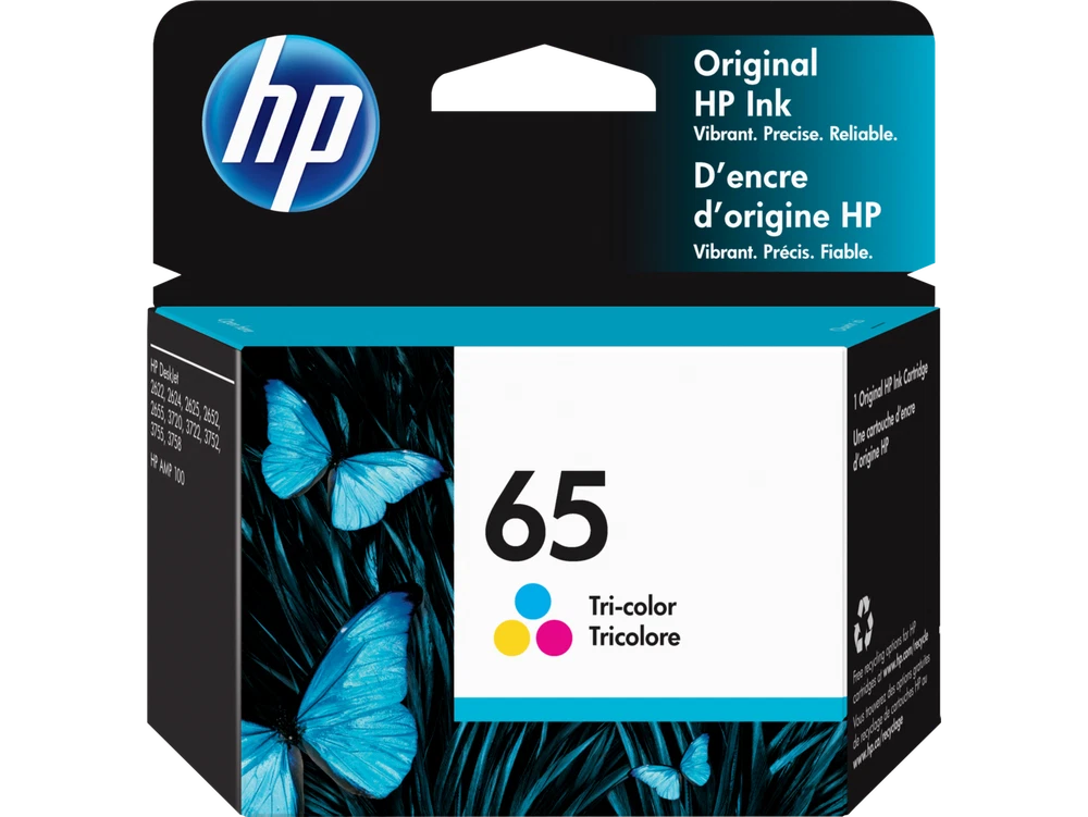 Color: Black, Cyan, Magenta, Yellow, Tri-Color MPN: N9K04AN, N9K03AN Seller Notes: “This is a brand new Genuine HP 65 Black Tri-Color ink cartridge in bulk packaging” Model: HP 65 Compatible Brand: For HP Chip: with chip Compatible Model: For HP AMP 100 120 125 130, For HP DeskJet 2600 2620 2621 2622 2623 2624, For HP DeskJet 2630 2632 2634 2635 2636 2652 2655, For HP DeskJet 3721 3722 3723 3730 3732 3733 3735, For HP DeskJet 3750 3752 3755 3758 3760 3762 3764, For HP ENVY 5000 5010 5012 5014 5020 5030 5032 5034, For HP DeskJet 3720 ENVY 5052 5055 5058 Print Technology: Inkjet Brand: HP Manufacturer Warranty: 3 Years Type: Genuine/Original