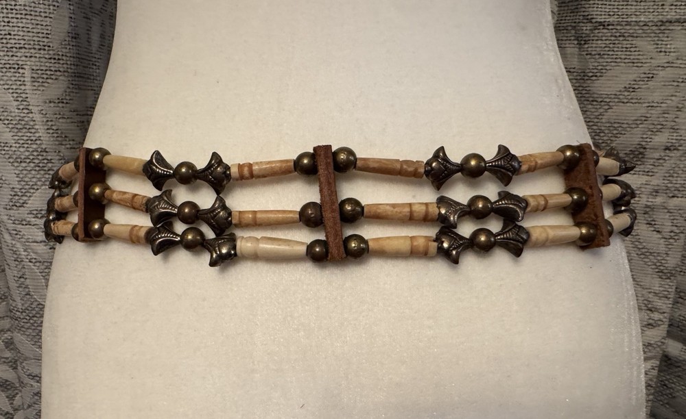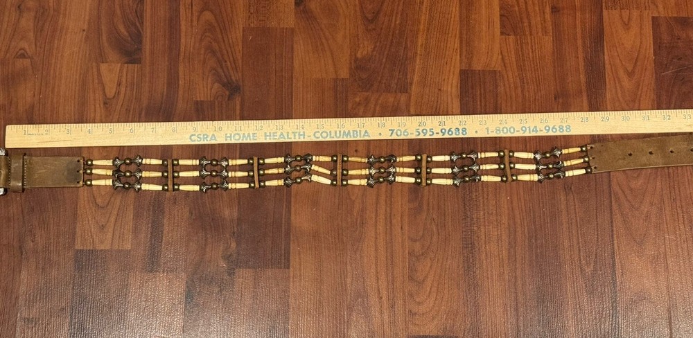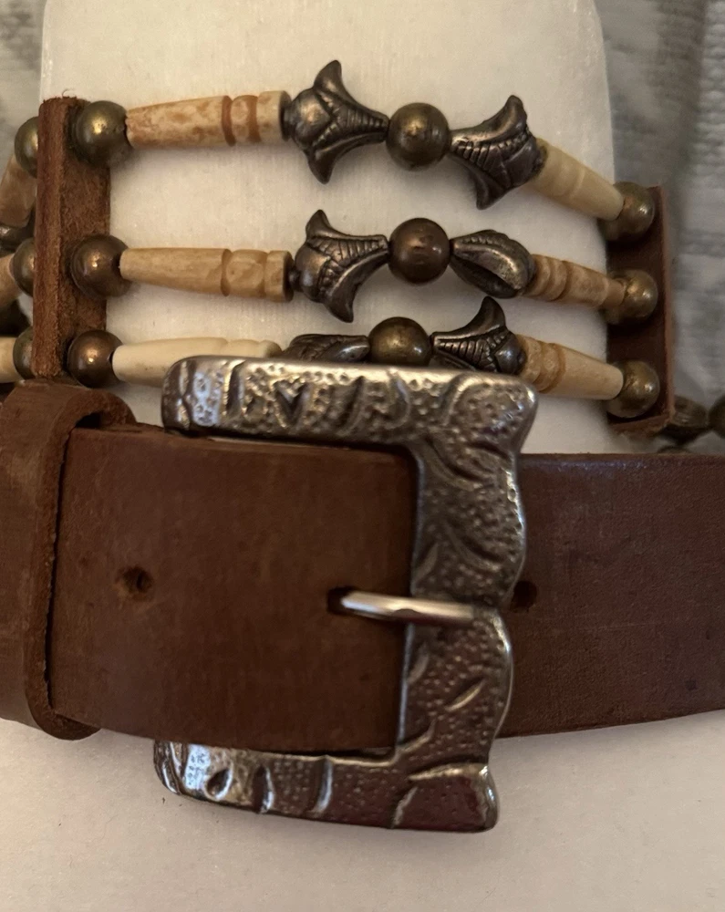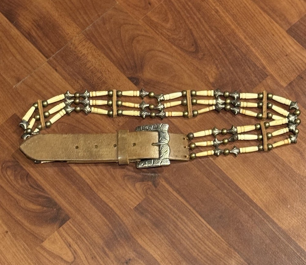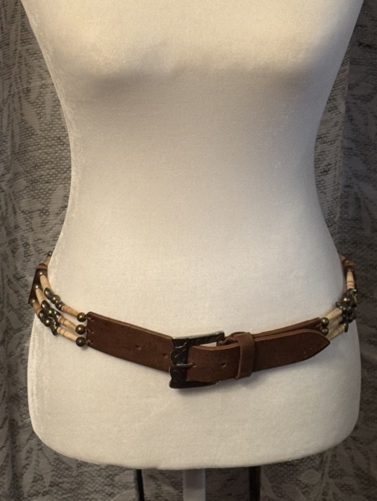 Condition: Excellent pre-owned. Signs of normal to light use. Coming from a smoke-free home. This Genuine Leather Beaded Belt is a stylish accessory for women, featuring a Southwestern design made in India. The belt is crafted from high-quality leather with metal and bead accents, adding a touch of bohemian flair. The adjustable buckle and brass hardware make it convenient to wear, while the vintage style gives it a unique charm. Perfect for adding a Western-inspired touch to your outfit, this belt is a versatile piece that can elevate any ensemble.