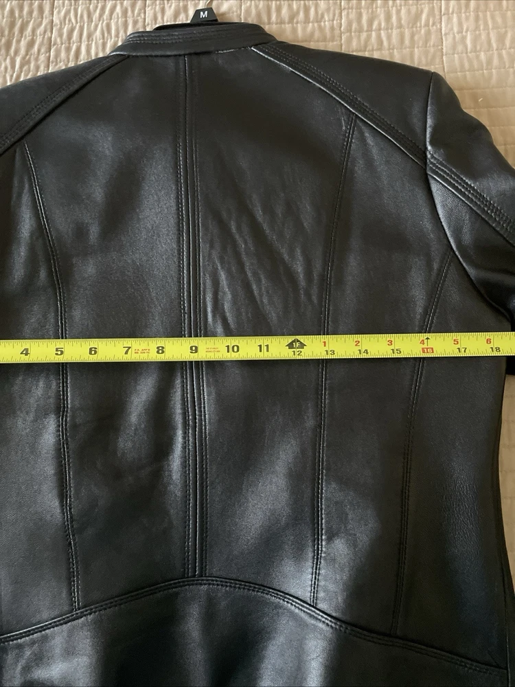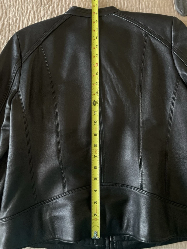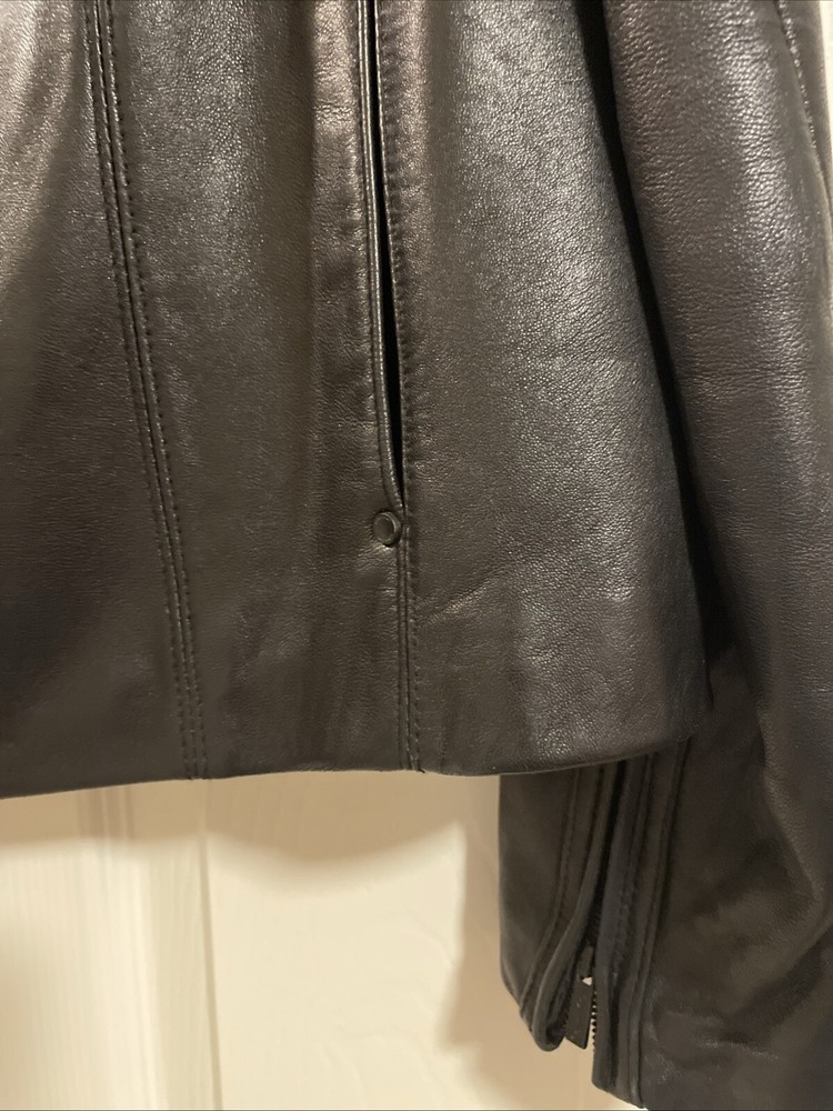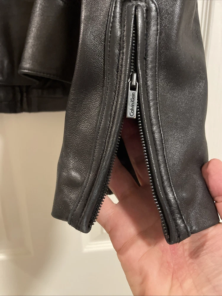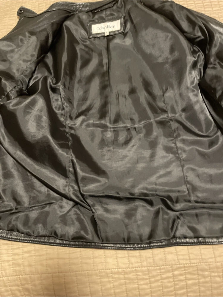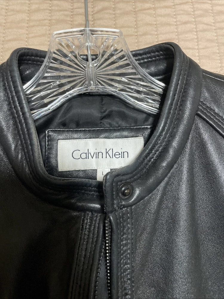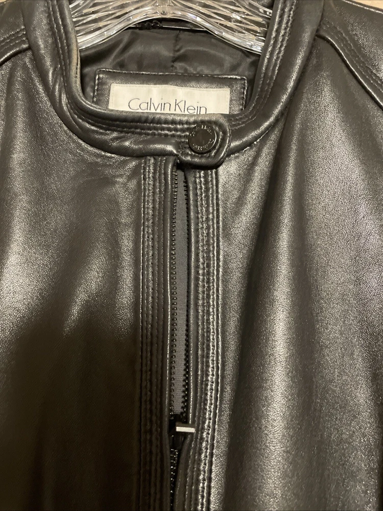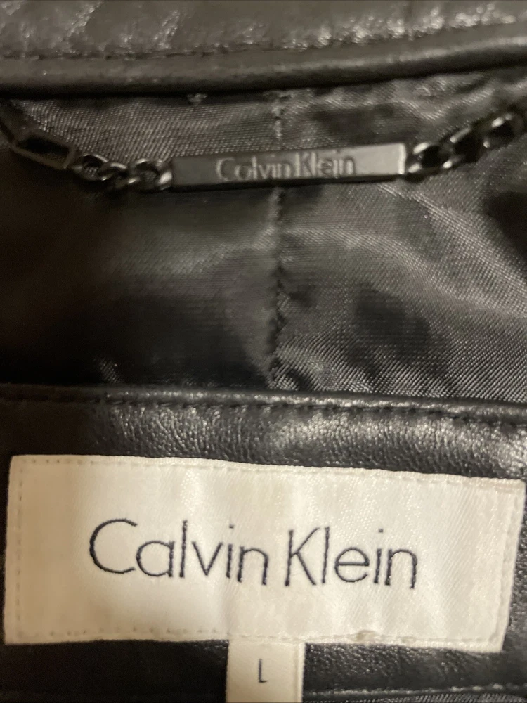 Upgrade your wardrobe with this stylish and versatile Calvin Klein jacket. Made from 100% genuine leather, this black zip-up jacket is perfect for travel, business, or casual occasions. The jacket features two side pockets, a full zip closure, and 2 inner pockets for added convenience. The classic style makes this jacket a timeless addition to your wardrobe. Available in size L, this regular fit jacket is suitable for women who want to look fashionable and feel comfortable. Pit-to-pit measurements 18 inches. Length 22 inches ( measured in the center of the back top to bottom). Pre loved excellent condition.
