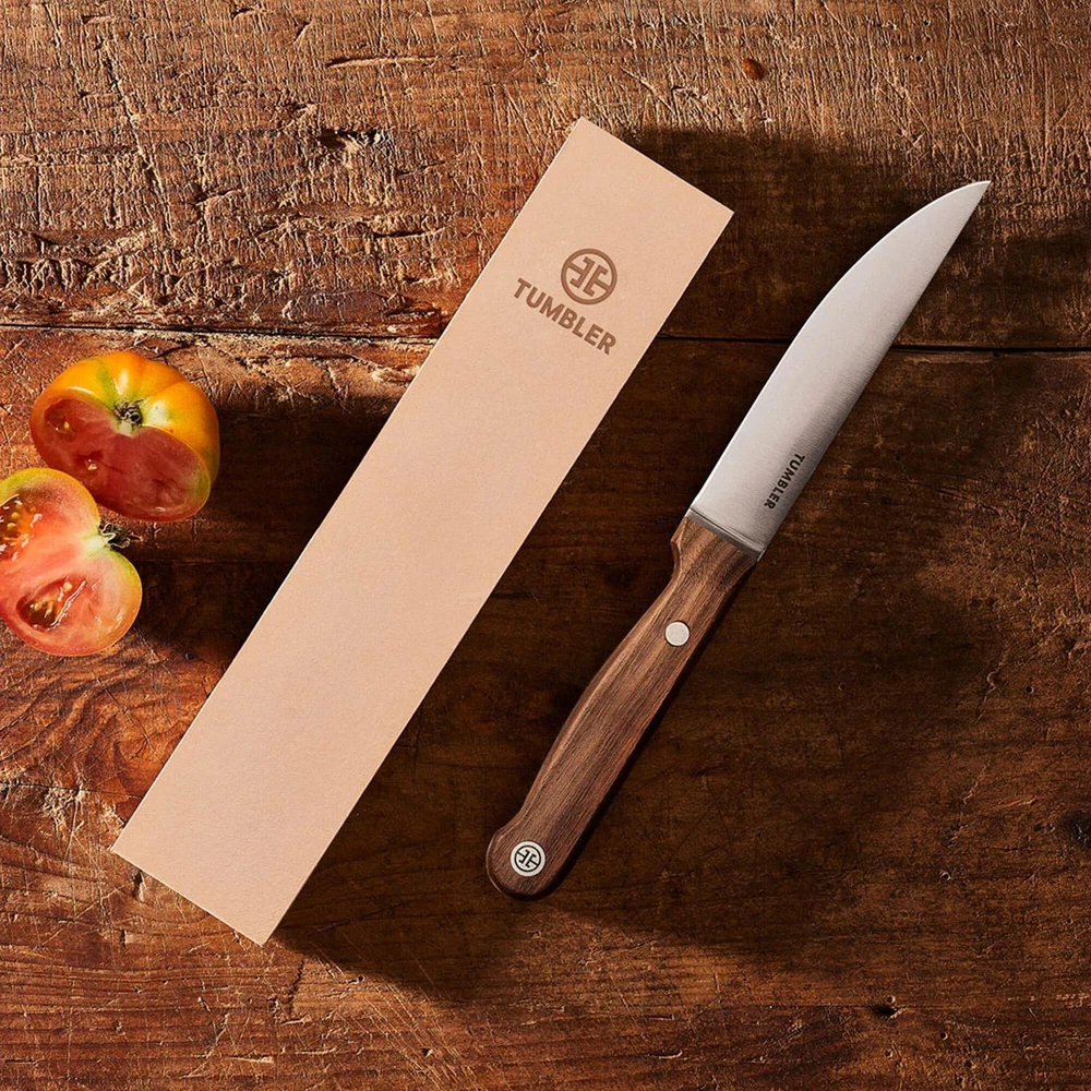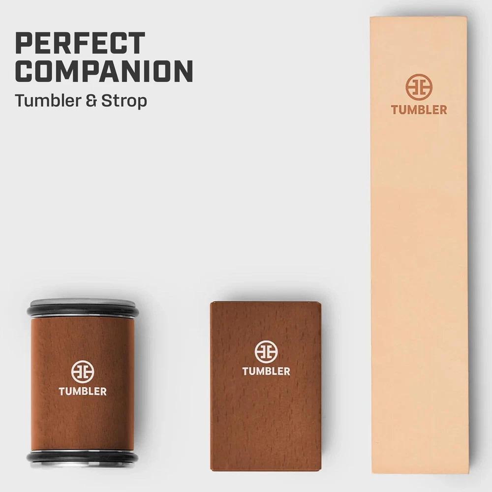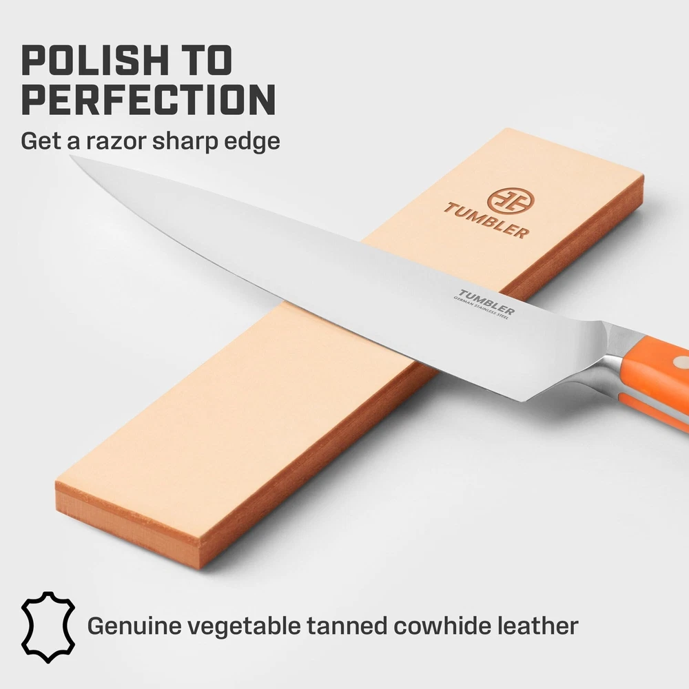 Genuine Leather Knife Sharpening Strop - Companion for Tumbler Knife Sharpener Kits Product Details Material: Solid Beech Wood, Stainless Steel, Diamond Plated, Magnetic Holder Brand: TUMBLER Color: Brown Product Dimensions: 9.8"L x 2.2"W x 0.6"H Item Weight: 4.8 ounces Grit Type: Fine UPC Material: Solid Beech Wood, Stainless Steel, Diamond Plated, Magnetic Holder Brand: TUMBLER Color: Brown Product Dimensions: 9.8"L x 2.2"W x 0.6"H Item Weight: 4.8 ounces Grit Type: Fine UPC: 196852906031 Country of Origin: China Date First Available: August 24, 2023 Polish Your Blade: Polish to perfection and make your knifes edge as sharp as possible with our knife sharpening strop. The final step in the sharpening process. A Powerful Duo: Pair the leather strop with the Tumbler Rolling Knife Sharpener to keep every knife in your drawer as sharp as possible. Genuine Tanned Cowhide Leather: Made of solid beech wood and vegetable tanned cowhide leather, the strop is a vital accessory for any cook who demands the most out of their knives. A Must for Precision Cuts: Stropping your knife realigns the cutting edge, removes leftover metal & helps you achieve paper thin cuts of meat, vegetables and fish. Great for Gifting: Tumbler knife sharpening accessories are the perfect gift for chefs who take their knives seriously. Search "Tumbler Knife Sharpener" to see our full assortment.