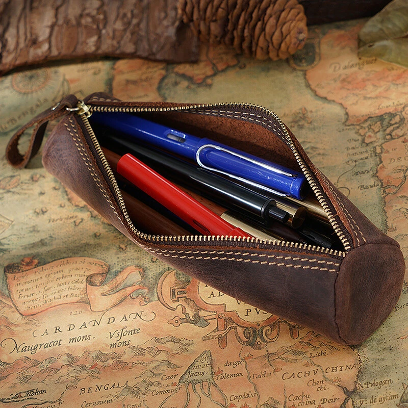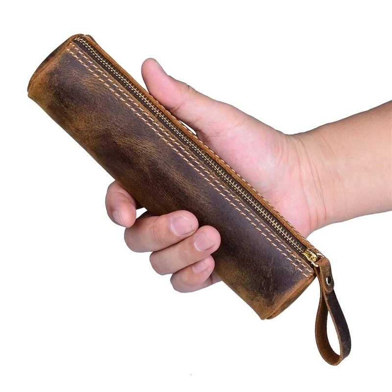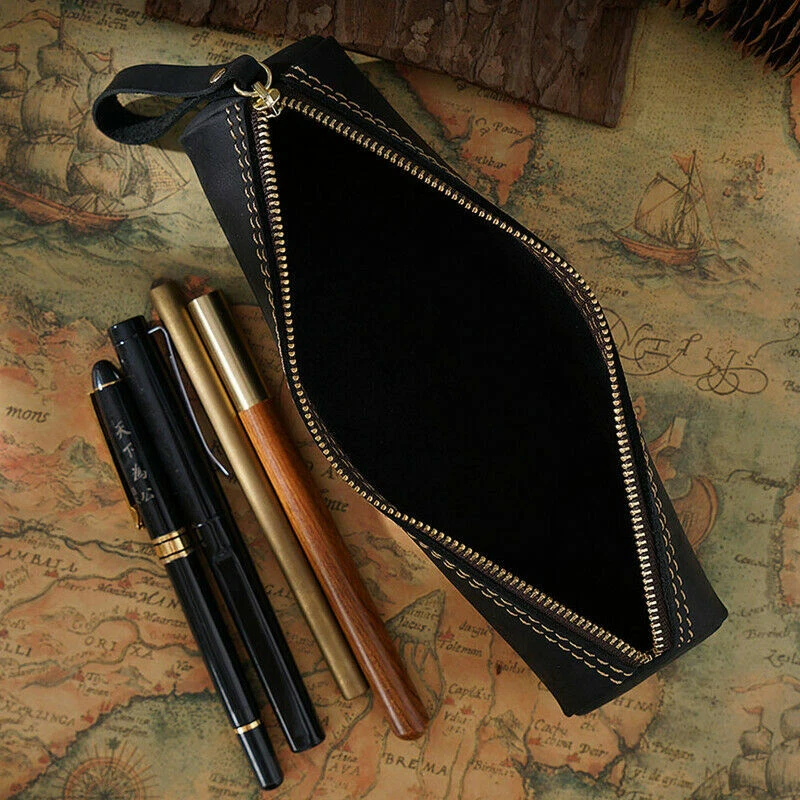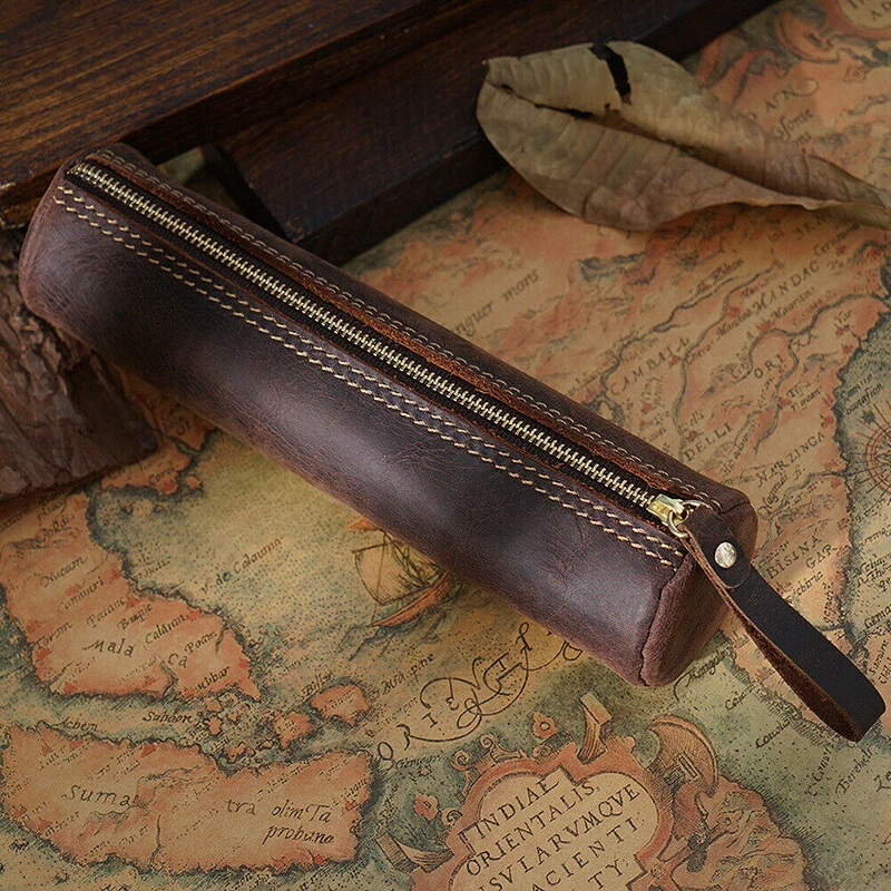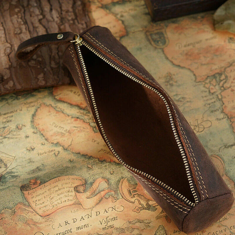 Genuine Leather Pen Pencil Case Office School Stationery Pen Storage Bag Holder